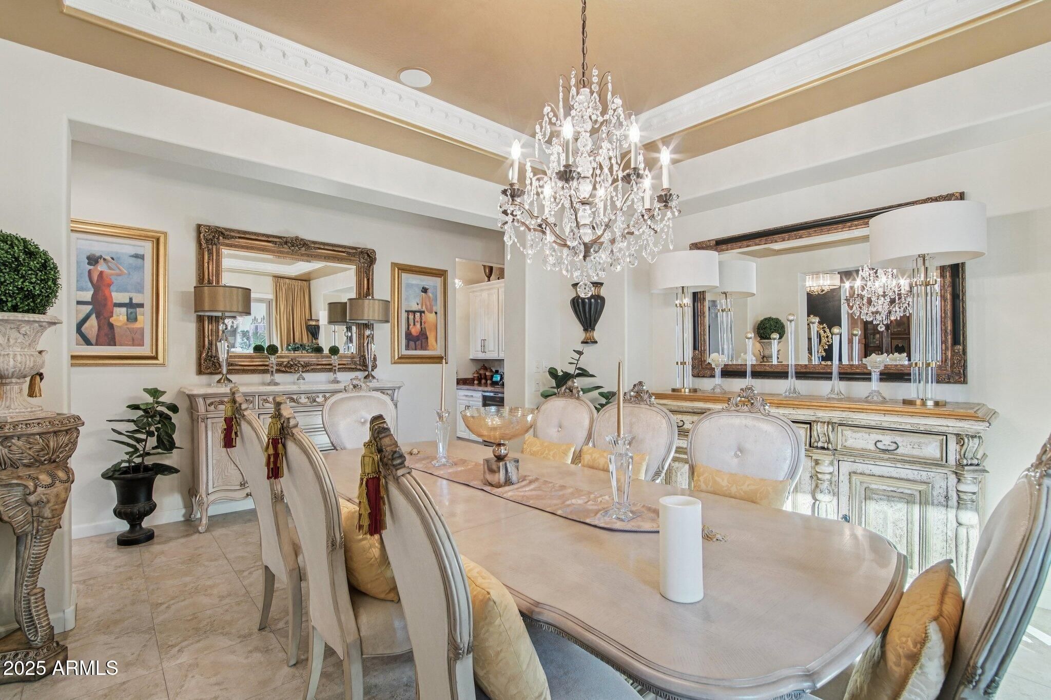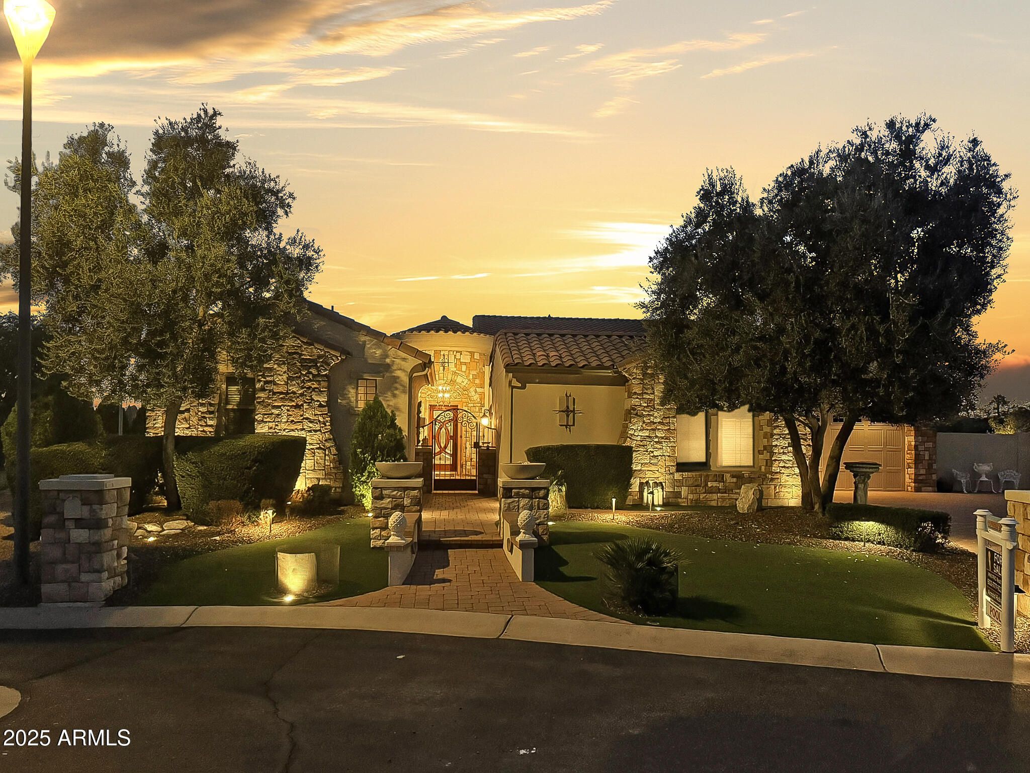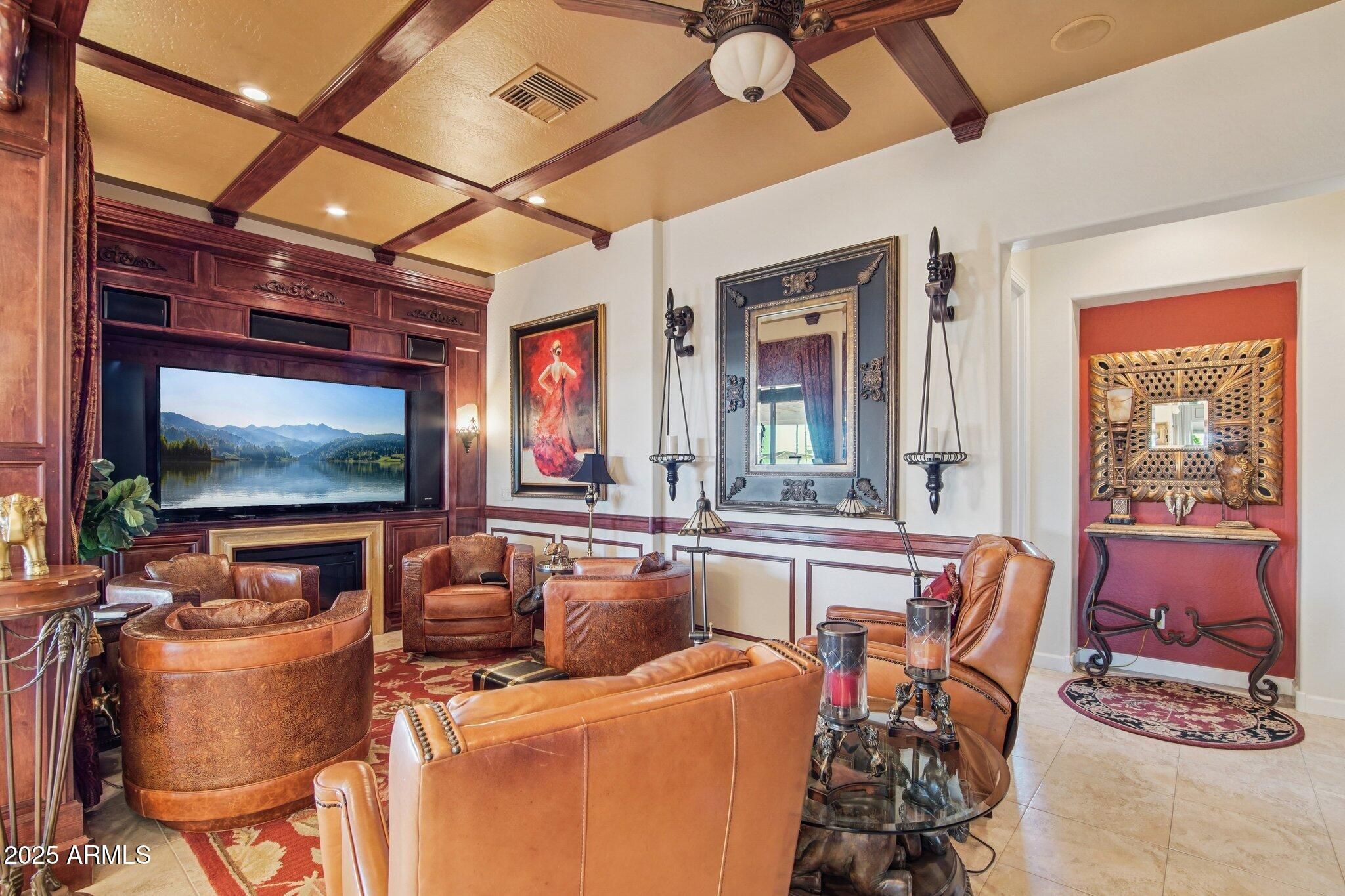 This exquisitely designed home, set on a sprawling private lot, is a true entertainer's paradise, offering breathtaking mountain, water, and golf course views. From the moment you arrive, you're greeted by a charming front courtyard and a covered patio with 5 cozy gas fireplaces, setting the tone for the luxurious experience inside. Step through the door, and you'll immediately notice the attention to detail and high-end finishes that elevate every space. With an open-concept floor plan, the home features multiple gathering areas, making it perfect for both intimate evenings and grand celebrations. The impressive great room is a showstopper, complete with theater-style lighting, crown molding, and a custom entertainment center that houses an 80-inch TV, an electric fireplace, and a state-of-the-art 6.1 surround sound system. For those who enjoy a more social setting, the unique pub room is a standout. With its electric fireplace, large screen TV, beamed ceilings, and walk-up bar, it's a space that effortlessly combines comfort and style. The office/game room is equally as stunning, with its maple wood-beamed ceilings and matching walls, complemented by built-in bookshelves that add warmth and character. This home is filled with thoughtful upgrades and features too numerous to mention, all of which come together to create a space that's truly worthy of a magazine cover!