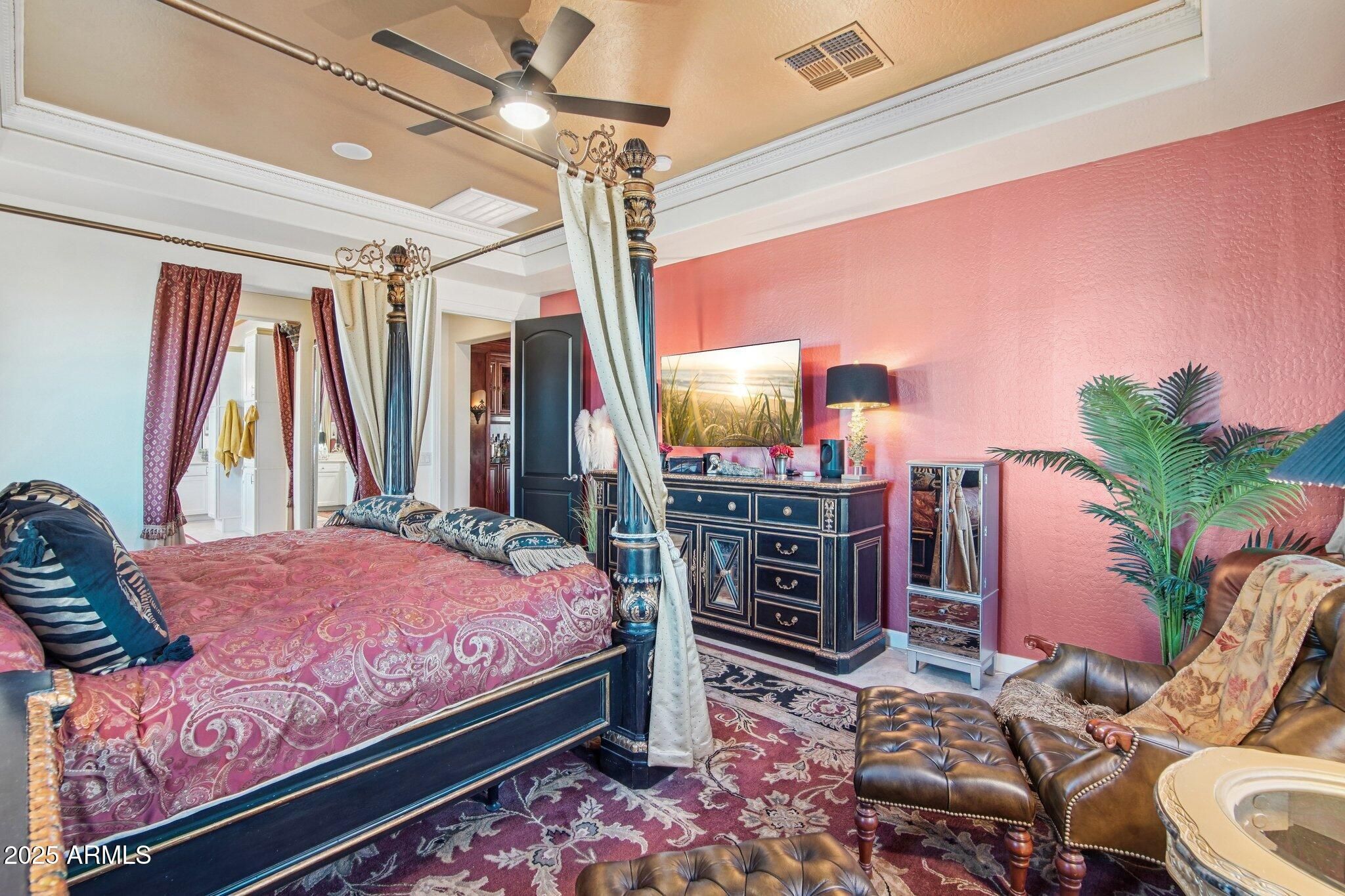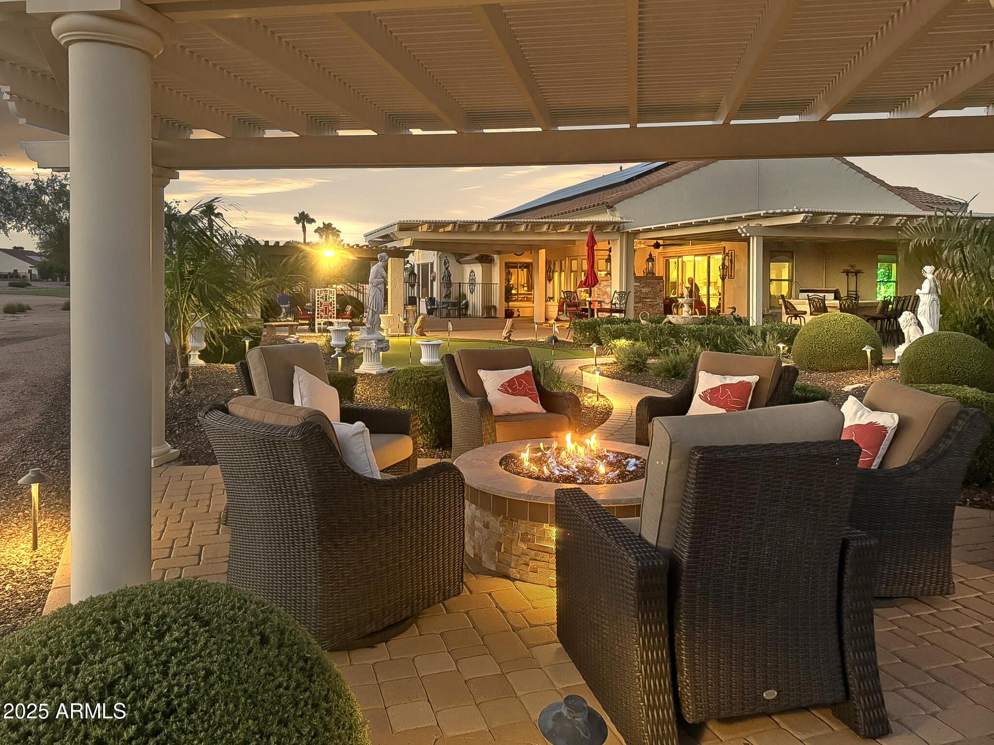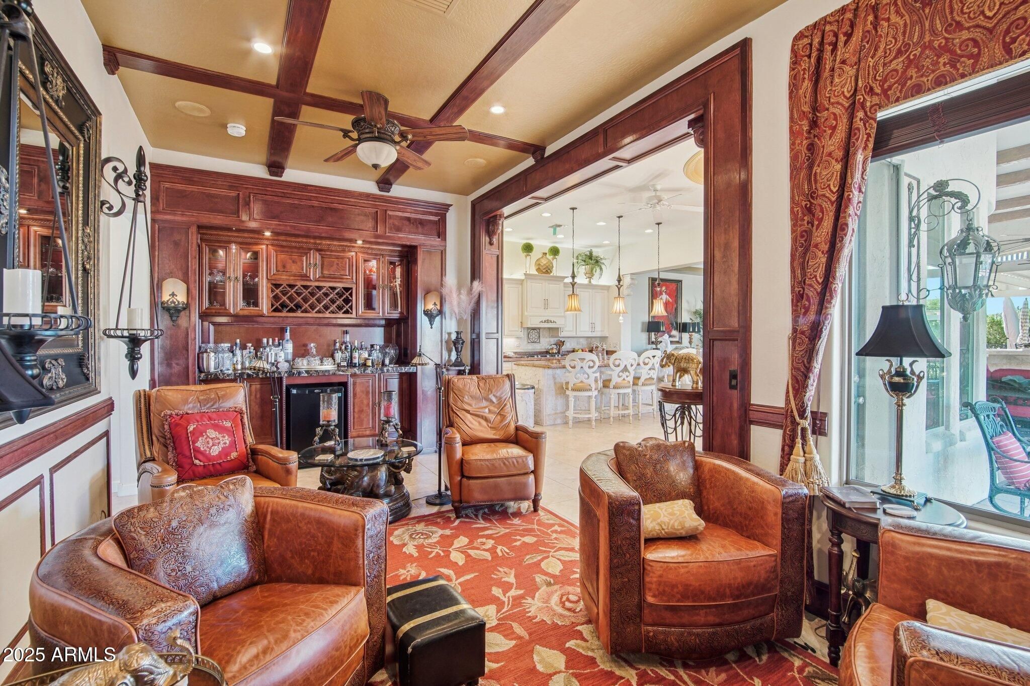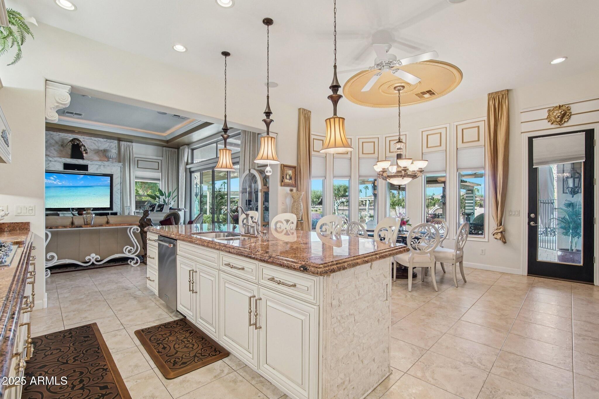 This exquisitely designed home, set on a sprawling private lot, is a true entertainer's paradise, offering breathtaking mountain, water, and golf course views. From the moment you arrive, you're greeted by a charming front courtyard and a covered patio with 5 cozy gas fireplaces, setting the tone for the luxurious experience inside. Step through the door, and you'll immediately notice the attention to detail and high-end finishes that elevate every space. With an open-concept floor plan, the home features multiple gathering areas, making it perfect for both intimate evenings and grand celebrations. The impressive great room is a showstopper, complete with theater-style lighting, crown molding, and a custom entertainment center that houses an 80-inch TV, an electric fireplace, and a state-of-the-art 6.1 surround sound system. For those who enjoy a more social setting, the unique pub room is a standout. With its electric fireplace, large screen TV, beamed ceilings, and walk-up bar, it's a space that effortlessly combines comfort and style. The office/game room is equally as stunning, with its maple wood-beamed ceilings and matching walls, complemented by built-in bookshelves that add warmth and character. This home is filled with thoughtful upgrades and features too numerous to mention, all of which come together to create a space that's truly worthy of a magazine cover!