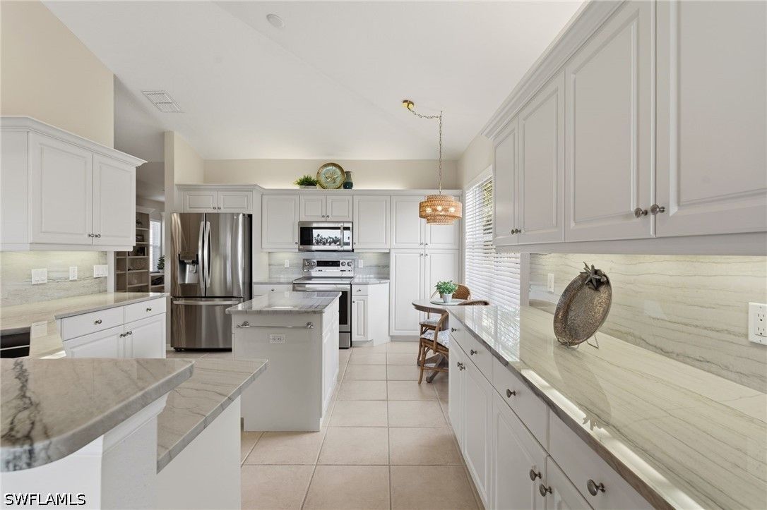 Experience style and modern comfort in this impeccably maintained 3-bedroom, 2-bath condo with an attached garage, perfectly situated within the popular Sabal Palm community at Grandezza Country Club. Blending traditional warmth with contemporary finishes, this home offers an inviting atmosphere enhanced by serene water and golf course views! An open-concept layout creates effortless flow throughout the main living spaces, where abundant natural light and tranquil outdoor vista set a relaxing tone. The well appointed eat-in-kitchen anchors the home with modern cabinetry, quartz countertops, updated appliances, and generous counter space - ideal for the chef in the family. The spacious primary suite provides a peaceful retreat with beautiful water and sunset views, while the additional bedrooms offer comfort and flexibility for guests or a home office. Step onto the screened lanai to enjoy a quiet morning coffee or entertain with a backdrop of shimmering water and rolling fairways. This maintenance free home is further enhanced by electric hurricane shutters, an updated roof, newer A/C and newer water heater, offering peace of mind and easy living. Grandezza Country Club offers 18-hole Championship golf, tennis courts, fitness/wellness center, Olympic size pool, cabana, casual/fine dining and many social events and amenities. Close to I-75, SWFL International Airport, shopping and restaurants, makes this home an ideal location in rapidly growing Estero, FL