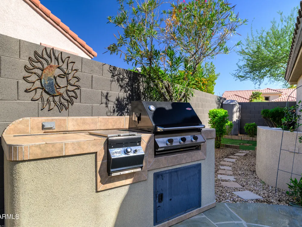 Rare Two Bedroom with Den Home in the Stunning Community Of Sun City Grand! This Lovely House boasts a Custom Kitchen with Highly Upgraded Cabinetry, Top of the Line Granite Counters, Gas Range with Convection Oven, Under Cabinet Built In Microwave, Sweet Custom Buffet Cabinet, Stainless Steel Appliances, All Drawer Base Cabinets for easy access. Both Baths have been upgraded with Granite Counters and Glass Sinks. Office includes Extended Desk with Floating Shelves. Bedroom 2 has a Twin Murphy Bed with Built In Dresser and Lighted Glass Shelves. Primary Space has Two Walk In Closets. Indoor Laundry with Cabinets. Washer and Dryer Included. Garage has Built In Cabinets, Epoxy Floor. Fresh Interior Paint. Owned Solar. Backyard Oasis with Water Fountain, Fire Bowl, Built In BBQ. MoveIn Ready