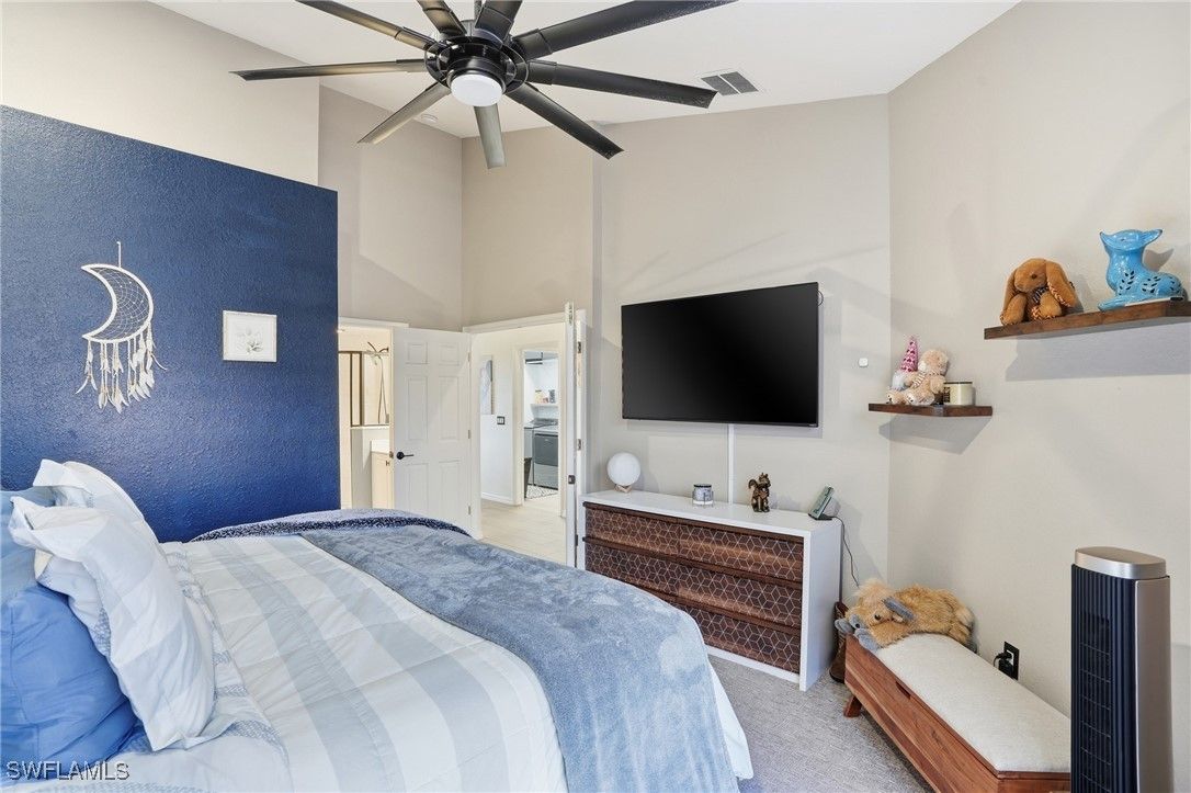 This stunning 3-bedroom, 2-bath condominium with a one-car garage offers 1,920 square feet of living space beneath soaring vaulted ceilings, ideally located in the desirable Sabal Palm neighborhood of Grandézza. The open and airy great room provides ample space for both living and dining, featuring wide-plank ceramic tile flooring and oversized sliding glass doors that open to a spacious western-facing lanai with serene lake and golf course views—an ideal setting to enjoy breathtaking Florida sunsets. The adjacent kitchen is thoughtfully designed with white shaker cabinetry, quartz countertops, a breakfast bar, and a full suite of stainless steel appliances. A charming and sun-filled breakfast nook with a bay window offers additional seating and direct access to the lanai, perfect for casual mornings or evening relaxation. The generous primary suite serves as a private retreat, complete with a large walk-in closet with custom built-in cabinetry and an en-suite bath featuring dual vanities and an expansive walk-in shower with multiple shower heads. Two additional well-sized bedrooms and a beautifully appointed guest bath complete the interior. Privately owned and managed, Grandézza offers a variety of membership options to suit diverse lifestyle preferences and an exceptional array of amenities. At the heart of the community is the elegant Tuscan-style clubhouse, featuring multiple dining and lounge venues, along with the brand-new Cabana Bar overlooking the luxurious junior Olympic-size pool.