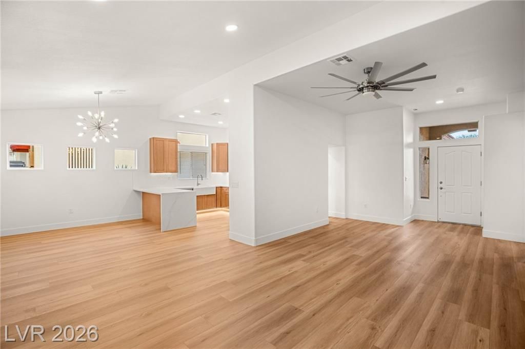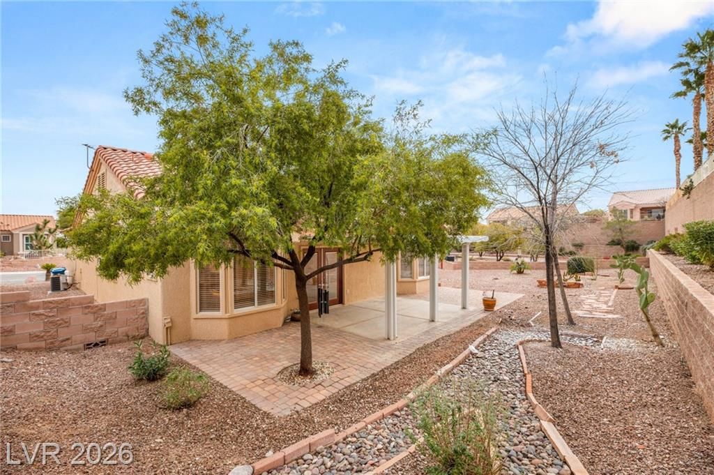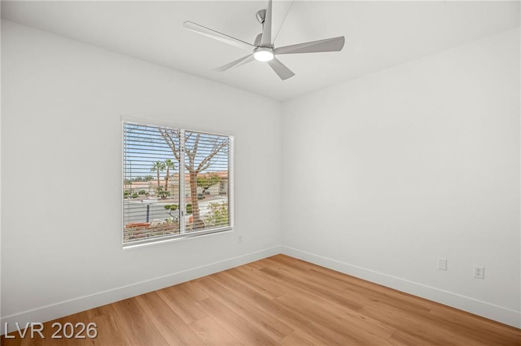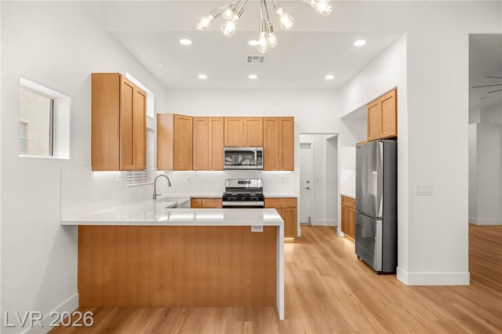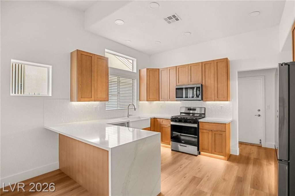 This beautifully updated Sun City Summerlin home has an open floor plan with luxury wood-laminate flooring throughout. The kitchen features stainless appliances, abundant cabinets with 42” uppers and under-cabinet lighting and a convenient breakfast bar. The spacious dining area is accented with a modern light fixture and the living room has a ceiling fan and French doors that open to the back. The primary suite includes a bay window and ceiling fan, while the ensuite bath showcases an oversized custom shower. The secondary bath has also been updated with modern tub/shower, and both bathrooms feature sleek LED vanity lighting. Outside there is an oversized backyard with a covered patio plus an additional patio area—perfect for relaxing or entertaining. Even the garage impresses, offering golf cart parking, sealed floor and generous storage. Sun City residents enjoy exceptional amenities including golf courses, pickleball, tennis, fitness centers, billiards, pools, spas and much more.