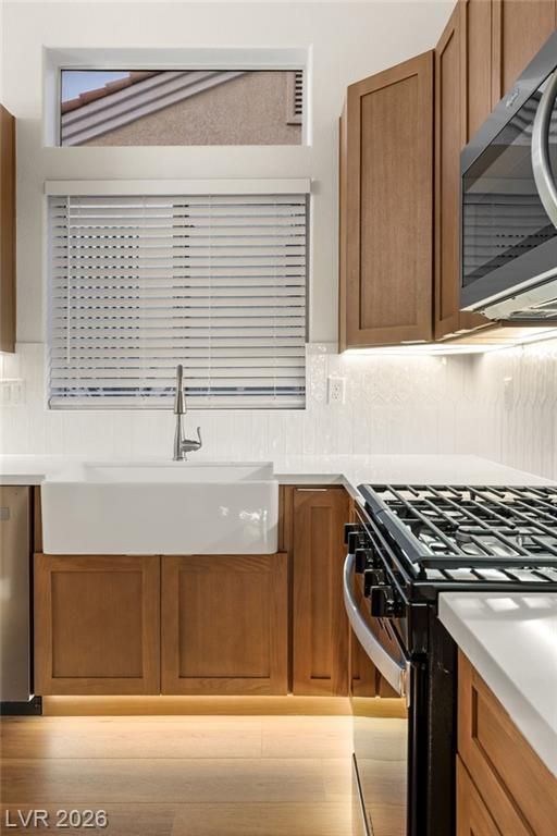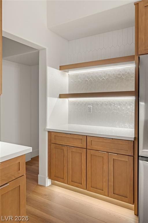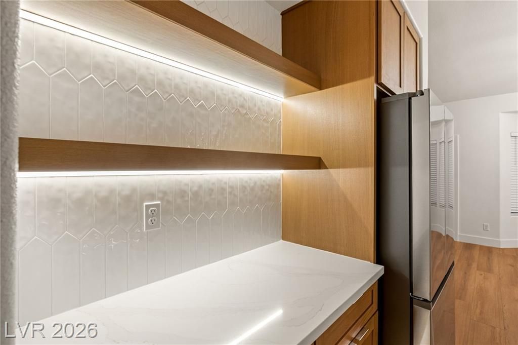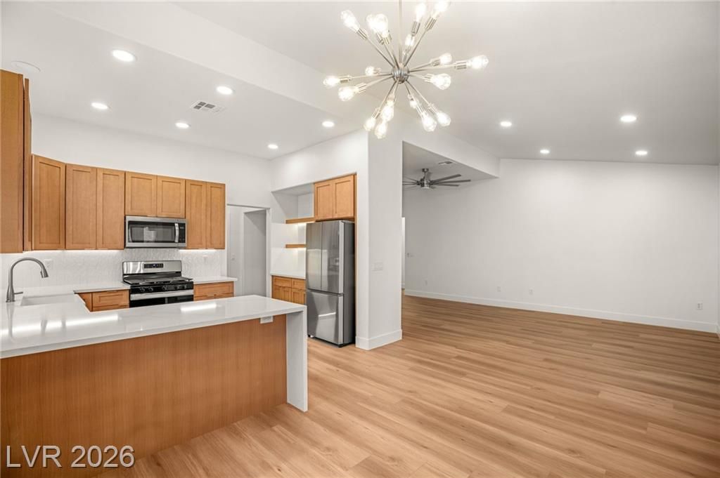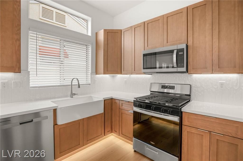 This beautifully updated Sun City Summerlin home has an open floor plan with luxury wood-laminate flooring throughout. The kitchen features stainless appliances, abundant cabinets with 42” uppers and under-cabinet lighting and a convenient breakfast bar. The spacious dining area is accented with a modern light fixture and the living room has a ceiling fan and French doors that open to the back. The primary suite includes a bay window and ceiling fan, while the ensuite bath showcases an oversized custom shower. The secondary bath has also been updated with modern tub/shower, and both bathrooms feature sleek LED vanity lighting. Outside there is an oversized backyard with a covered patio plus an additional patio area—perfect for relaxing or entertaining. Even the garage impresses, offering golf cart parking, sealed floor and generous storage. Sun City residents enjoy exceptional amenities including golf courses, pickleball, tennis, fitness centers, billiards, pools, spas and much more.