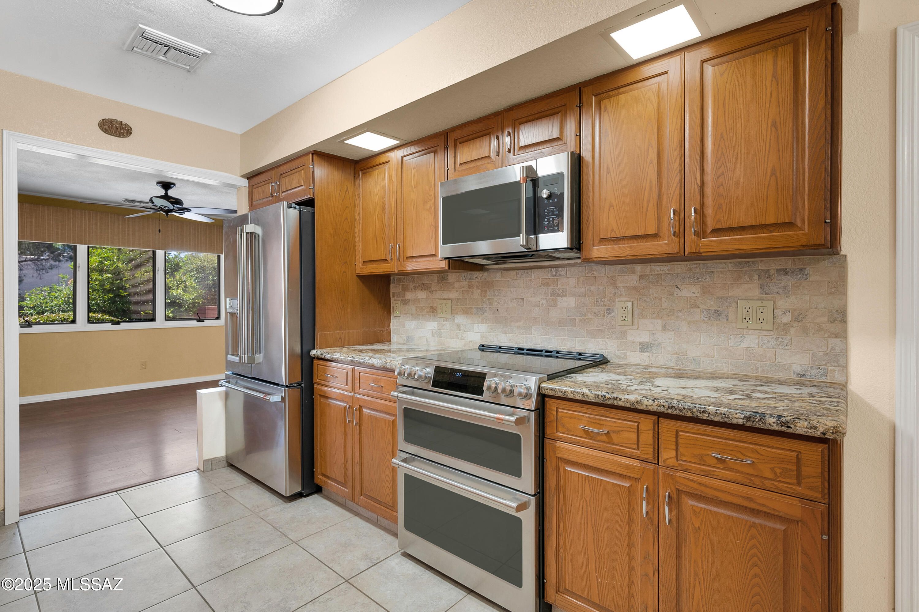 Nestled in a peaceful neighborhood just minutes from shopping, dining, and everyday conveniences, this thoughtfully upgraded residence offers the perfect combination of comfort, efficiency, and active adult living. As a member of Green Valley Recreation (GVR), you'll enjoy access to a wide array of clubs, social activities, fitness facilities, and pickleball courts--perfect for those seeking a vibrant lifestyle in Arizona's ideal year-round climate. From the moment you step inside, you'll appreciate the many tasteful upgrades and improvements that set this home apart. Popcorn ceilings have been removed for a more modern look, while newer ceiling fans in the living and dining areas enhance airflow and comfort. The kitchen features granite countertops, updated tile flooring, and a