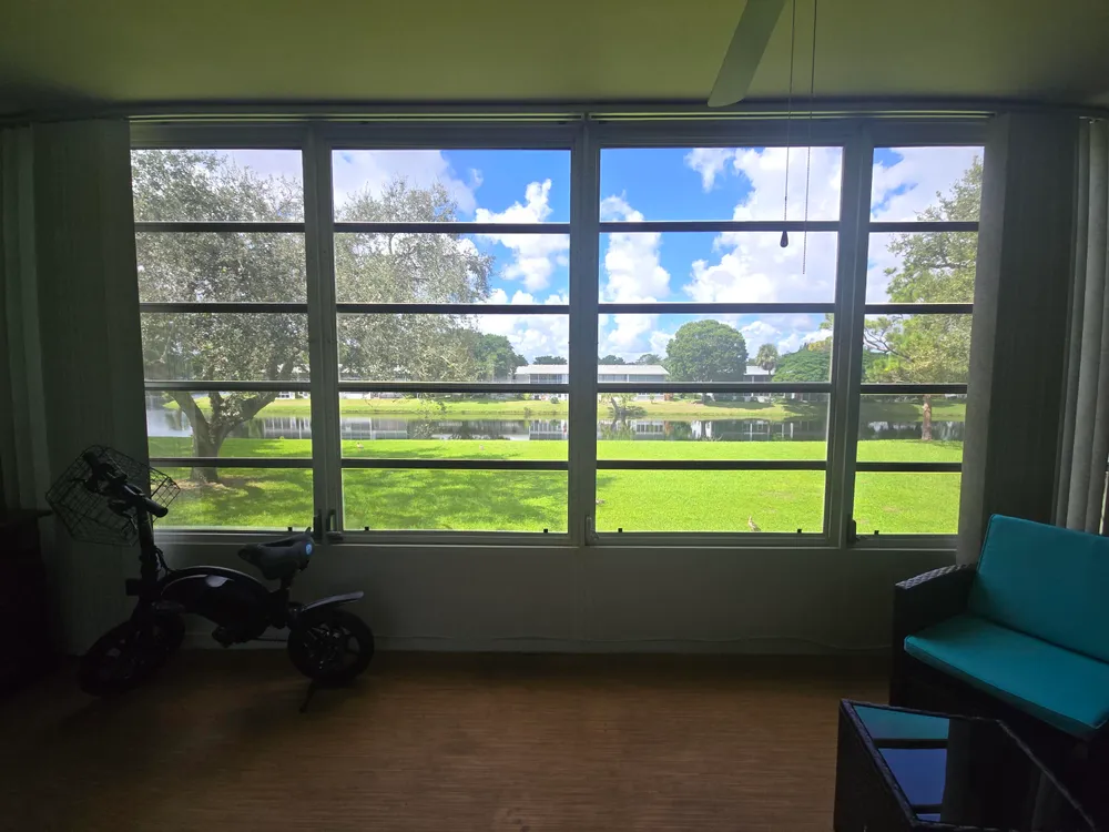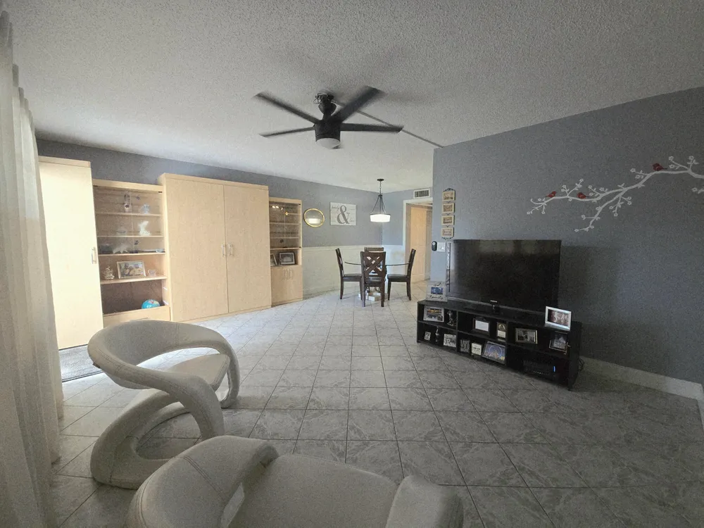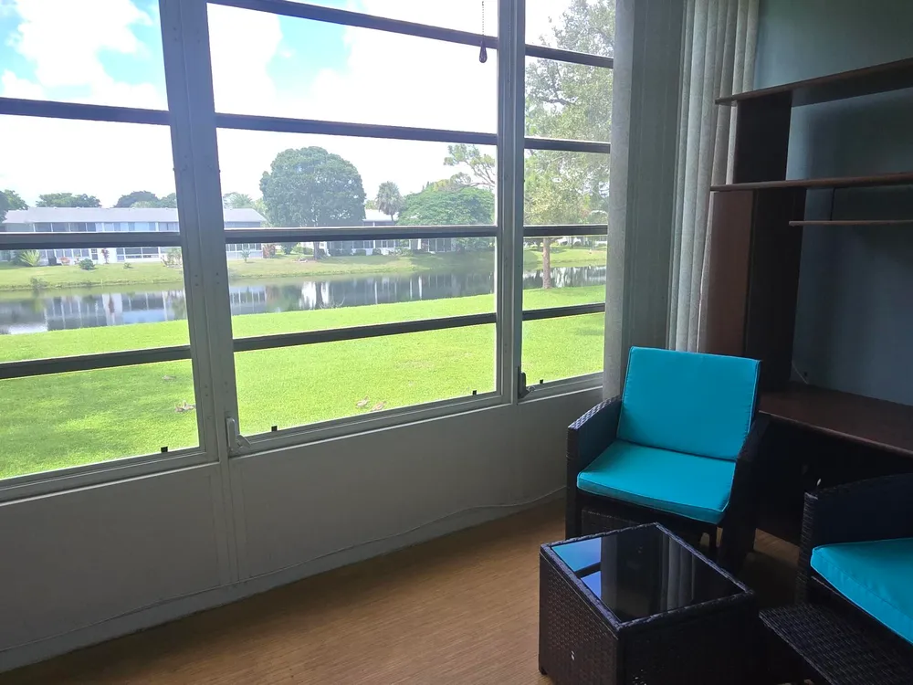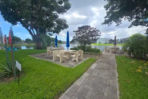 Don't miss the chance to own this lovely condo in Century Village. All tile,1 bedroom, 1- 1/2 bath with an oversized bedroom. The updated kitchen features, rich wood cabinets and granite countertops. A convenient Murphy bed is perfect for visiting guests. Recent upgrades include an updated electric panel, 2017 AC, tankless water heater in 2022, plus a new refrigerator and dishwasher in 2022. Relax and enjoy the water view from your private enclosed patio with beautiful laminate flooring. The building also provides a patio by the lake, ideal for peaceful Florida evenings. Century Village offers resort-style living with endless activities, clubs, transportation services, and much more.