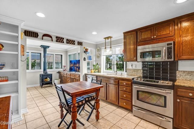 Must see this lovely home that has been beautifully maintained with a great location backing to sprawling greenbelts and is located in the popular 55+ senior community of Leisure Village. The inviting and spacious living room has vaulted ceilings, laminate wood like flooring, and a custom built-in entertainment center with fireplace. Kitchen has stainless steel appliances, upgraded countertops and opens to the enclosed patio room. The patio room is a perfect spot to relax and enjoy a cup of coffee with window views to the outdoors. Take in a little sunshine in the charming outdoor brick patio. Two spacious bedrooms and two updated bathrooms. Dual pane windows. Refrigerator, washer and dryer included. A guard gated community with a resort like lifestyle with golf, tennis, pickleball, Bocce Ball, swimming, fitness room, billiards, walking & bicycle paths and more. Enjoy social gatherings, Bingo, fitness classes, hobby clubs, card & music clubs, Village Theater, and live entertainment. Conveniently located to shopping, dining and freeway