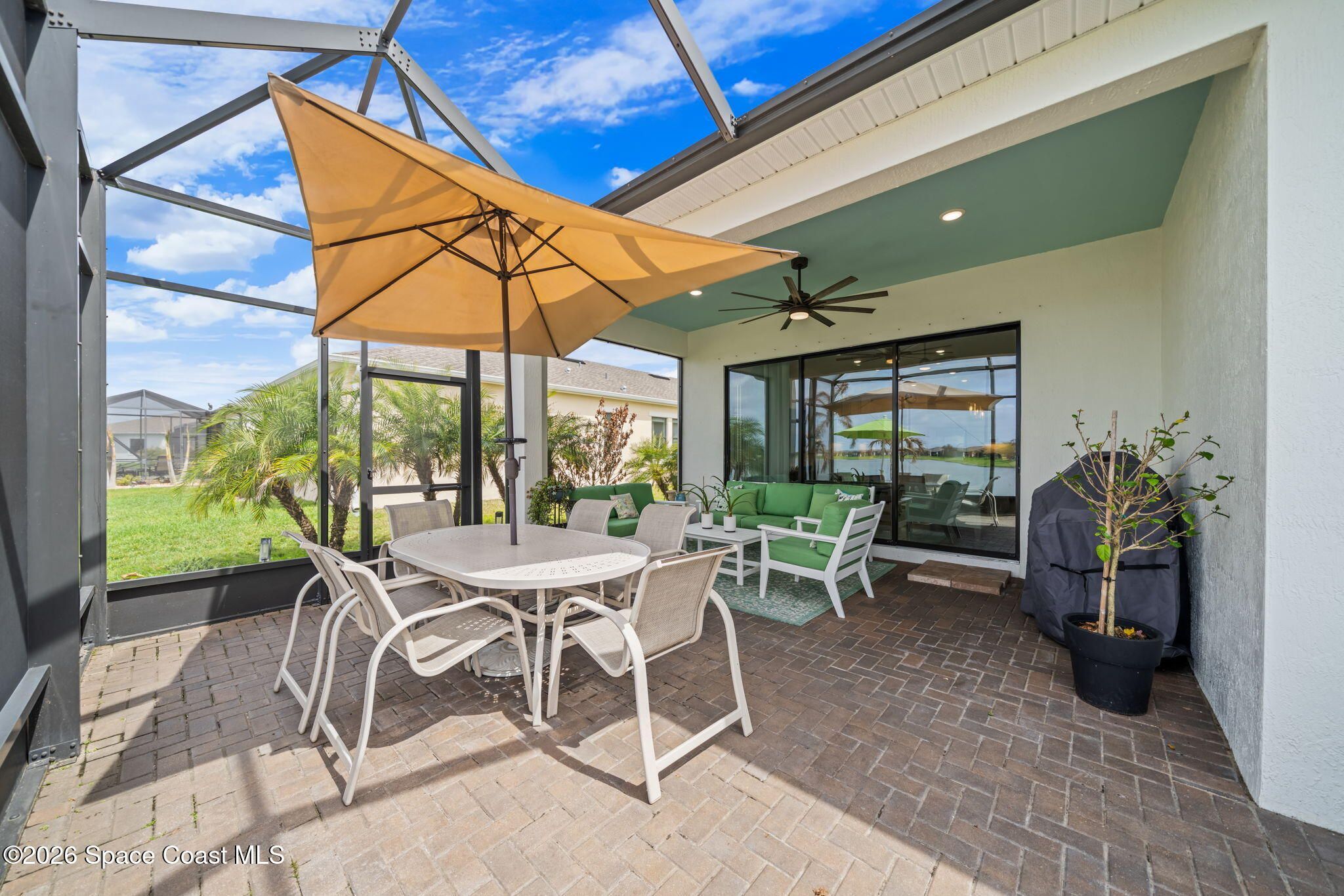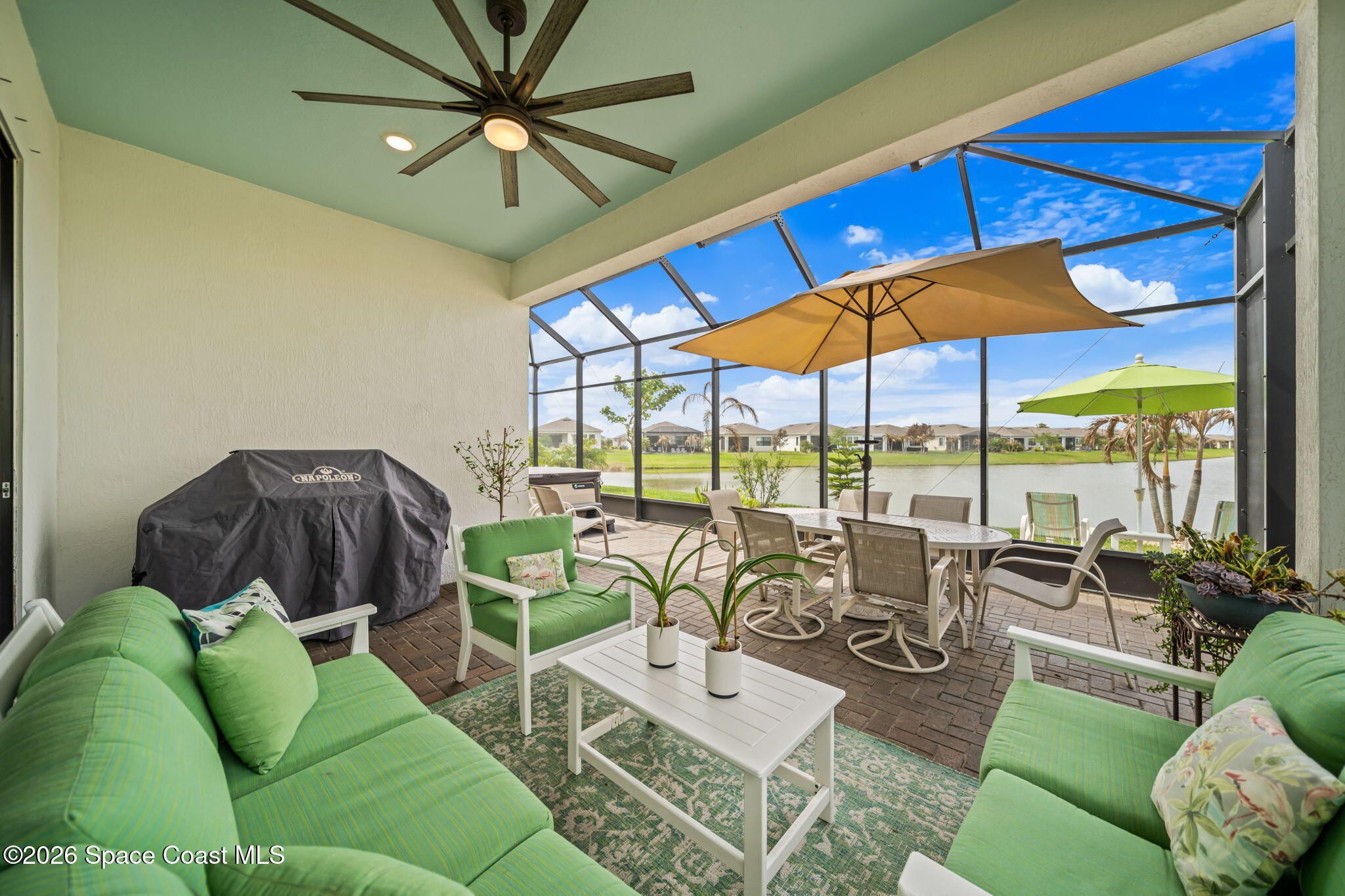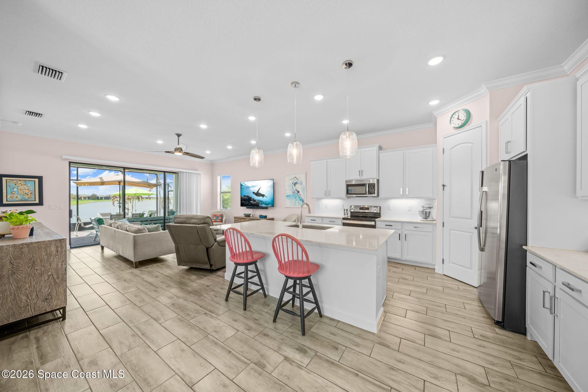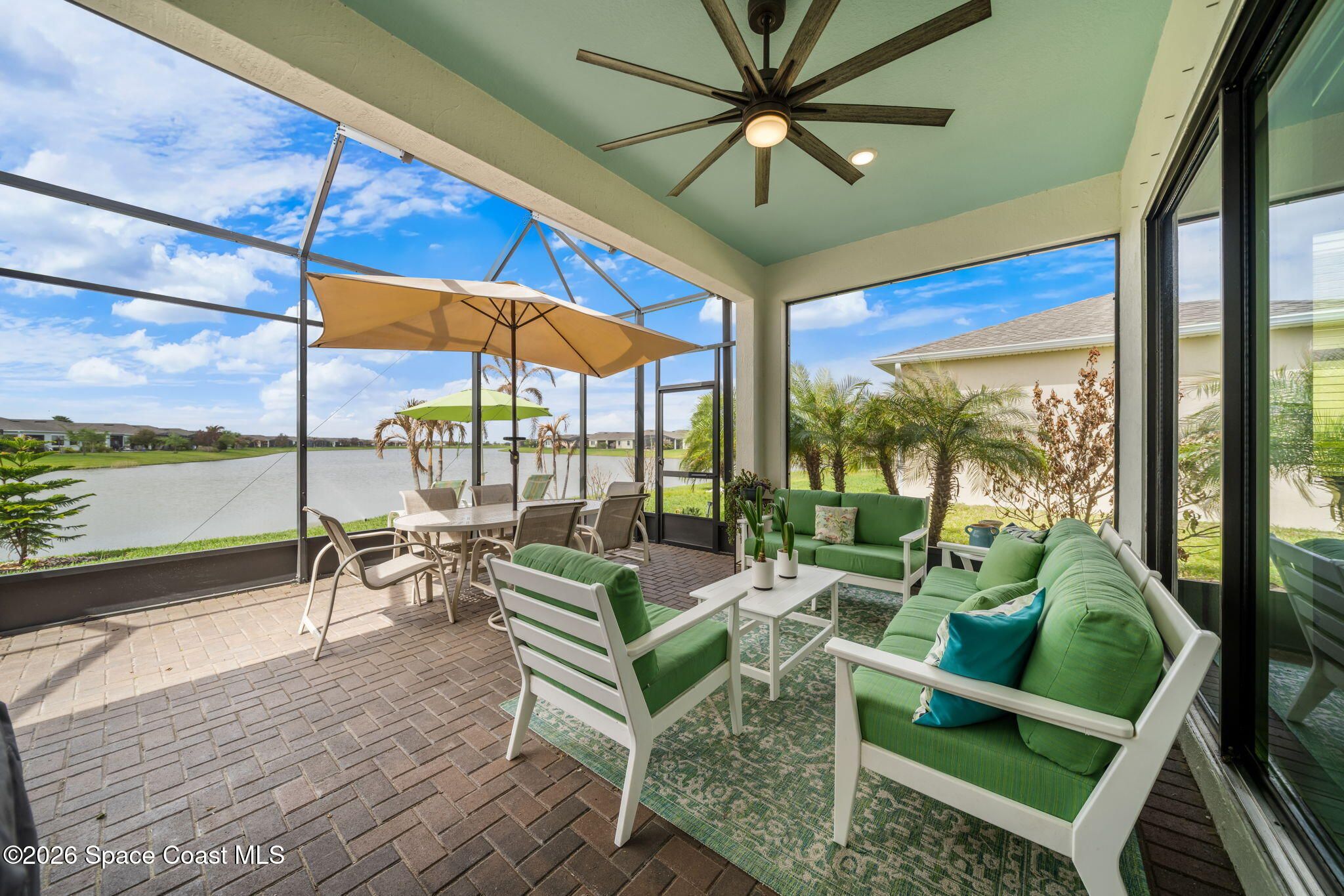 Move-In Ready, UPGRADED Nautilus Model offering maintenance-free living with amazing, LONG LAKE VIEWS from the EXTENDED SCREENED LANAI! The kitchen features a large island with premium QUARTZ countertops, a custom backsplash, beautiful cabinetry, gorgeous PLANK TILE flooring, upgraded pendant lighting, stainless steel appliances, and a walk-in pantry. The primary suite offers a large master bedroom, dual sinks, a walk-in GLASS shower, and dual walk-in closets. The flex room can be used as an extra family room, exercise room or office. Enjoy RESORT-STYLE amenities at the AMAZING 23,000 SF amenity center including a pool, indoor poolside kitchen, fitness center w/ locker rooms and massage rooms, yoga/aerobics room, movie theater, ballroom, library, art studio/craft room, billiards room, coffee cafe lounge and more! Outdoors enjoy bocce ball, pickleball, tennis courts, park and pavilion and walking paths--all in a golf-cart-friendly community. Activities are scheduled everyday!