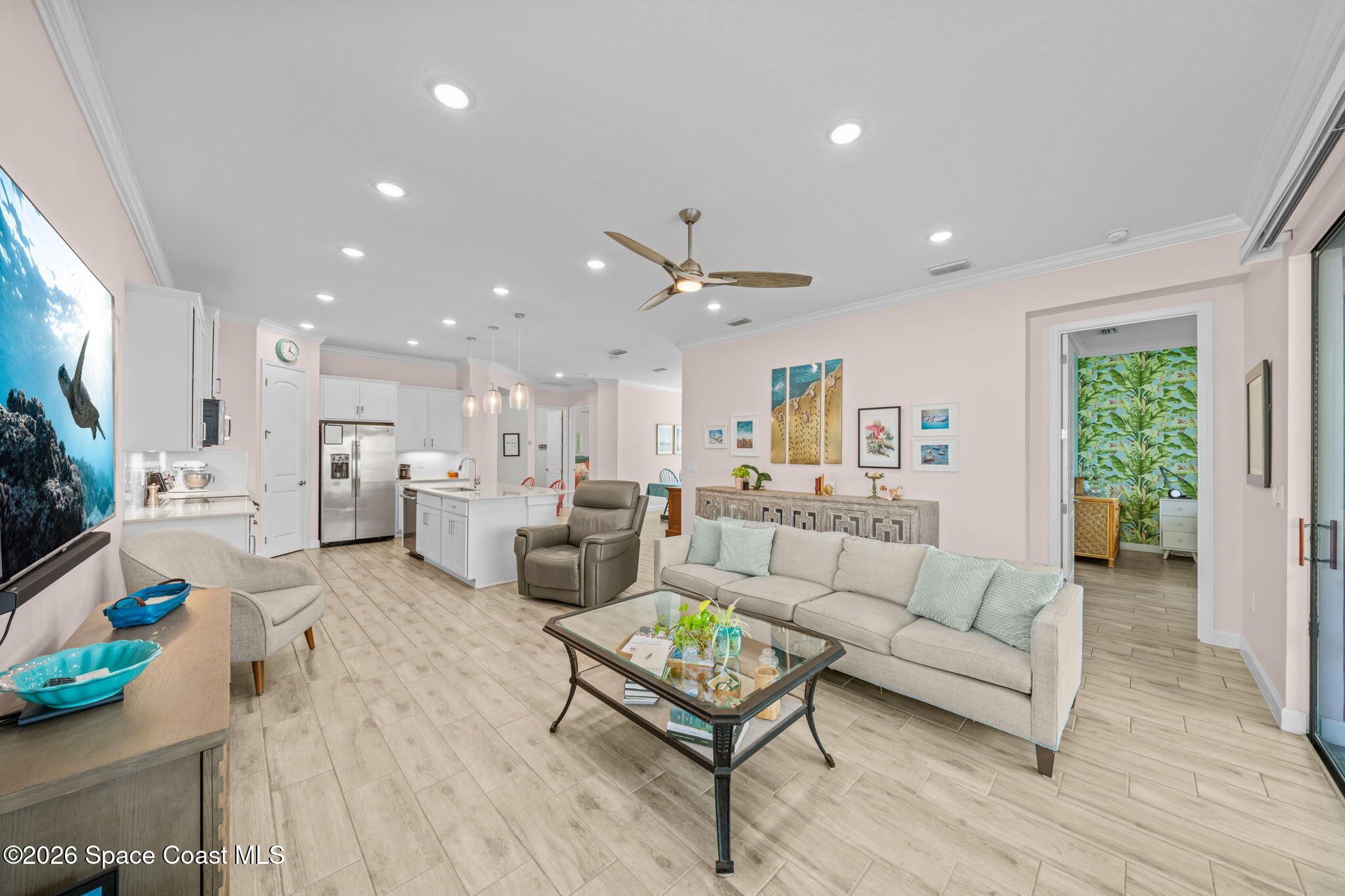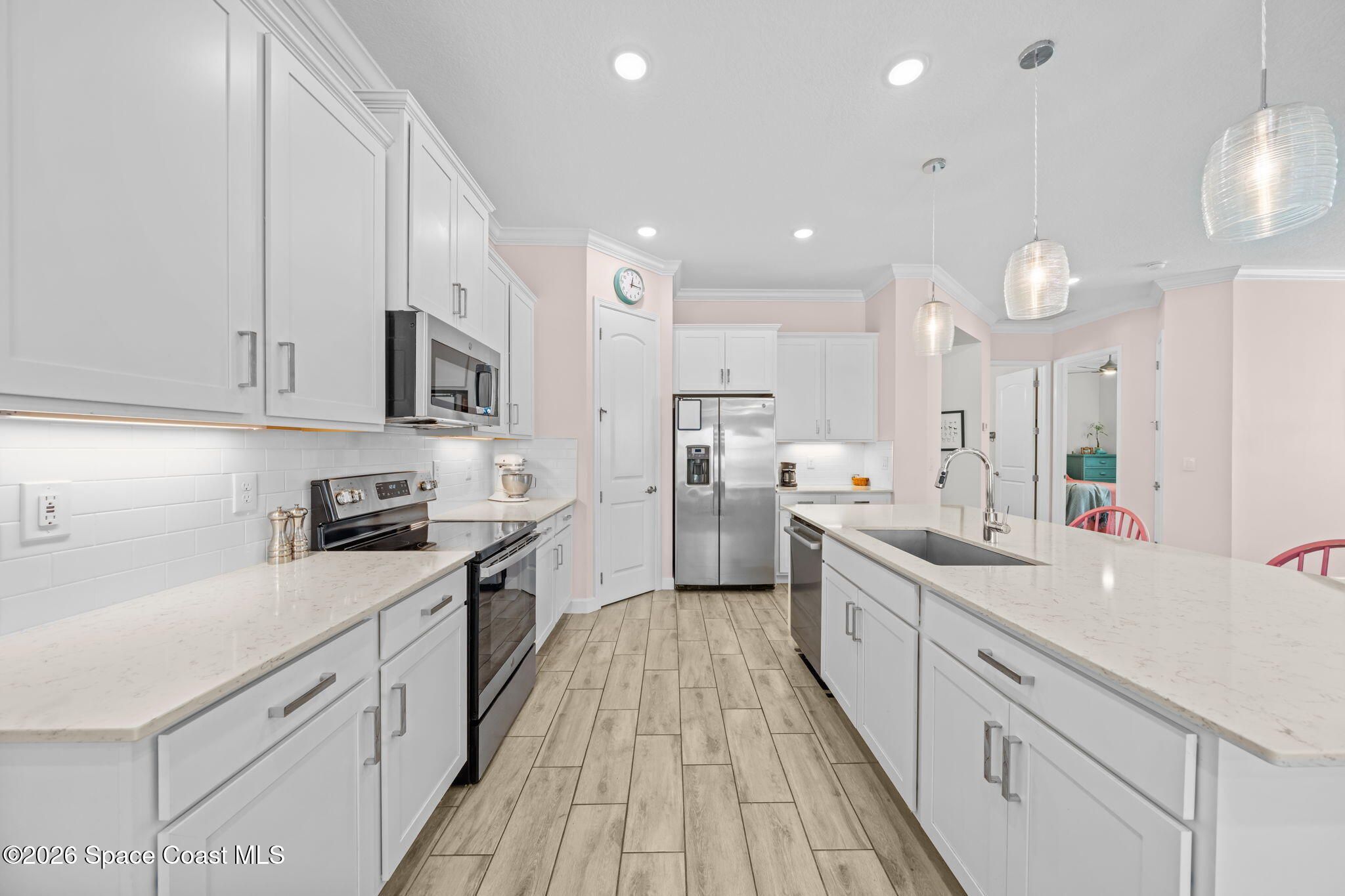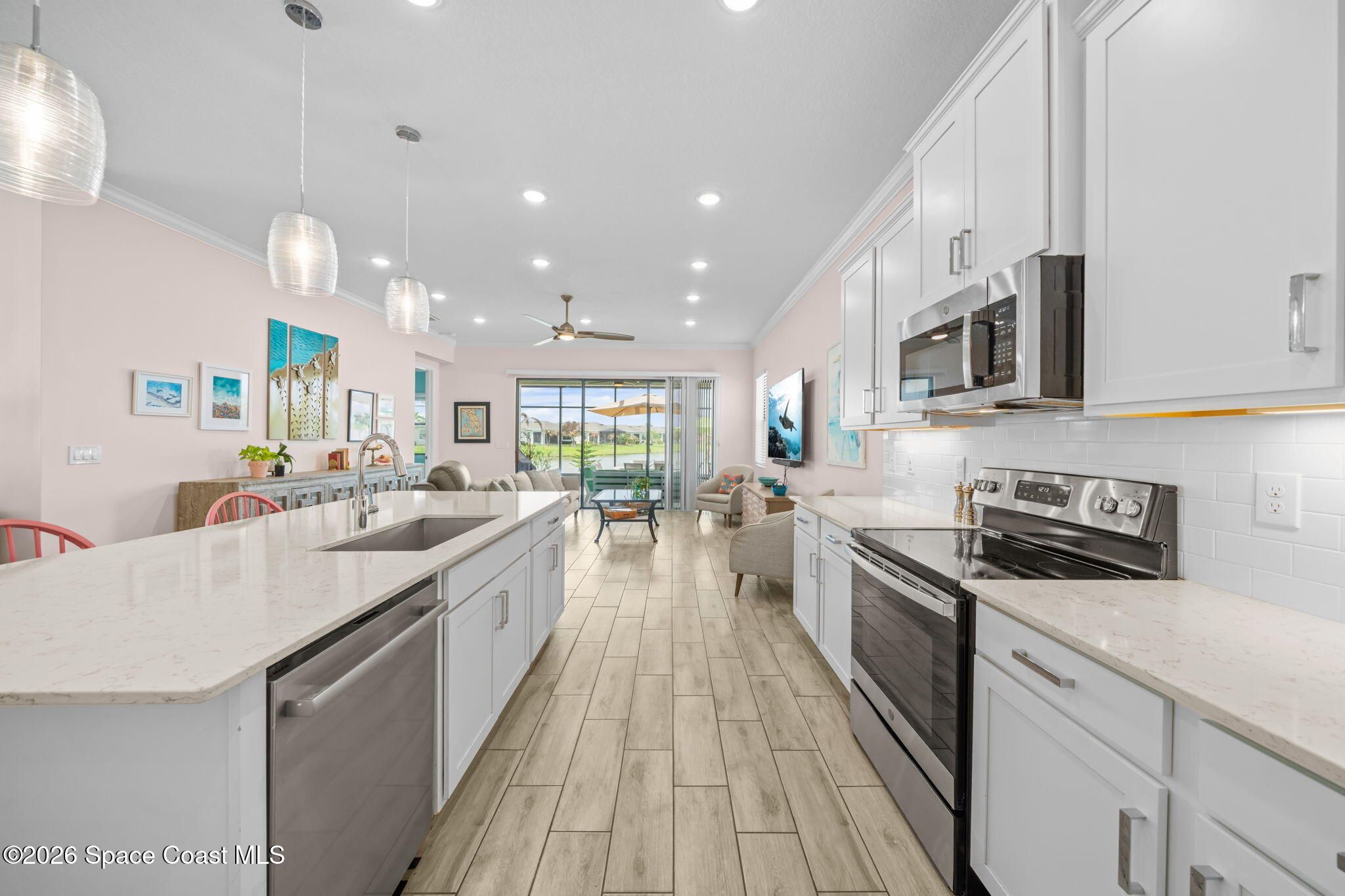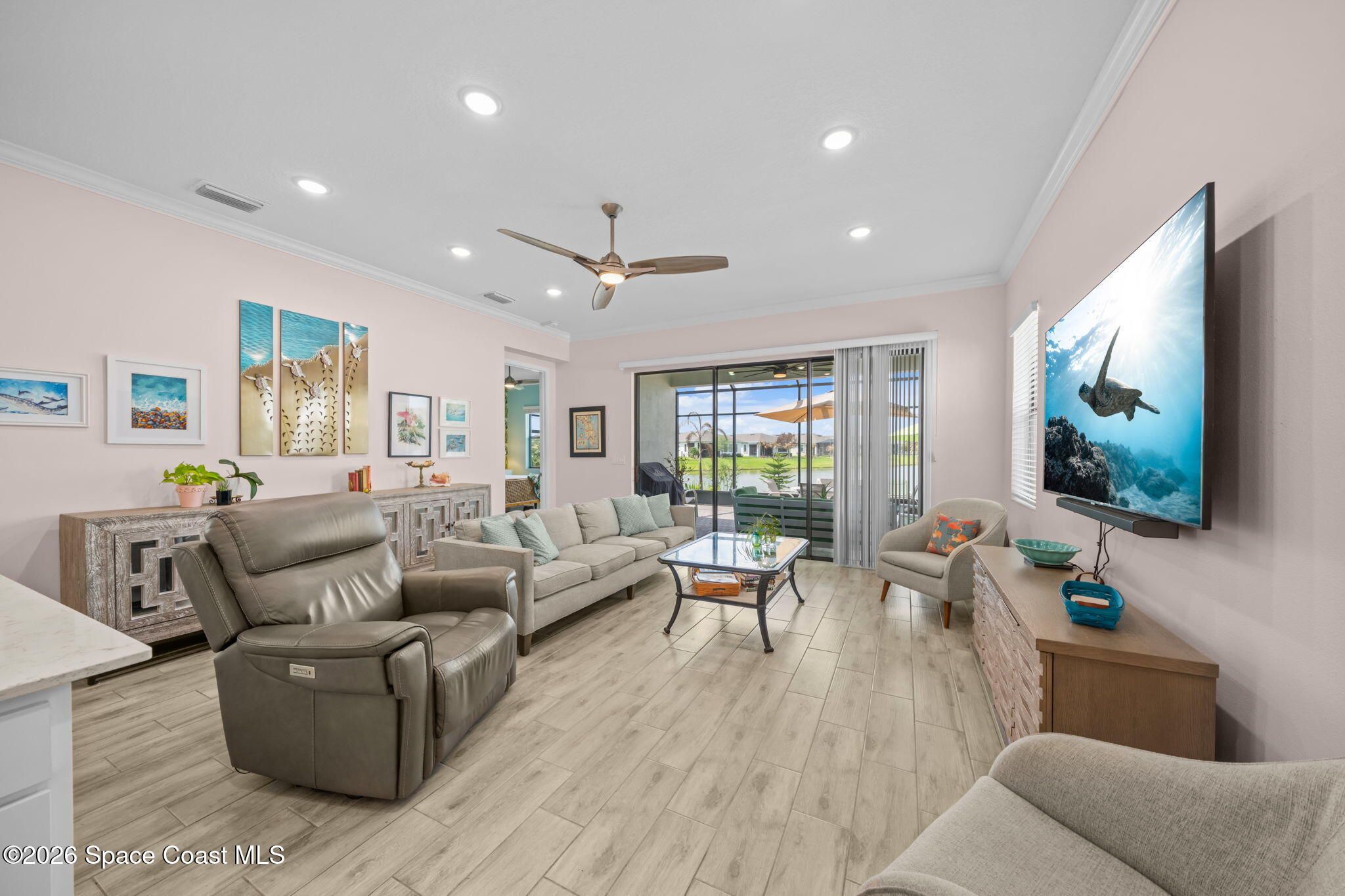 Move-In Ready, UPGRADED Nautilus Model offering maintenance-free living with amazing, LONG LAKE VIEWS from the EXTENDED SCREENED LANAI! The kitchen features a large island with premium QUARTZ countertops, a custom backsplash, beautiful cabinetry, gorgeous PLANK TILE flooring, upgraded pendant lighting, stainless steel appliances, and a walk-in pantry. The primary suite offers a large master bedroom, dual sinks, a walk-in GLASS shower, and dual walk-in closets. The flex room can be used as an extra family room, exercise room or office. Enjoy RESORT-STYLE amenities at the AMAZING 23,000 SF amenity center including a pool, indoor poolside kitchen, fitness center w/ locker rooms and massage rooms, yoga/aerobics room, movie theater, ballroom, library, art studio/craft room, billiards room, coffee cafe lounge and more! Outdoors enjoy bocce ball, pickleball, tennis courts, park and pavilion and walking paths--all in a golf-cart-friendly community. Activities are scheduled everyday!
