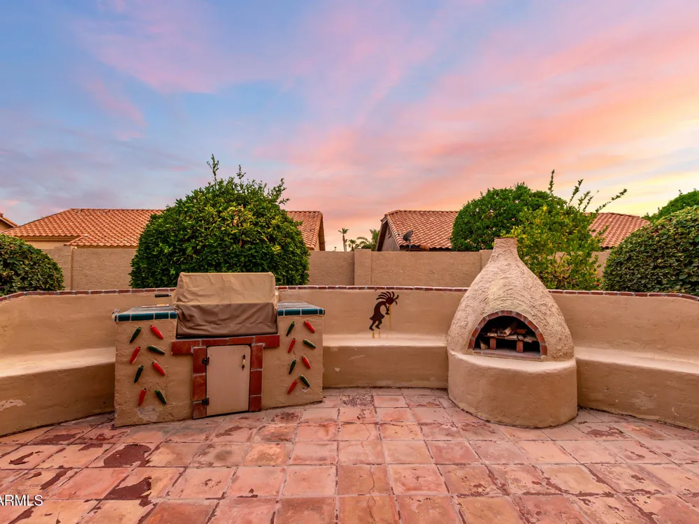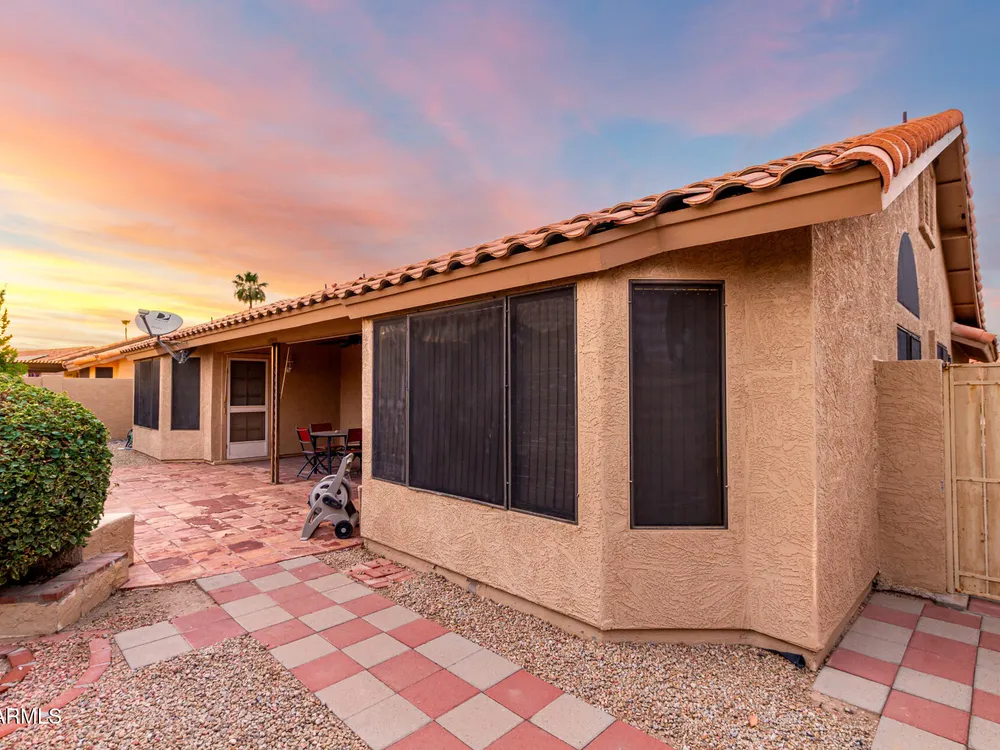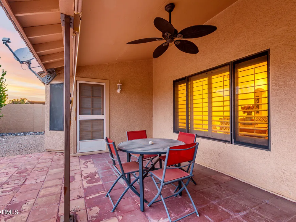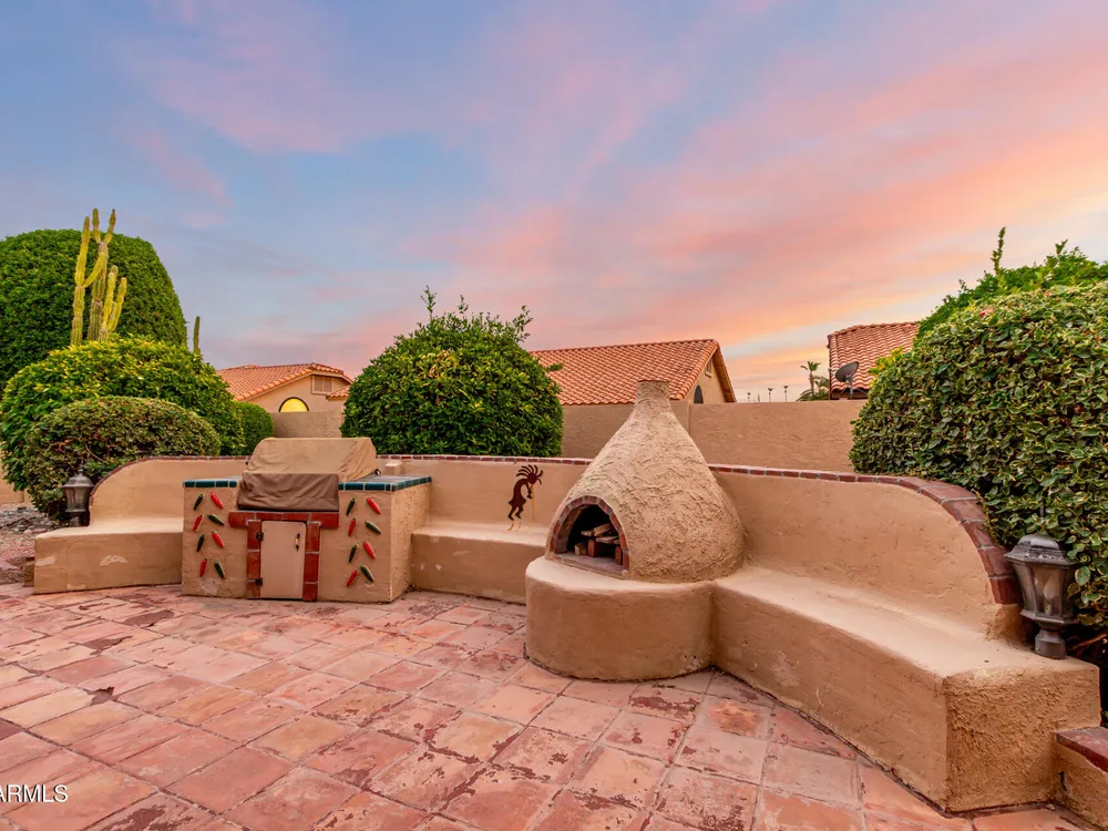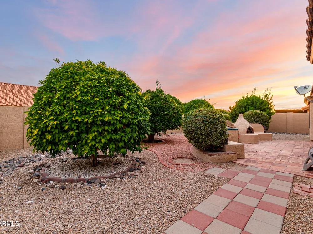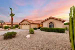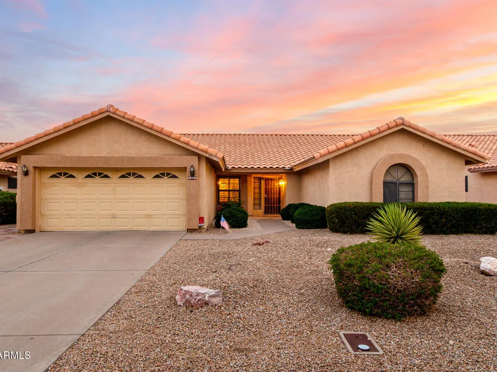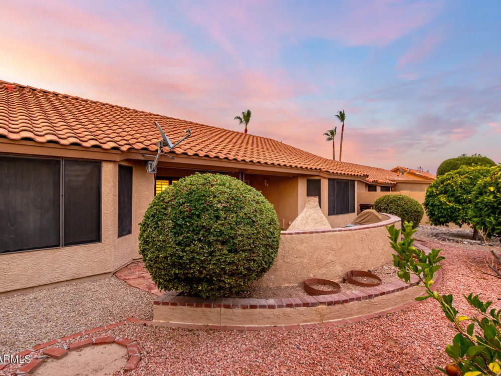 Welcome to this inviting Camelback model in the desirable Highland Hills at Westbrook Village—a vibrant active adult community! This well-maintained 3-bedroom, 2-bath home offers a spacious split floor plan, soaring vaulted ceilings, and a 2-car garage. Enjoy tile flooring throughout the main living spaces for easy maintenance, with plush carpet in the bedrooms for added comfort. Plantation shutters offer timeless style and energy efficiency. The primary suite features a private exit to the extended covered patio, perfect for relaxing in the shade or enjoying peaceful Arizona evenings. Step outside to your private backyard oasis featuring a seated adobe firepit, ideal for entertaining guests or cozy nights under the stars. Conveniently located near shopping, dining and golf.