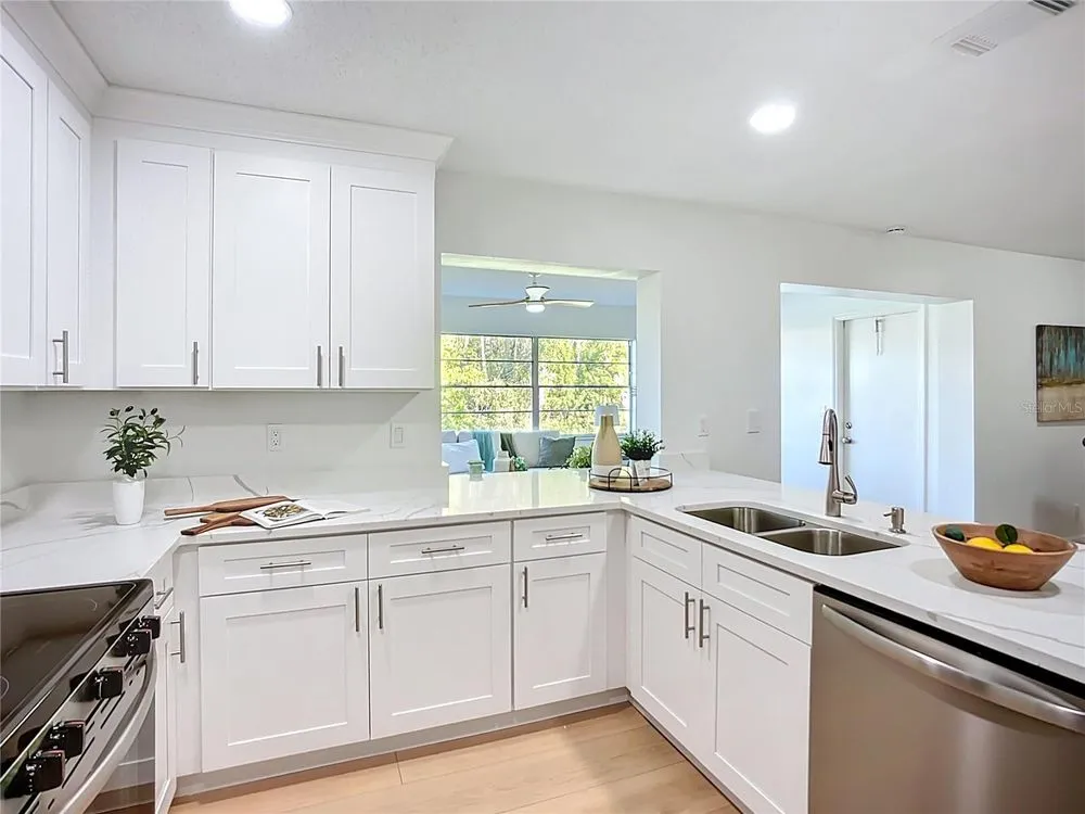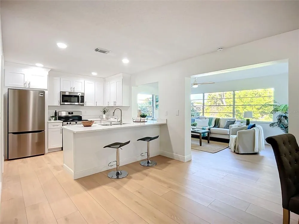 Must see this great deal! Absolutely stunning completely remodeled 2-bedroom 2 bath, 1,448 square foot home in the beautiful Kings Point community. Features include an open floor plan, brand new laminate wood floors throughout, brand new kitchen with stainless steel appliances, quartz countertops, new cabinets, remodeled bathrooms with all new faucets, finishes and light fixtures, freshly painted interior, large master bedroom includes a walk in closet and en-suite bathroom with a stand-up shower and this home has a utility room for your washer and dryer. Super private waterfront unit with no rear neighbors. The community features include gated security with 24-hour guard two clubhouses, Theater, six heated pools, 2 hot-tubs, fitness centers and a full-service spa. It also includes tennis courts, three golf courses, billiards, pickelball and other sports clubs. This maintenance-free community even has its own free transportation system, and allows access to doctors, hospitals, shopping, banking and restaurants via golf cart. Conveniently located close to shopping centers, restaurants and entertainment.