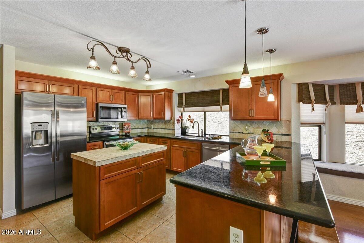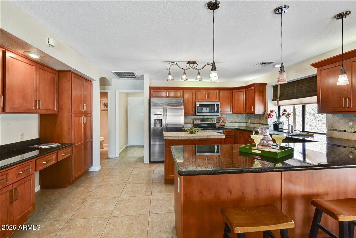 Experience sophisticated living in this exquisitely maintained residence within Westbrook Village. Designed for the discerning host, the home features a beautifully updated gourmet kitchen and an expansive Arizona Room with serene views. The private, resort-style backyard is an entertainer's masterpiece, anchored by a palatial pool and integrated spa. The estate boasts modern refinement, including owned solar for efficiency and two new HVAC units (2023). Enjoy a primary suite with a contemporary roll-in shower and designer touches throughout. This home offers a rare blend of comfort and style, all within Westbrook Village, which features resort-style amenities including 2-18 hole golf courses, 2 community pools, 2 rec centers, pickleball, restaurants, clubs and so much more!