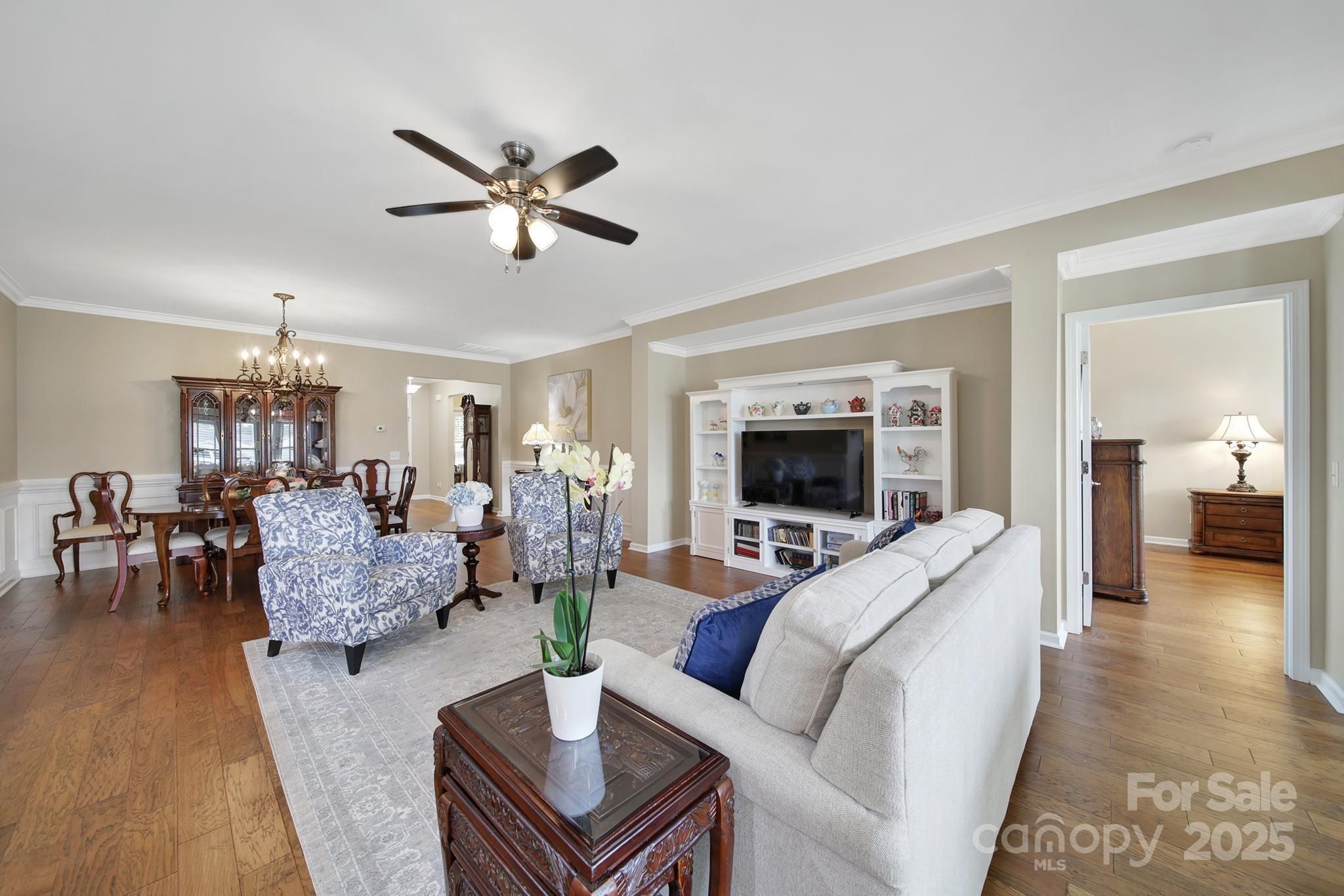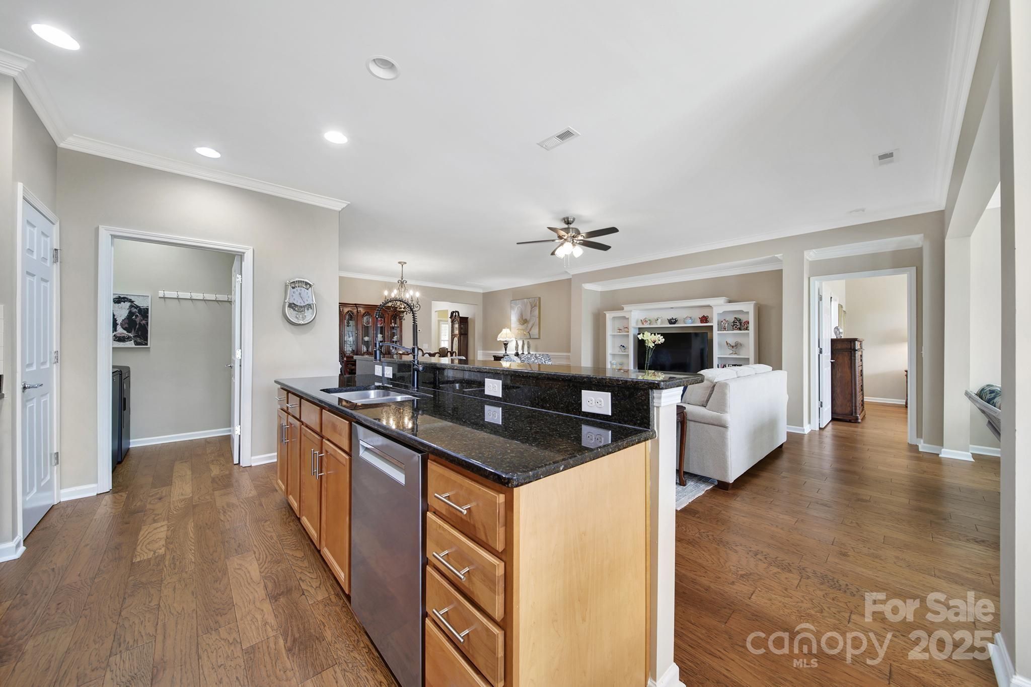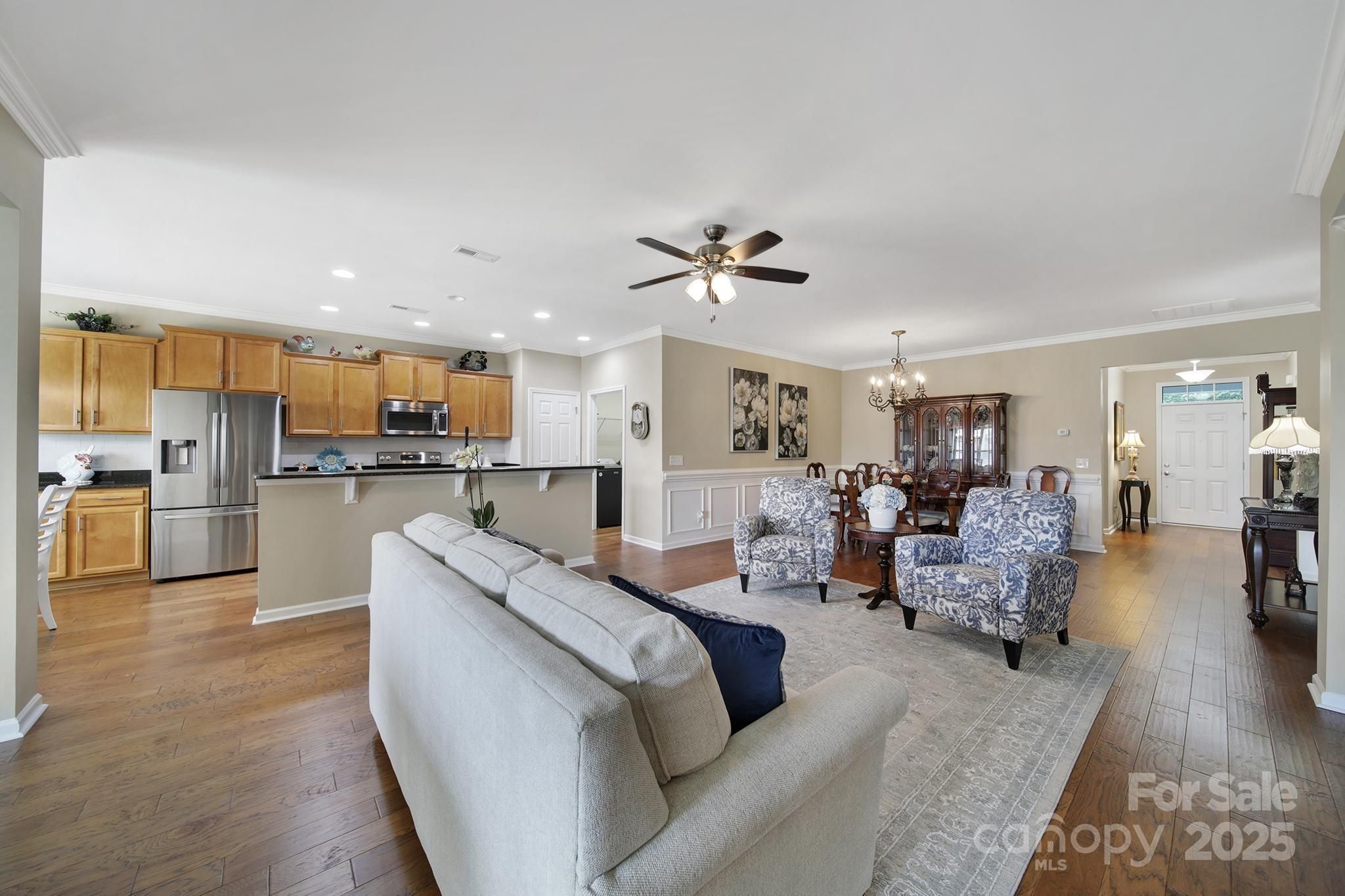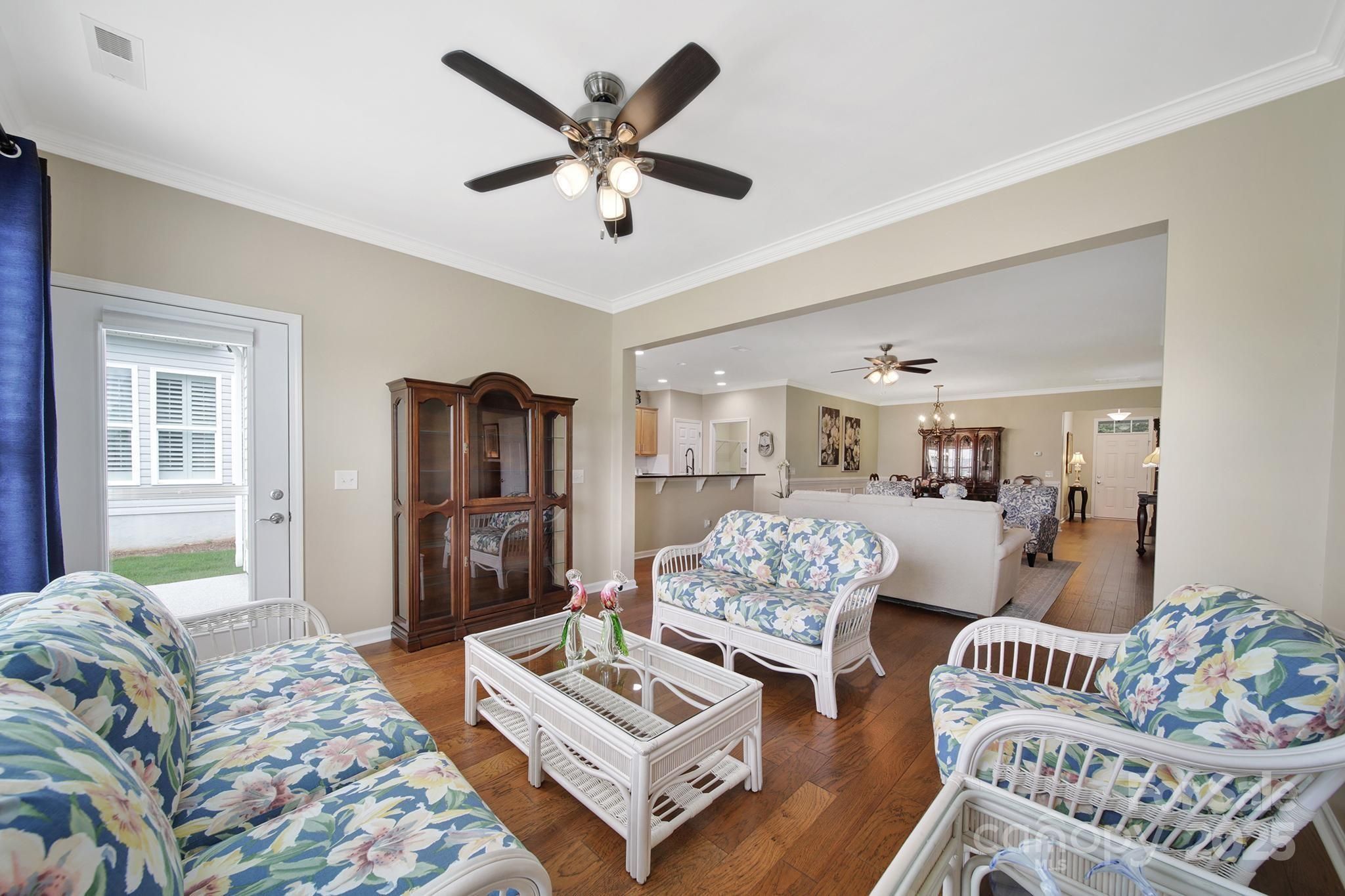 Well-Maintained Vernon Hill Model in Sun City Carolina Lakes! This 3BR/2BA home features engineered hardwood flooring throughout, plantation shutters, crown molding, and a peaceful setting. The open kitchen includes a tile backsplash, bar seating, a sunny breakfast nook, and a pantry with built-in sliding shelves. Enjoy the spacious sunroom or relax outdoors on the rear patio. The primary suite offers an ensuite bath with dual vanities, a walk-in glass shower, and a large walk-in closet. Two guest bedrooms share a full bath—ideal for visitors. Additional features: Polyurea floor coatings on porch, patio & garage, stainless steel refrigerator, washer/dryer, storm doors (front & back), low-voltage landscape lighting, and window treatments—all included. Enjoy resort-style amenities in the vibrant 55+ community of Sun City Carolina Lakes!