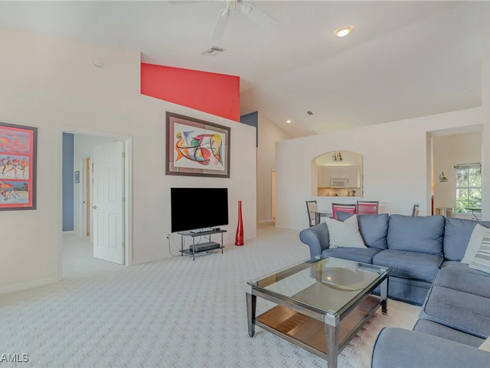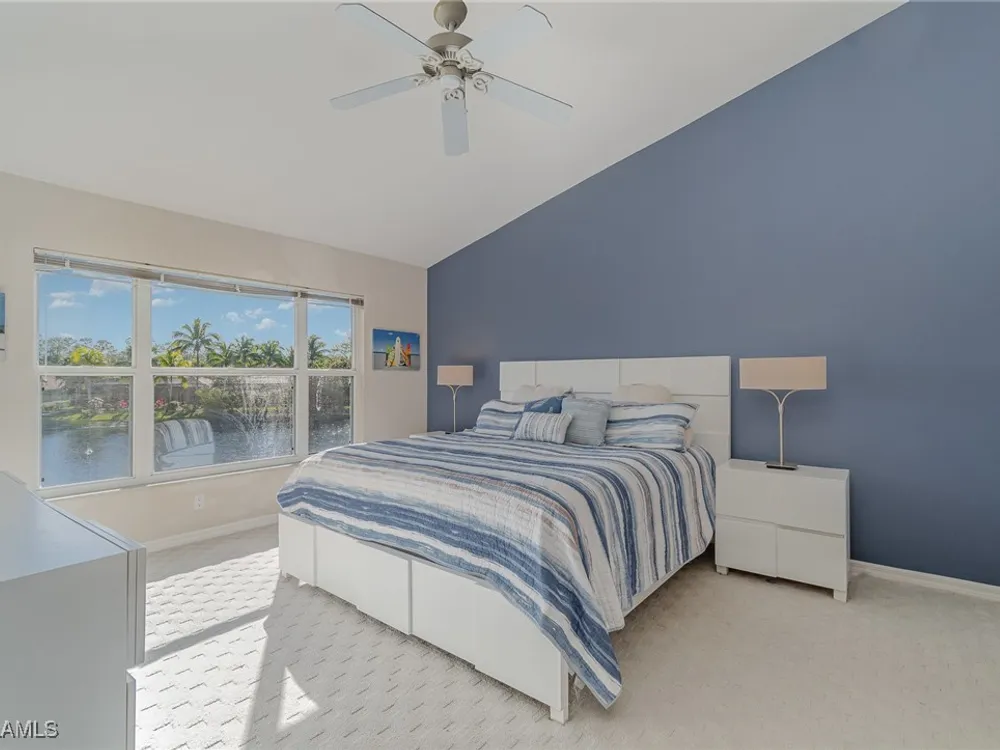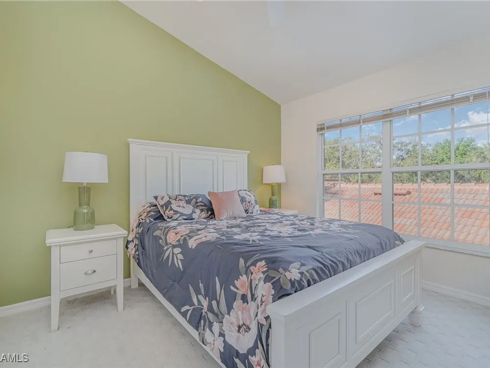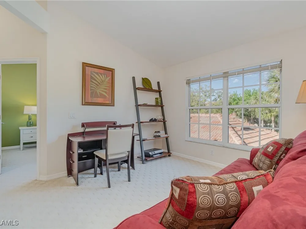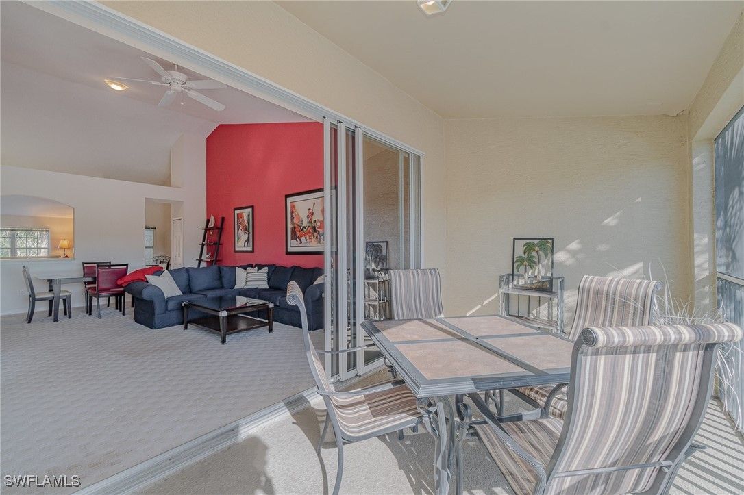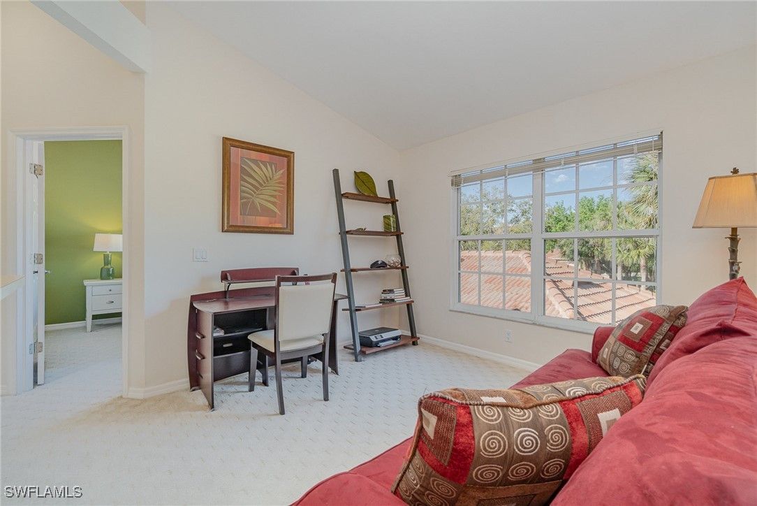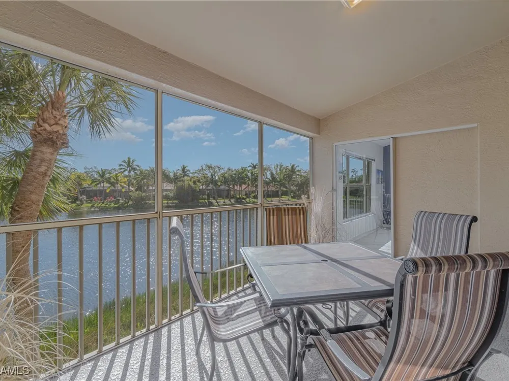 Welcome to this beautifully maintained home in the highly sought-after Sabal Palm neighborhood of Grandezza. Set within a gated golf community known for its stunning 53,000-square-foot clubhouse, this second-floor residence offers a tranquil and elevated lifestyle in the heart of Estero. This spacious home features 2 bedrooms, 2 bathrooms, and a versatile open den—all within 1,473 square feet of thoughtfully designed living space. High ceilings and an open-concept layout create an airy, inviting atmosphere, while the den offers flexibility as a home office, reading area, or additional TV room. Offered turnkey furnished, this property allows for a seamless move-in experience. The large, screened lanai provides peaceful, eastern-facing views of the lake and is accessible from both the great room and the primary bedroom, making it a perfect spot to unwind or entertain. Additional highlights include a detached garage for convenient parking and extra storage. Ideally located just minutes from Miromar Outlets, Hertz Arena, Publix, Florida Gulf Coast University, Gulf Coast Town Center, Coconut Point Mall and Southwest Florida International Airport, Grandezza places you close to top-tier shopping, dining, and beautiful Gulf Coast beaches.