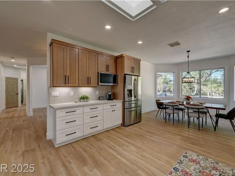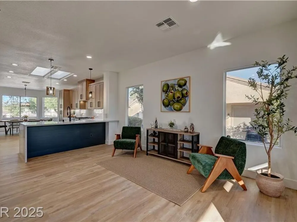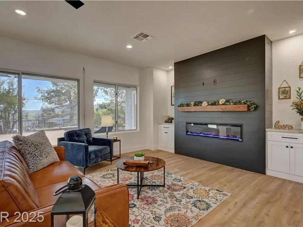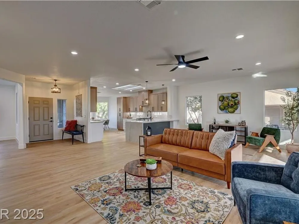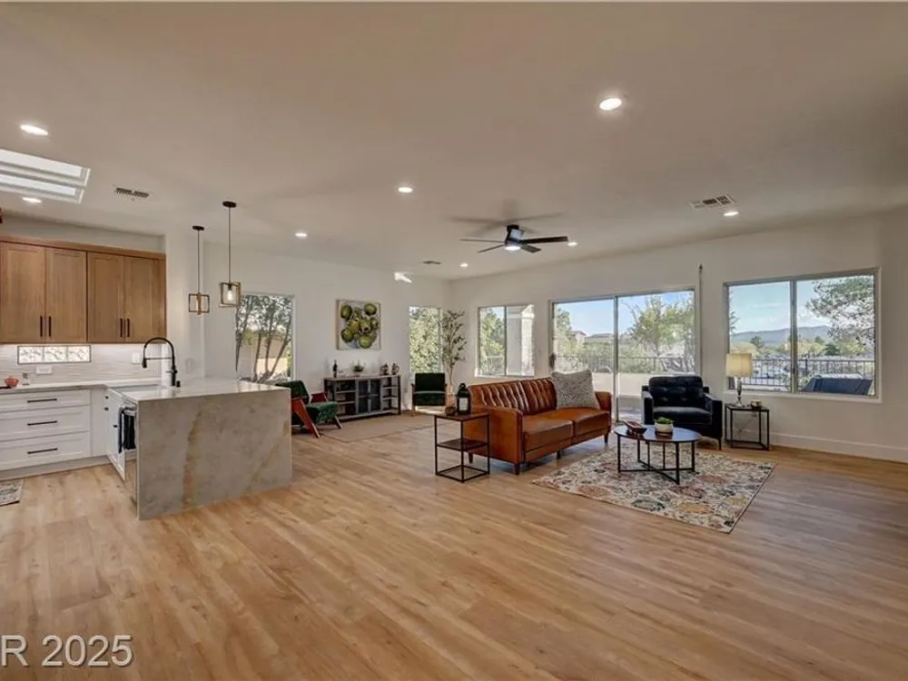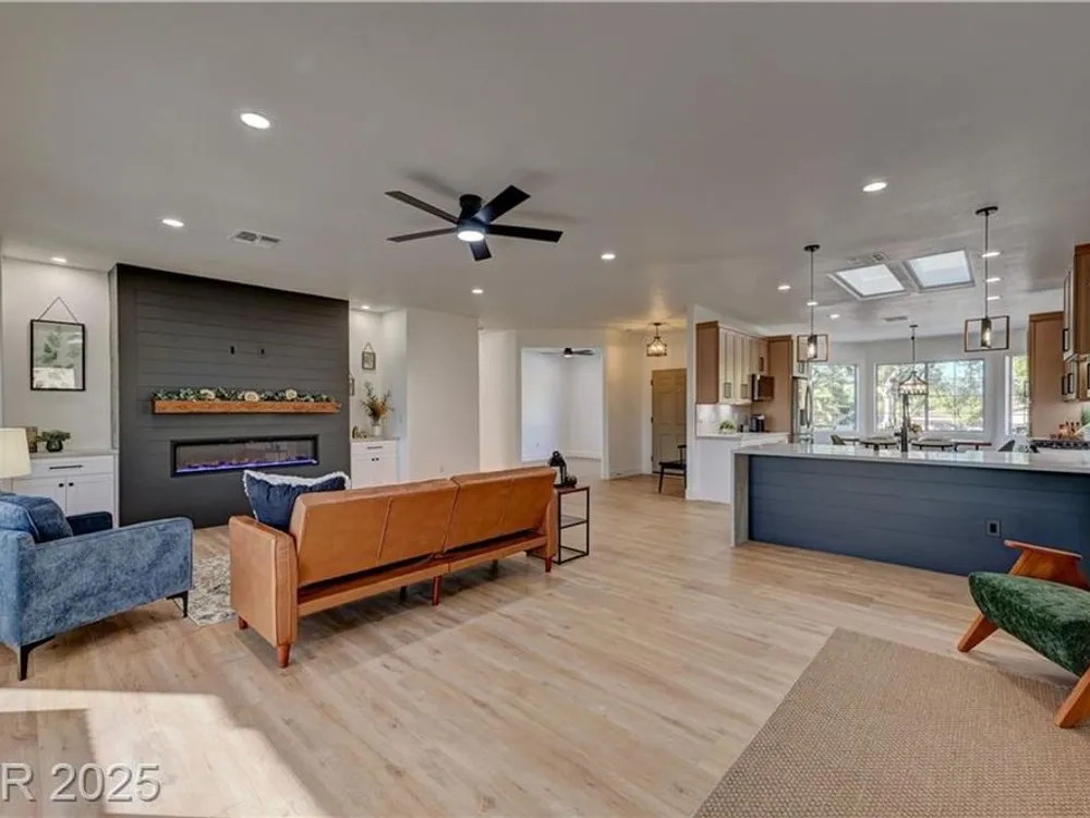 Welcome Home! This beauty has been completely remodeled and has magnificent mtn views. Perfect location just 5 houses away from the Anthem Clubhouse & short golf cart ride to Revere Golf Course. The Mid-Century Modern vibe along with natural skylights make the home warm & welcoming. All new exterior/interior paint, luxury vinyl floors, baseboards, door casings, painted doors, hardware & fixtures throughout. The spacious kitchen offers custom cabinets, quartz counters, farmhouse sink, hardware, accent lighting, custom hood, built in pantry, coffee bar, new appliances & enormous dining area. Porcelain tile showers in bathrooms w/custom glass shower doors, plumbing valves & trims, sinks & faucets. Great for entertaining or a quiet night at home, the accent fireplace wall with wood mantle has ample room to mount the largest of TV's plus added cabinets & accent lighting. Either the private courtyard or expansive back patio provide a peaceful and tranquill getaway any time of year.