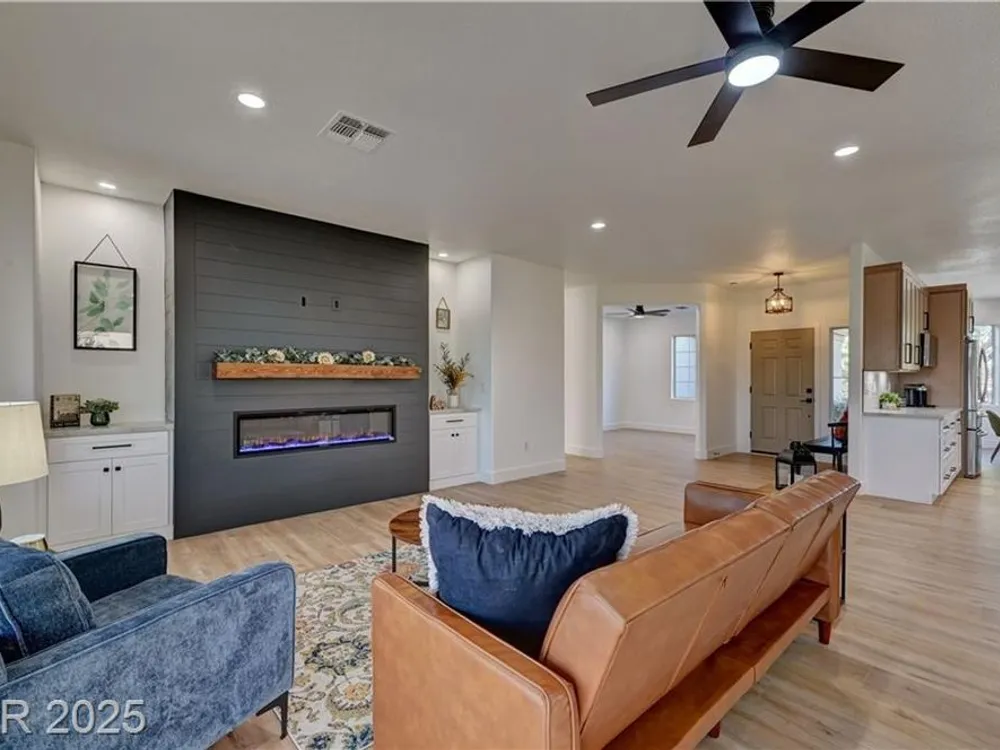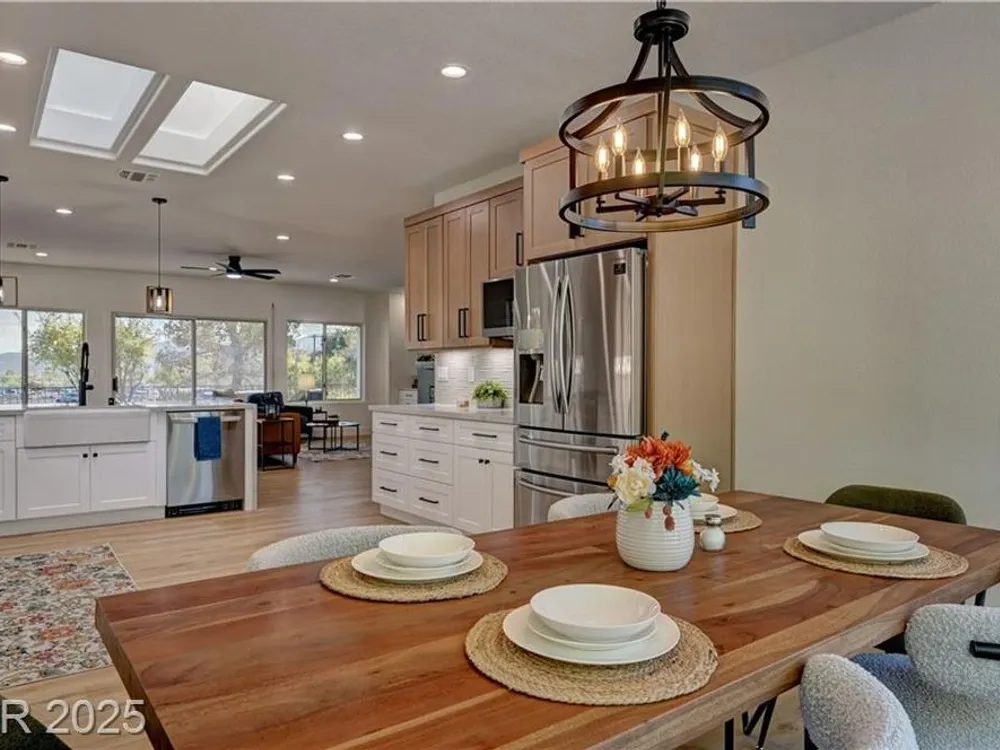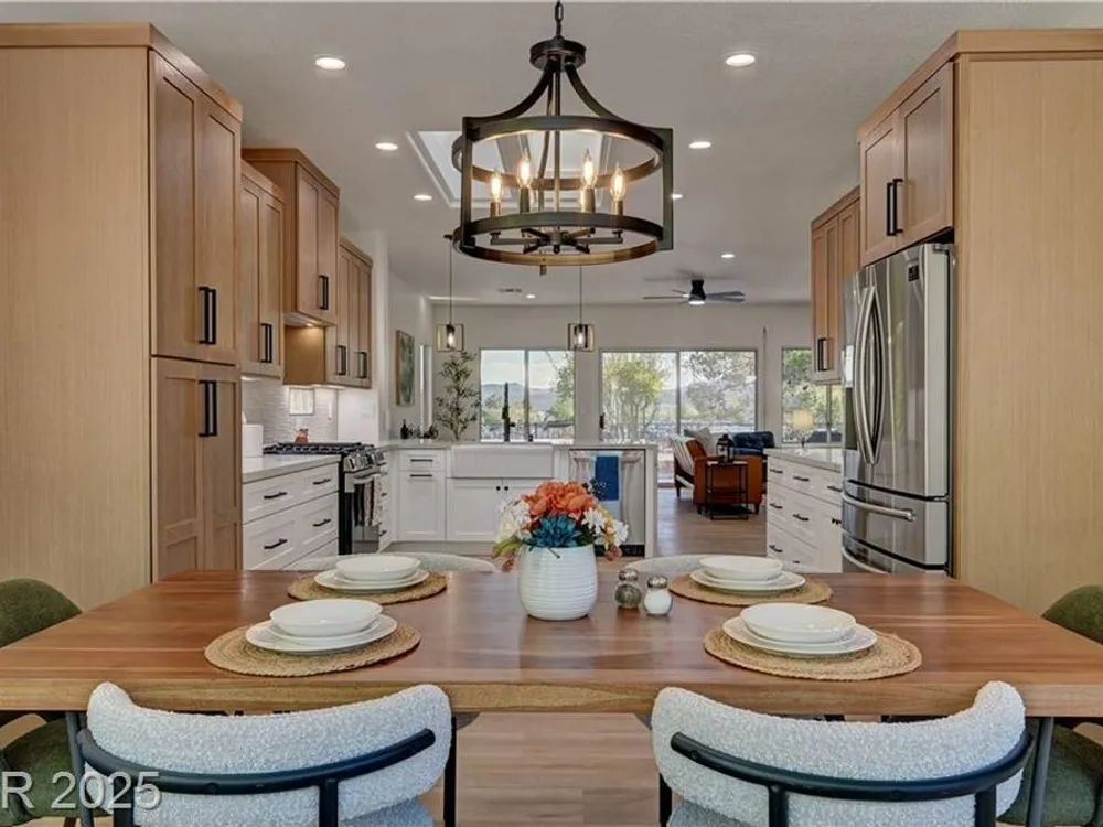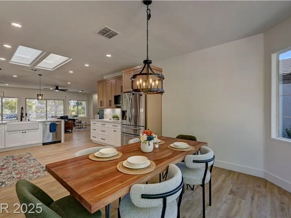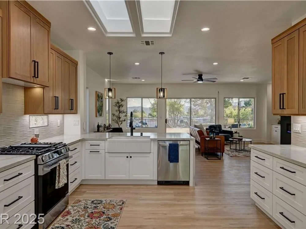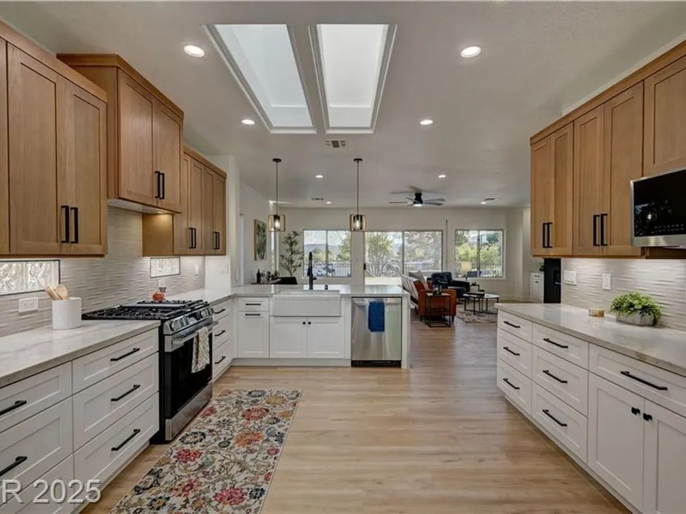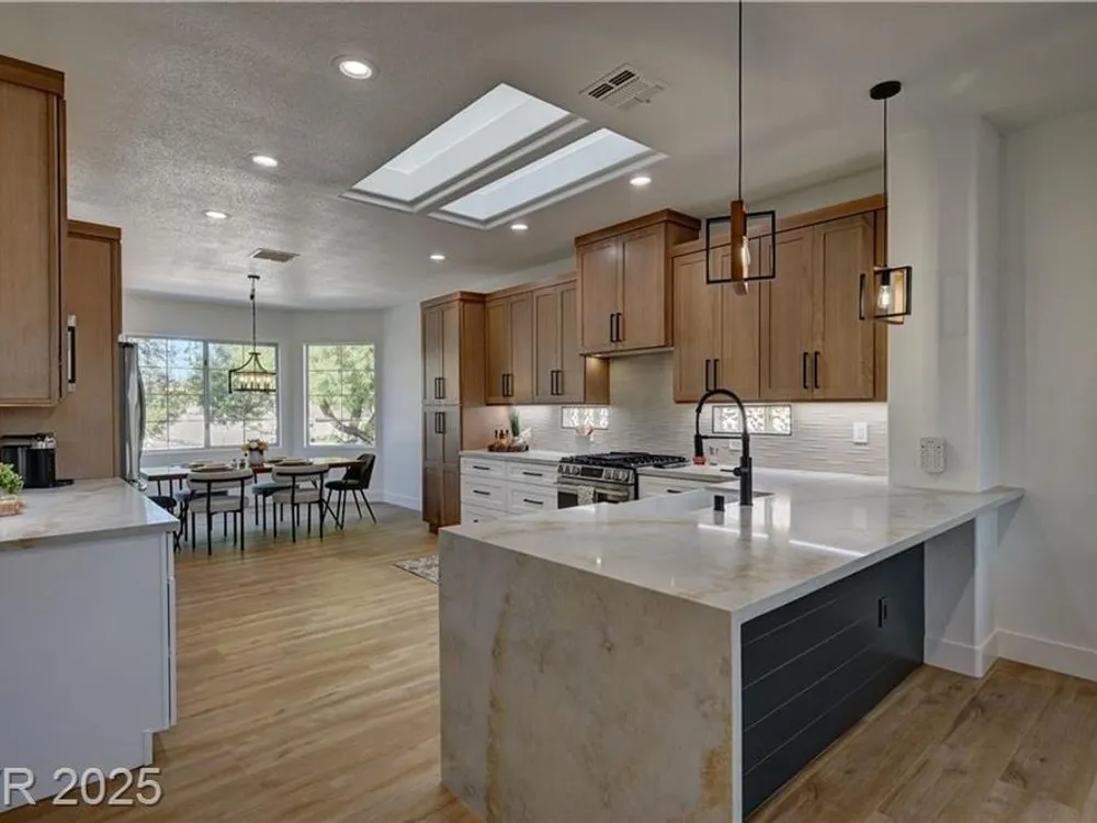 Welcome Home! This beauty has been completely remodeled and has magnificent mtn views. Perfect location just 5 houses away from the Anthem Clubhouse & short golf cart ride to Revere Golf Course. The Mid-Century Modern vibe along with natural skylights make the home warm & welcoming. All new exterior/interior paint, luxury vinyl floors, baseboards, door casings, painted doors, hardware & fixtures throughout. The spacious kitchen offers custom cabinets, quartz counters, farmhouse sink, hardware, accent lighting, custom hood, built in pantry, coffee bar, new appliances & enormous dining area. Porcelain tile showers in bathrooms w/custom glass shower doors, plumbing valves & trims, sinks & faucets. Great for entertaining or a quiet night at home, the accent fireplace wall with wood mantle has ample room to mount the largest of TV's plus added cabinets & accent lighting. Either the private courtyard or expansive back patio provide a peaceful and tranquill getaway any time of year.