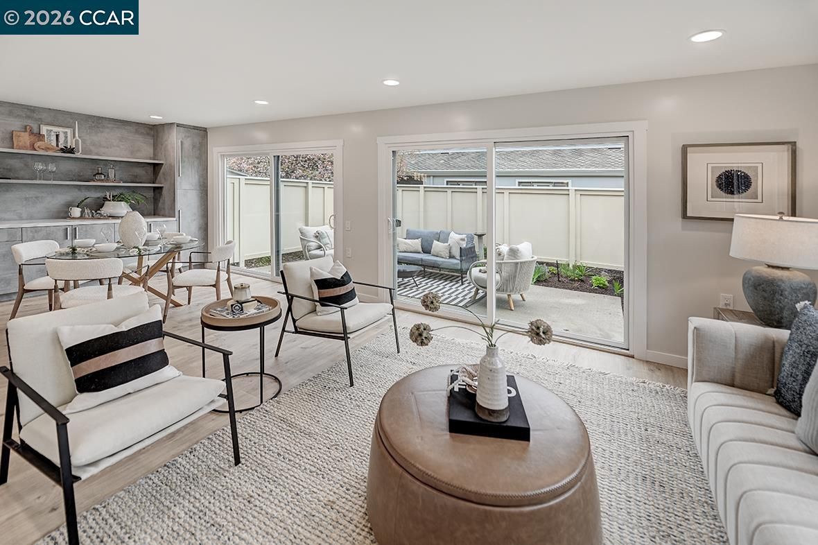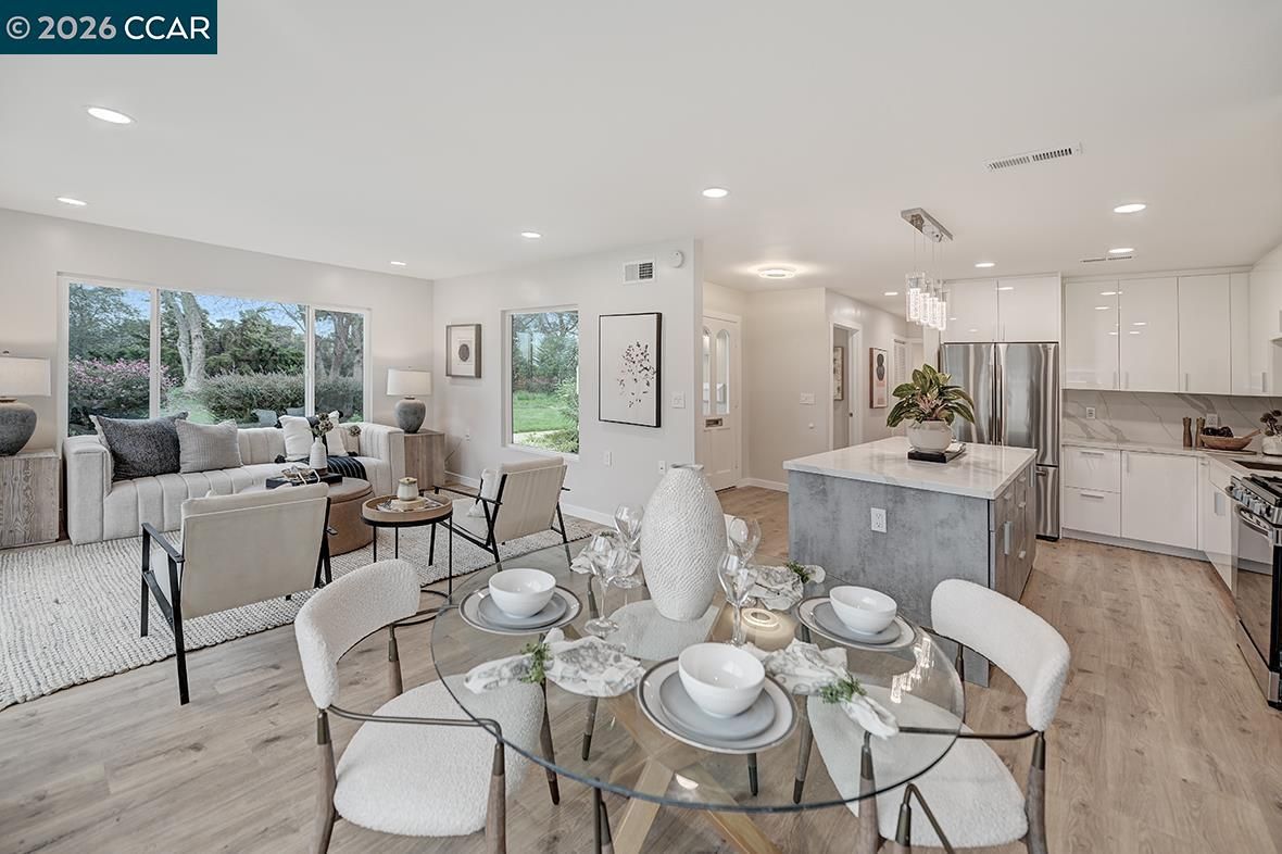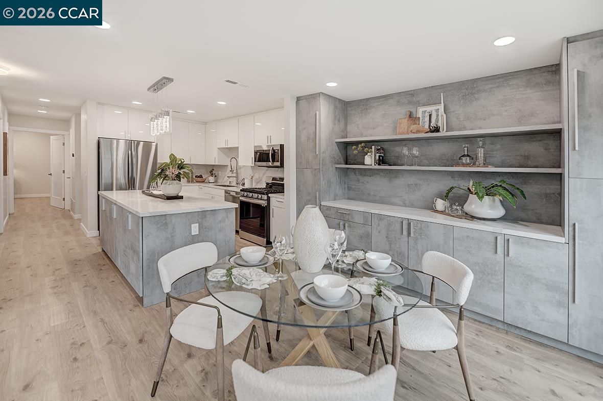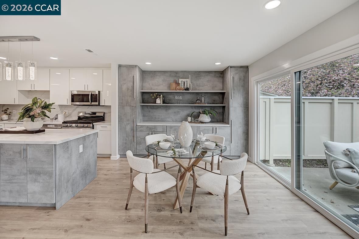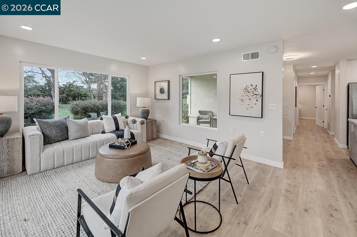 Spectacular totally remodeled Yosemite, 2 bedroom, 2 bath, LEVEL IN beauty! Mt Diablo views from the Primary Bedroom with a peaceful park like common area.. Nestled in an exclusive single row building, this corner/end unit boasts access to open space, a stunning view, no neighbors in the front, above or below. Open floor plan, skylights and a kitchen that features a spacious island, floor to ceiling high end Mirlux cabinets, quartz countertops, and stainless steel appliances. The dining room showcases a stunning soft gray built in full wall buffet cabinetry. Hard surface flooring throughout. Fully enclosed patio off the kitchen and living room has an open panel gate for visibility out to the front grassy area. Truly unique floor plan culminates in an expansive master bedroom with a spacious walk in closet. Two bathrooms with beautifully tiled showers. Hidden stacked washer/dryer. Walk to outdoor pool and lawn bowling. A MUST SEE!