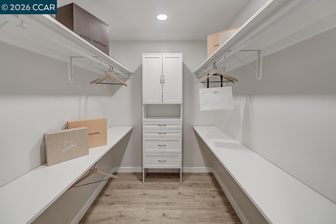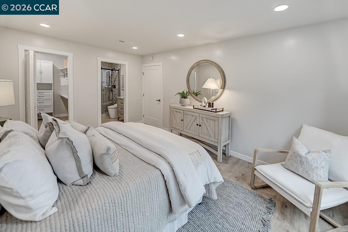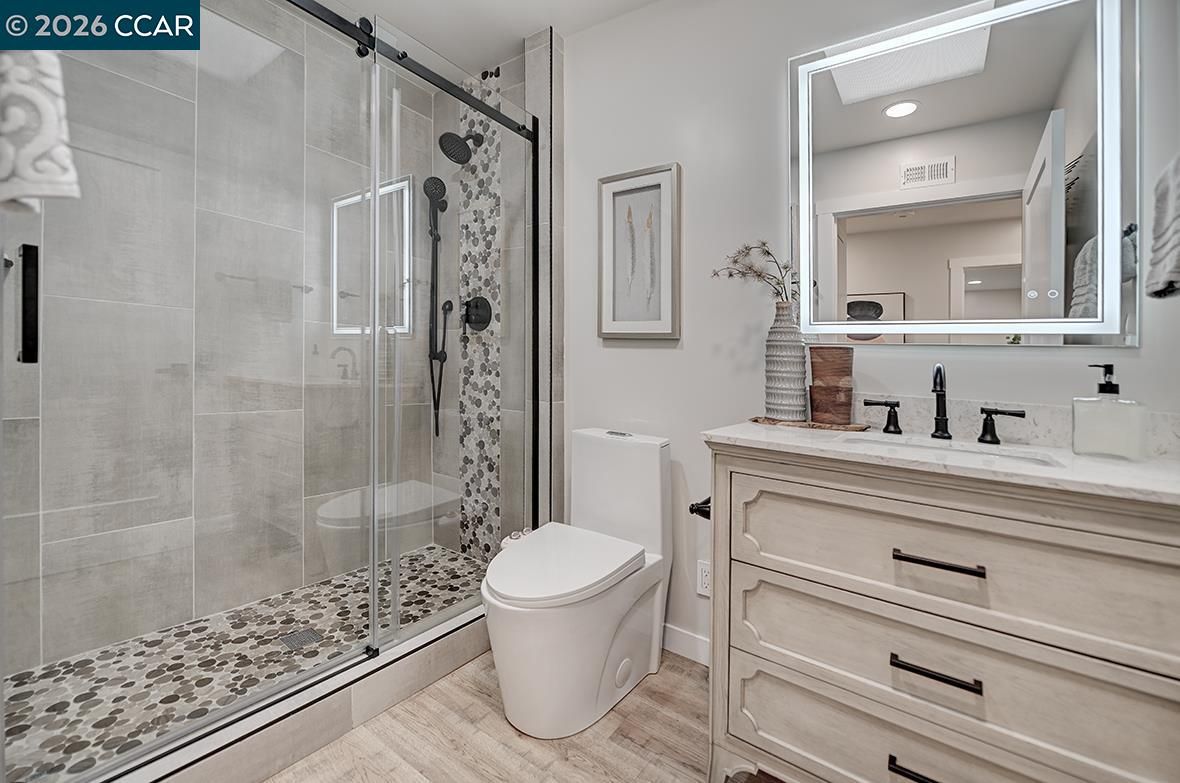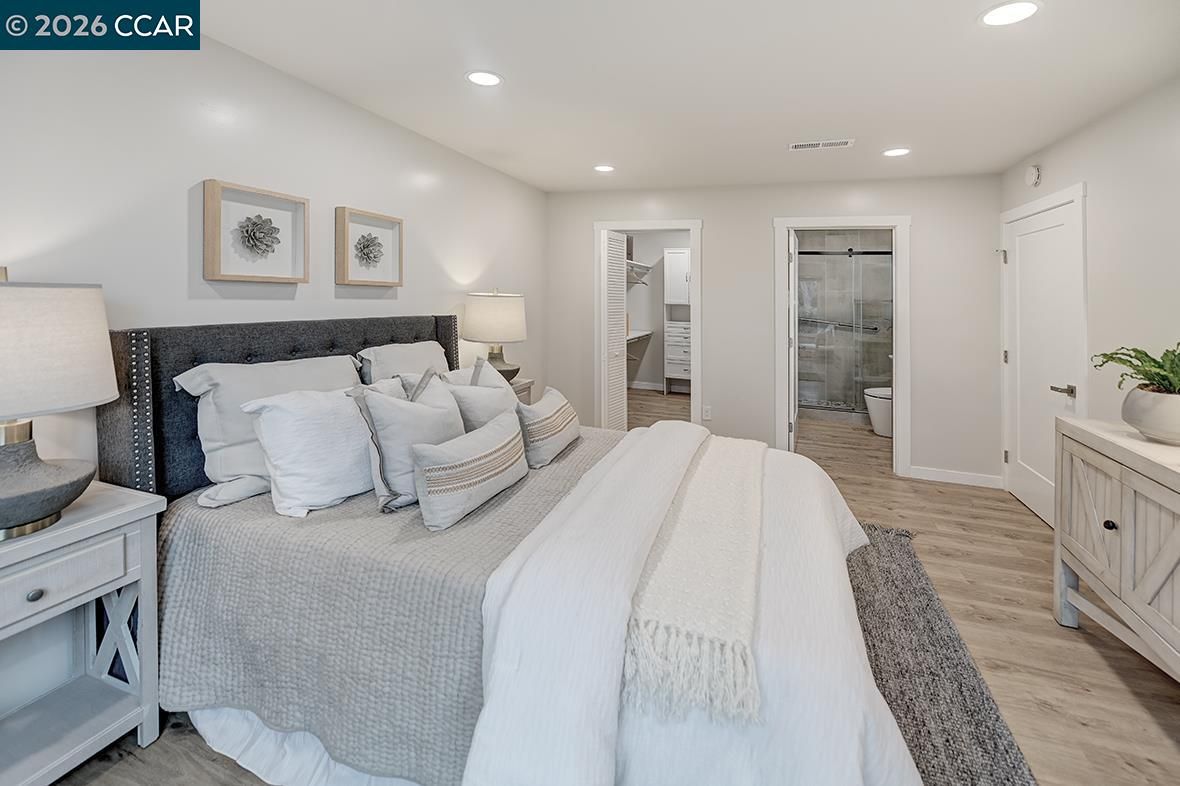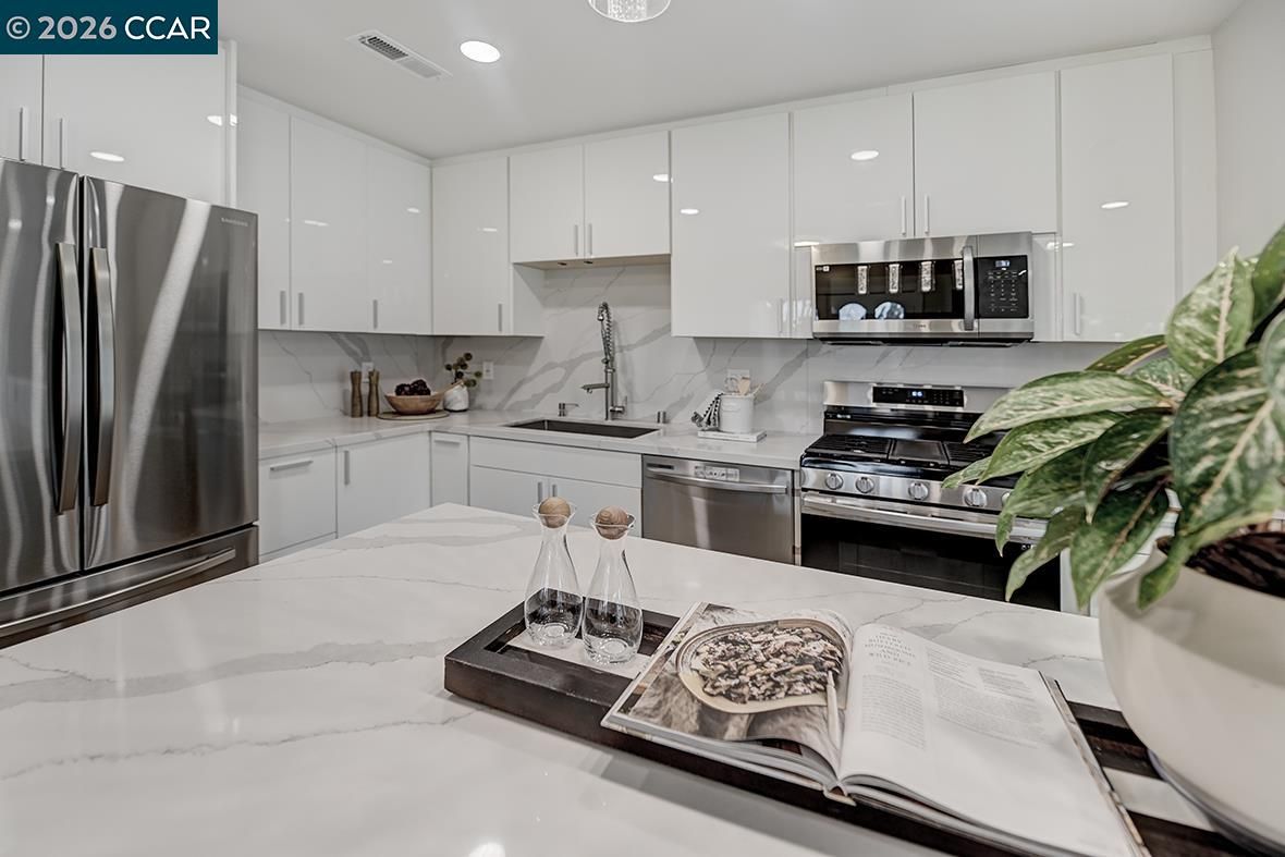 Spectacular totally remodeled Yosemite, 2 bedroom, 2 bath, LEVEL IN beauty! Mt Diablo views from the Primary Bedroom with a peaceful park like common area.. Nestled in an exclusive single row building, this corner/end unit boasts access to open space, a stunning view, no neighbors in the front, above or below. Open floor plan, skylights and a kitchen that features a spacious island, floor to ceiling high end Mirlux cabinets, quartz countertops, and stainless steel appliances. The dining room showcases a stunning soft gray built in full wall buffet cabinetry. Hard surface flooring throughout. Fully enclosed patio off the kitchen and living room has an open panel gate for visibility out to the front grassy area. Truly unique floor plan culminates in an expansive master bedroom with a spacious walk in closet. Two bathrooms with beautifully tiled showers. Hidden stacked washer/dryer. Walk to outdoor pool and lawn bowling. A MUST SEE!