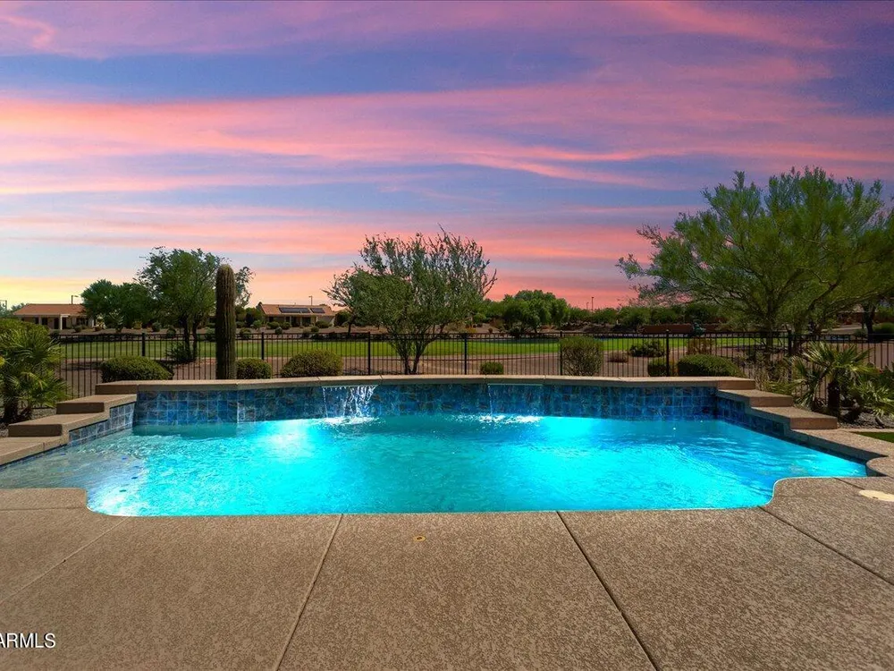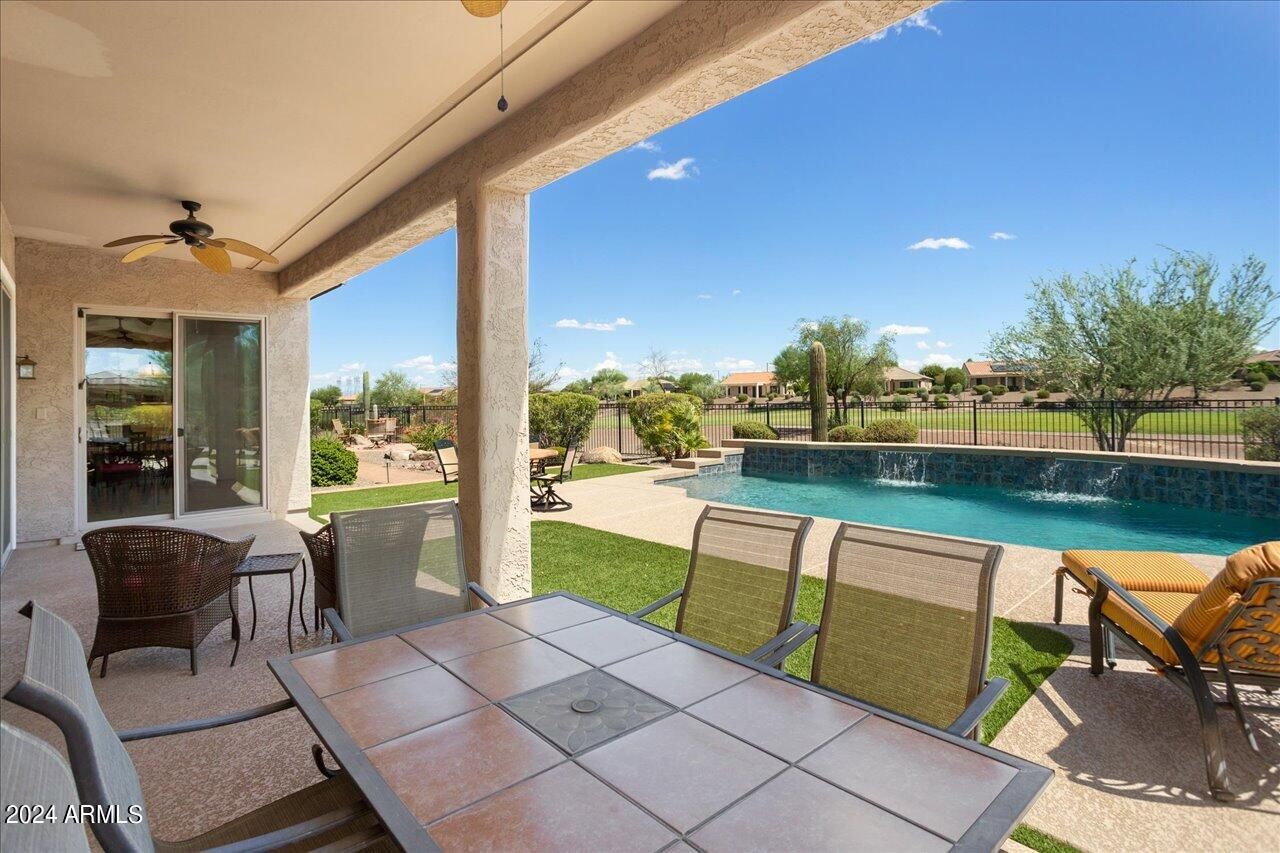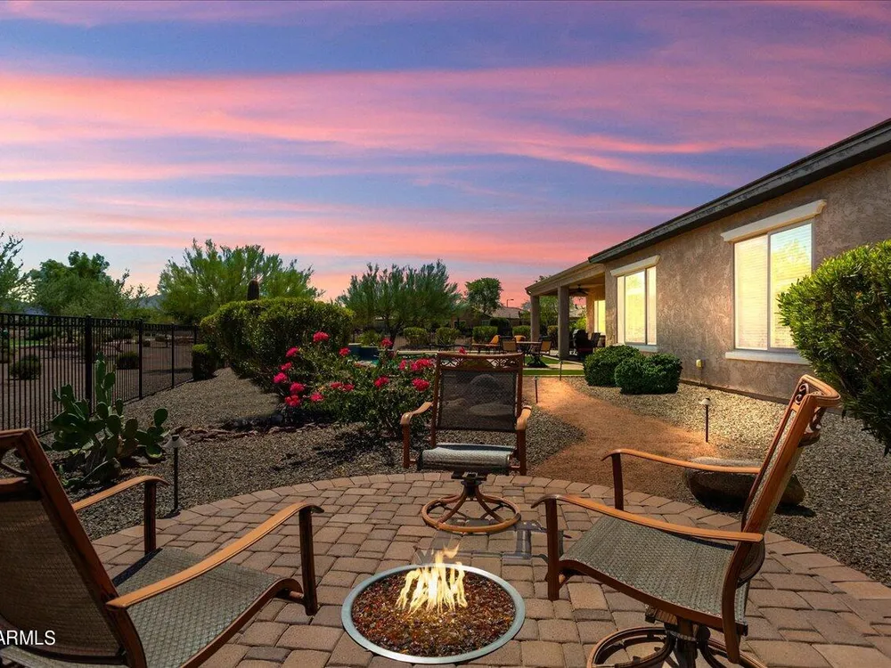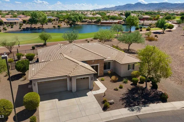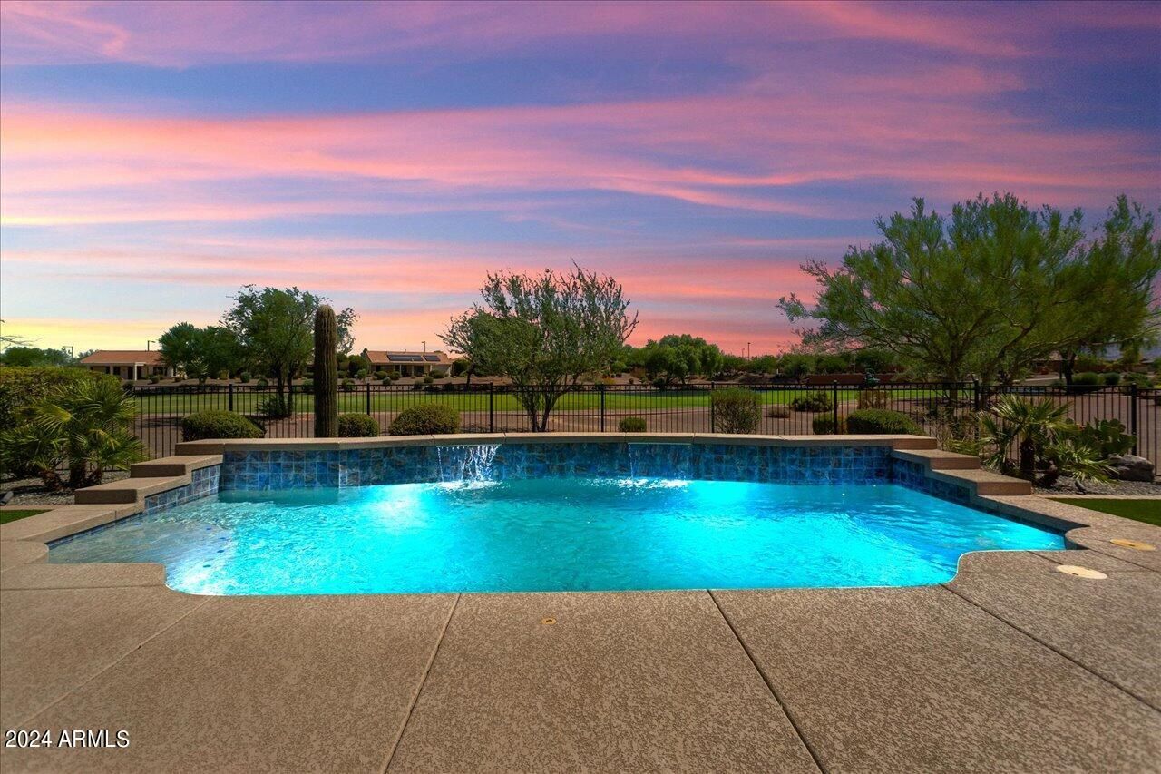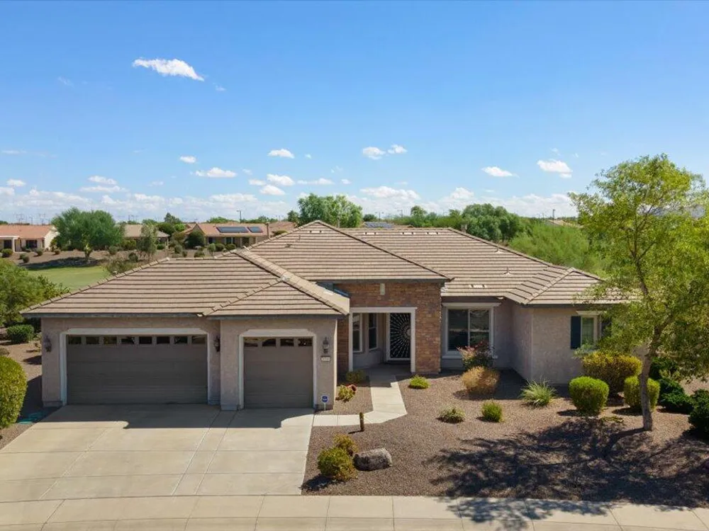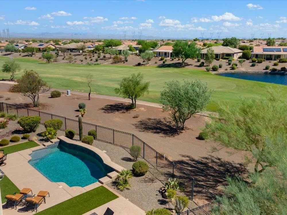 This is a very unique property in Sun City Festival, a 55+ active adult community with incomparable amenities! This 3-bed, 2.5 bath home features a formal dining area and a billiards room. AND the list price includes ALL furnishings. The best part is the east-facing backyard, nestled against the 5th hole on the Vista course, with a lake, fountain and mountain views! This oasis-like setting includes a pool with a heater and cooler and in-ground firepit, all perfect for entertaining. The spacious kitchen includes SS appliances and a gas cooktop. The master suite features dual vanities, shower and tub. The full-size 3-car garage includes built-in cabinets. Other special features include a Bose sound system, Brinks security, in-house vac and a new 2023 AC unit. This home is a MUST see!