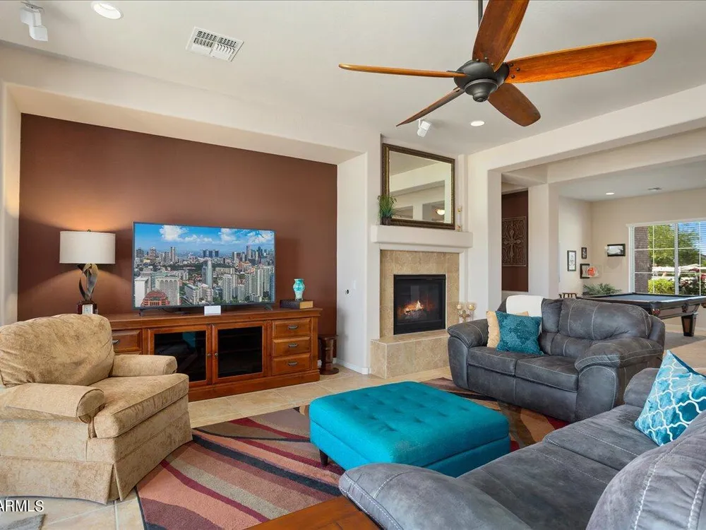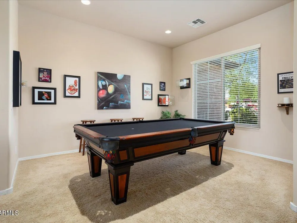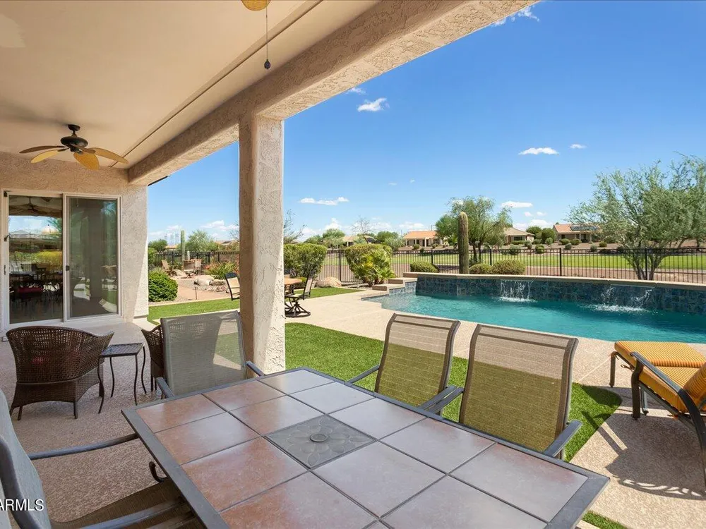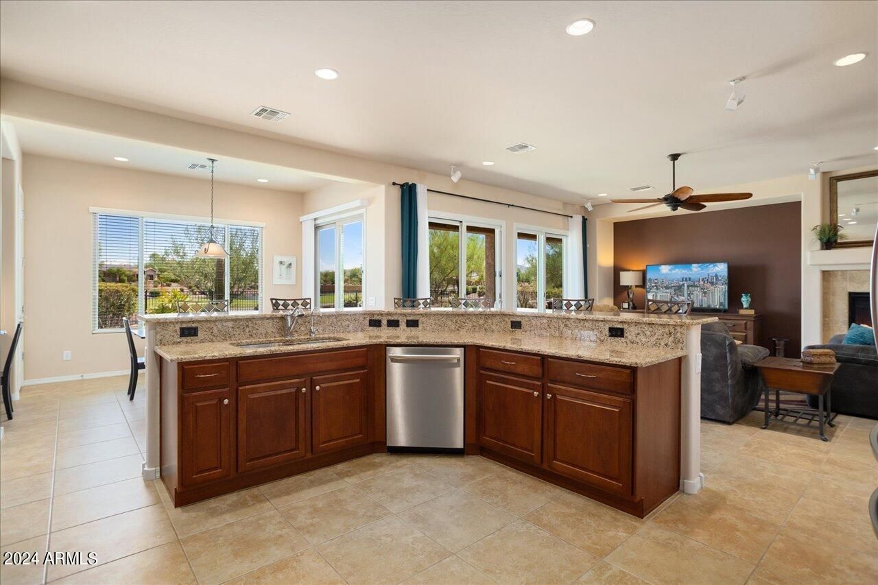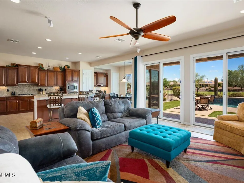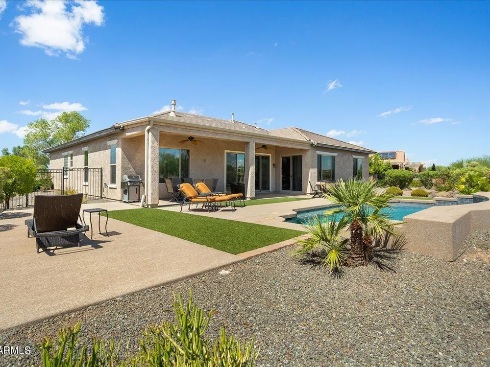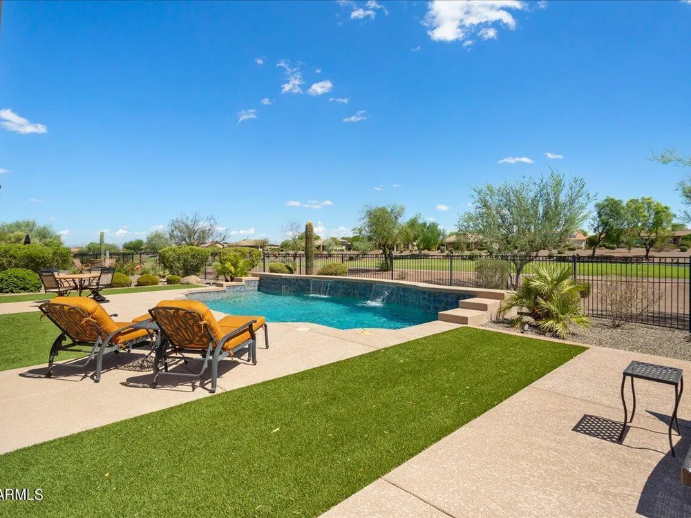 This is a very unique property in Sun City Festival, a 55+ active adult community with incomparable amenities! This 3-bed, 2.5 bath home features a formal dining area and a billiards room. AND the list price includes ALL furnishings. The best part is the east-facing backyard, nestled against the 5th hole on the Vista course, with a lake, fountain and mountain views! This oasis-like setting includes a pool with a heater and cooler and in-ground firepit, all perfect for entertaining. The spacious kitchen includes SS appliances and a gas cooktop. The master suite features dual vanities, shower and tub. The full-size 3-car garage includes built-in cabinets. Other special features include a Bose sound system, Brinks security, in-house vac and a new 2023 AC unit. This home is a MUST see!