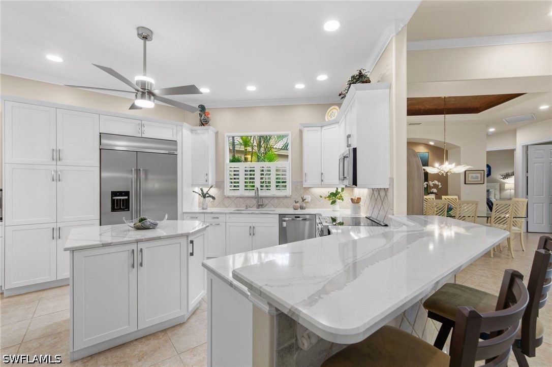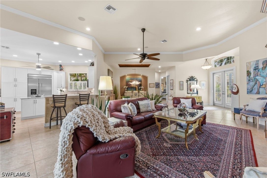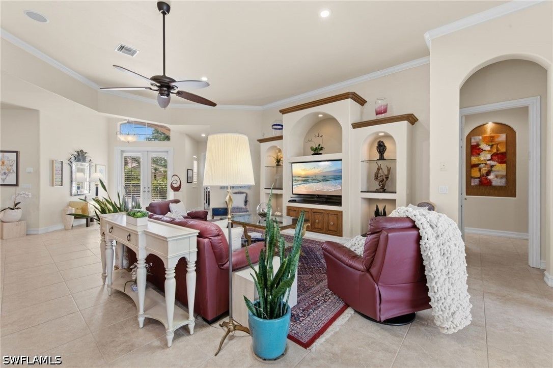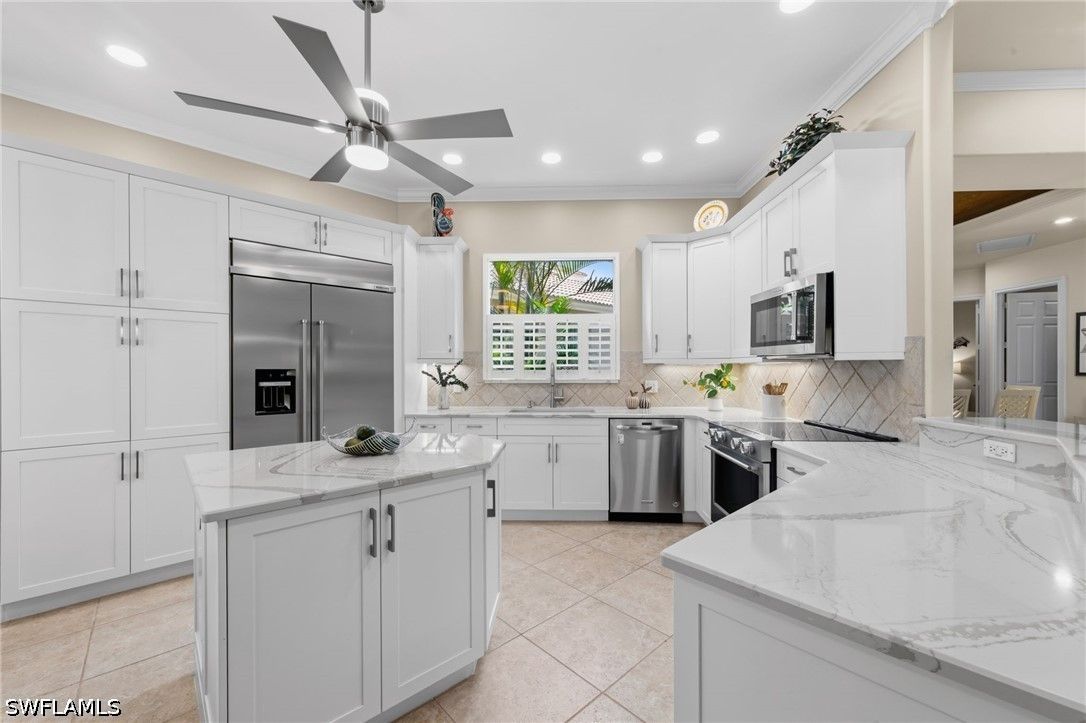 Welcome to 20194 Markward Crossing, nestled within the desirable Villa Grande enclave of Grandezza. This beautifully updated 3 bedroom + den, 3 bath residence offers a serene, low-maintenance lifestyle with picturesque lake and golf course views that capture the essence of Southwest Florida living. With a spacious 3-car garage and the option to be offered turnkey furnished, this home presents an effortless, move-in ready opportunity. A complete kitchen remodel anchors the home, featuring modern finishes, upgraded cabinetry, a brand-new glass top range (2026), new refrigerator (2025), and microwave (2024)—perfectly designed for both everyday living and entertaining. The open, light-filled floor plan flows seamlessly into the main living areas and out to the expansive screened lanai, where a private pool and spa create the ideal setting to relax, entertain, and enjoy tranquil views and stunning sunsets. Thoughtfully maintained and enhanced, the home includes a new roof with added gutters (2020), air-conditioning system (2019), water heater (2019), solar pool heater (2021), and a whole-house water filtration system (2023), along with comprehensive storm protection featuring both manual and electric shutters—providing efficiency, protection, and peace of mind. Residents of Grandezza enjoy access to a private championship golf course, fitness center, tennis, and a resort-style pool with poolside food and beverage service, all complemented by an active social calendar. Ideally located near shopping, dining, Hertz Arena, and Southwest Florida International Airport, this home offers both convenience and a vibrant lifestyle.