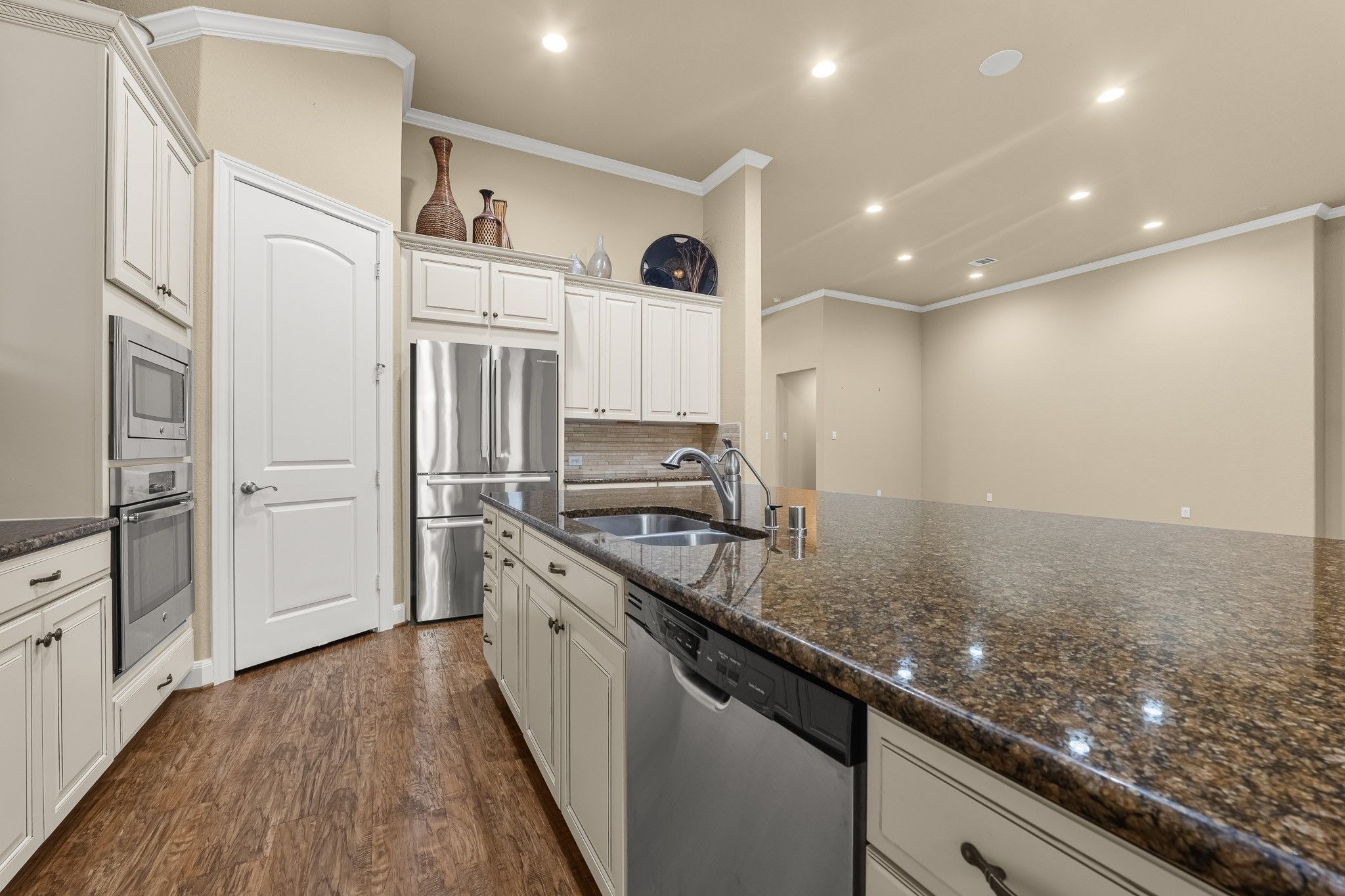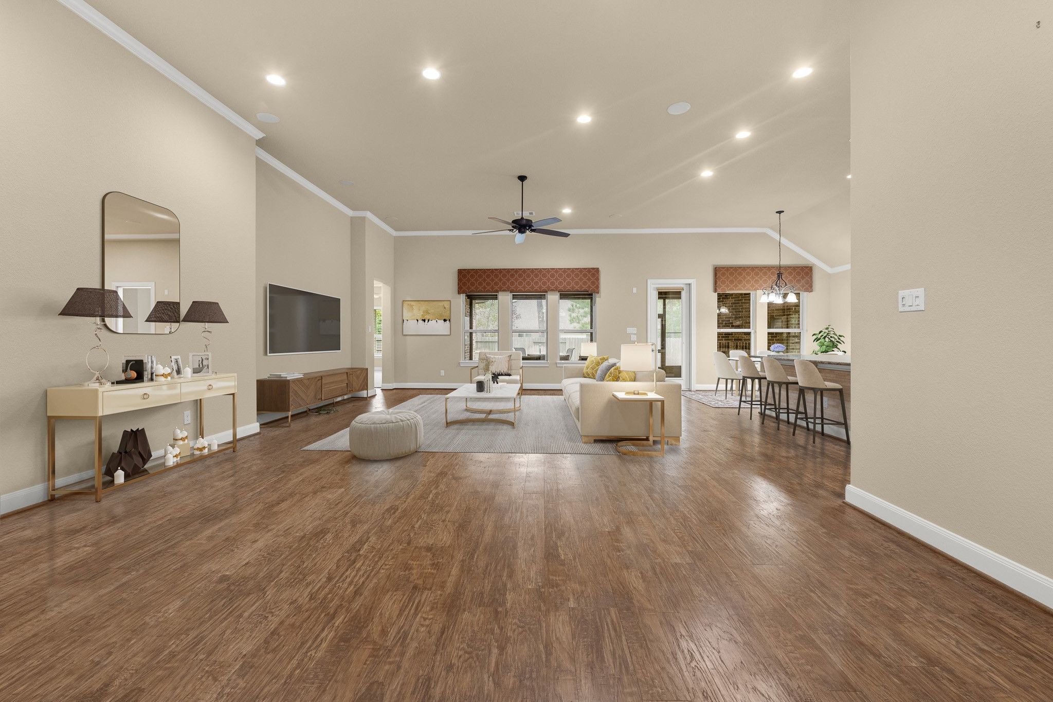 - Breakfast Bar, Crown Molding, Entrance Foyer, Granite Counters, High Ceilings, Kitchen Island, Kitchen/Family Room Combo, Pots & Pan Drawers, Pantry, Self-closing Cabinet Doors, Self-closing Drawers, Separate Shower, Tub Shower, Makeup/Vanity Space, Walk-In Pantry, Wired for Sound, Window Treatments, Ceiling Fan(s), Kitchen/Dining Combo, Living/Dining Room, Programmable Thermostat