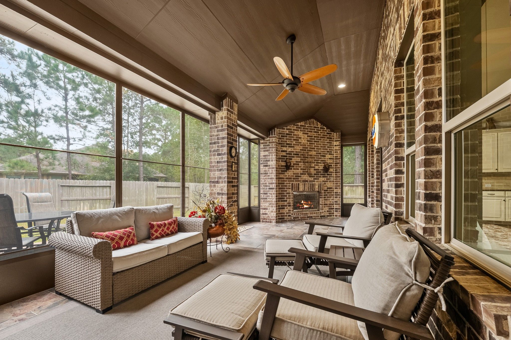 Welcome to your new home and Bonterra Lifestyle! This stunning 3 bedroom, 3 bathroom, Taylor Morrison "Monarch" model with expanded/covered outdoor patio and fireplace is the perfect blend of comfort and luxury. Enjoy the professional landscaping, mature trees and serenity as this property is nestled on cul-de-sac w/side green space. A spacious & beautifully designed residence offers an inviting OPEN concept floor plan, high-end finishes and vinyl plank flooring throughout. Fabulous Primary w/sitting area, en-suite guest bedroom and FLEX room too! Located within the master planned community of Woodforest, this vibrant 55+ community is where your NEW Lifestyle begins! Residents enjoy a wealth of amenities designed for active living, including a Concierge, Clubhouse, gym & fitness center, resort style pool, pickle & bocce ball courts & full calendar of daily events. A perfect place to enjoy an active, upscale lifestyle in a most welcoming neighborhood. Start your new adventure today!