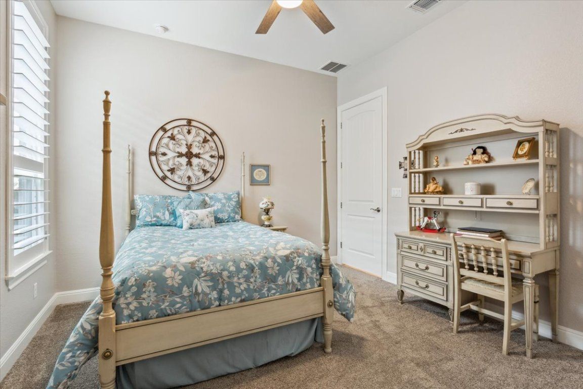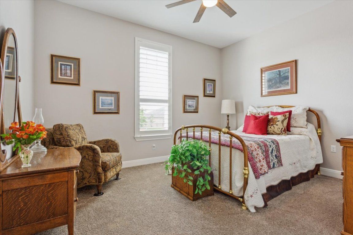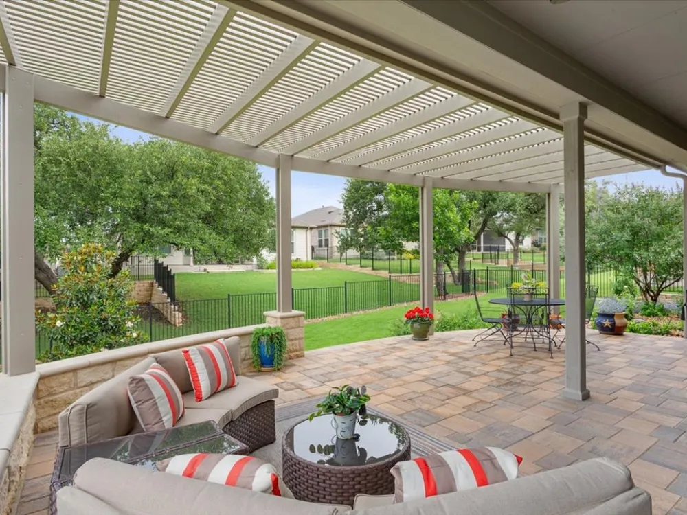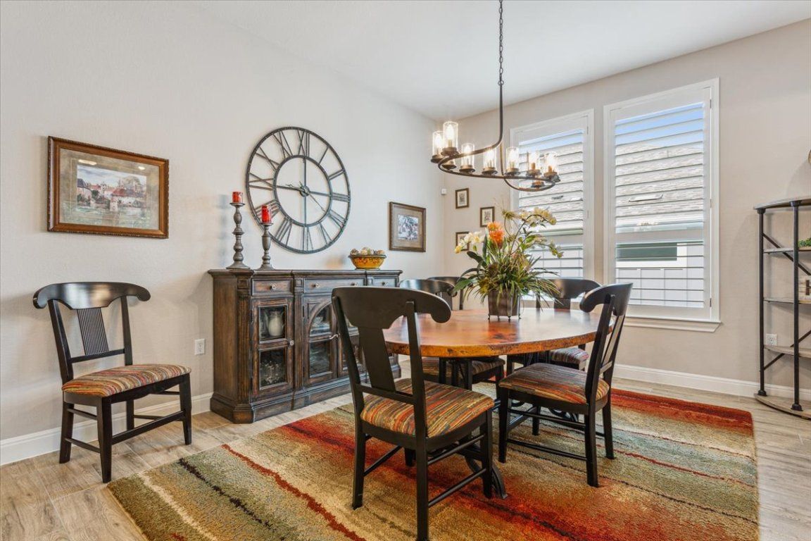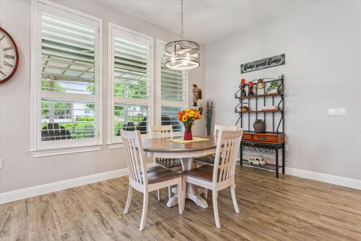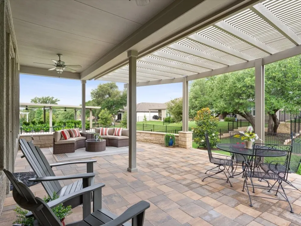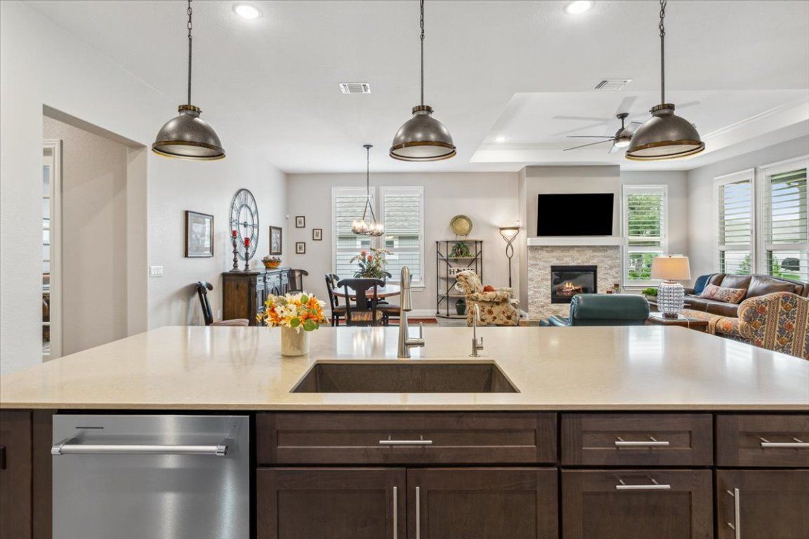 Stunning Renown floor plan in Sun City, Georgetown, offering an exceptional blend of luxury, comfort, and thoughtful upgrades throughout. This meticulously maintained home is ideal for both everyday living and effortless entertaining, with an open-concept design flowing seamlessly from the gourmet kitchen to the formal dining area and spacious gathering room. The chef’s kitchen is a standout with quartz countertops, upgraded stainless appliances including two ovens, an upgraded sink and faucet, self-closing dovetail cabinetry throughout, and pull-out shelving in all lower cabinets. Framed dropped Soffits with Crown molding accents the gathering room, primary suite, and flex space, while French doors add elegance and function to the flex room. The gathering room also includes an upgraded insulation package for year-round comfort. Retreat to a spacious primary suite featuring dual custom his/her closets & a spa-like bath with a tiled walk-in shower and wood-framed mirrors. Each guest suite includes its own full bath and walk-in closet, providing privacy and comfort for visitors. Additional highlights include plantation shutters, Hunter ceiling fans, and a laundry room with utility sink and cabinetry, and half bath. Step outside to an extended back patio with a covered roofline, plus a pergola section, and dual ceiling fans—offering plenty of room to host the neighbors year round for a Texas BBQ or simply unwind surrounded by mature trees and a blooming butterfly garden. A full 3-car garage caps off this impressive home with an additional 4' extension, insulated garage doors, R-36 attic insulation, epoxy floors, wall-mounted shelving, a tankless water heater, and a water softener system. The house also has the Holiday Package (multiple roof eve mounted electrical outlets controlled by interior wall switches) making decorating for the holidays a breeze. Interior repainted 2022 - well cared for with annual maintenance on major systems—truly move-in ready!