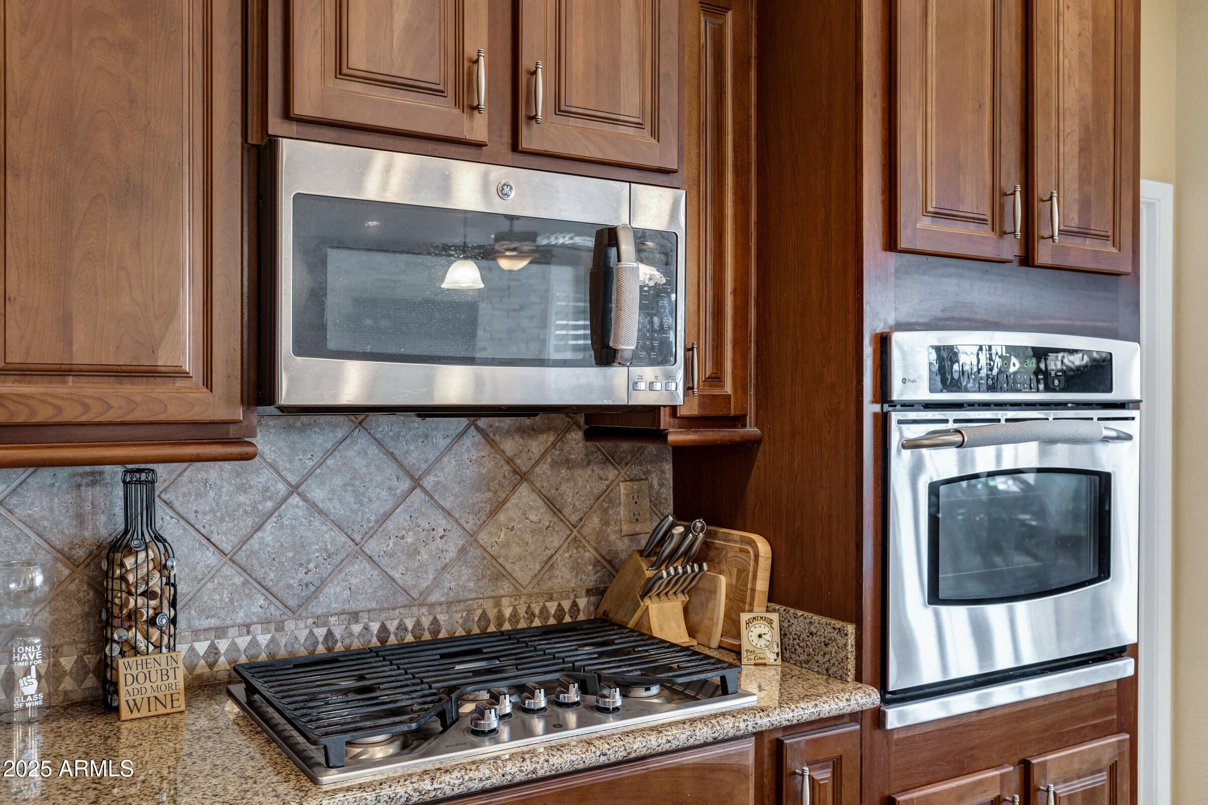 Stunning Waterfront Home in the Award-Winning Active Adult Community of Province! This popular Iris floor plan features two bedrooms with a primary retreat, two bathrooms, and an enclosed den. The backyard is an entertainer's dream, boasting an extended paver-covered patio with lakeside seating, a built-in gas BBQ, and breathtaking views of the Estrella Mountains and Arizona's gorgeous sunsets. This is retirement living at its finest! The luxury kitchen showcases staggered Cherry Spice cabinets, granite countertops, a beautiful travertine backsplash, and stainless steel appliances. A custom living room feature wall with a built-in fireplace adds a touch of elegance and warmth. Additional features include satin nickel hardware on the cabinets...