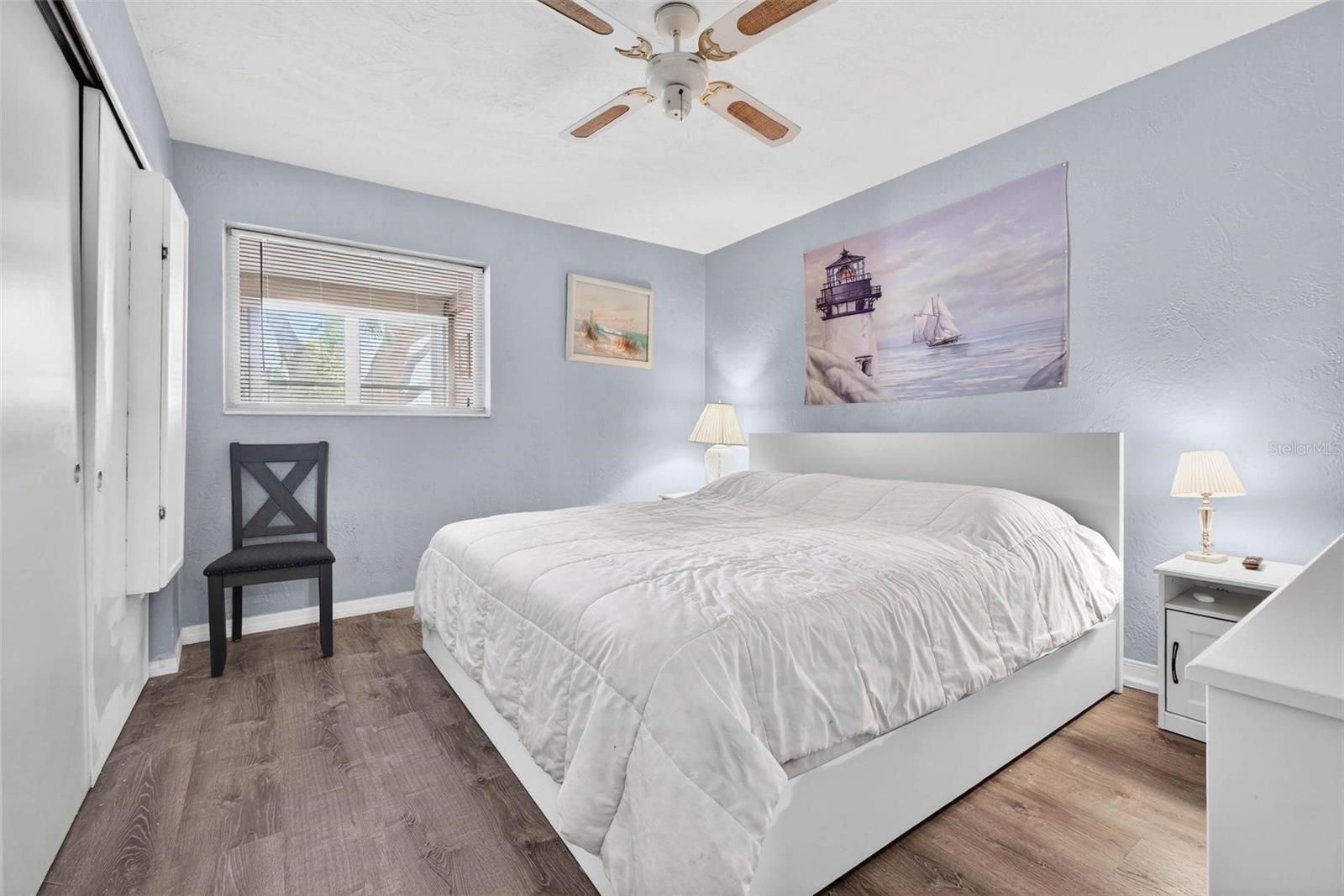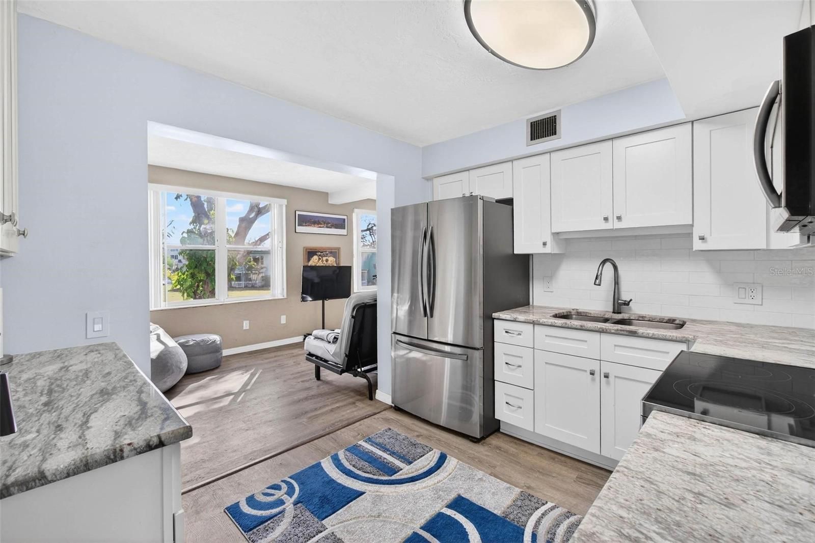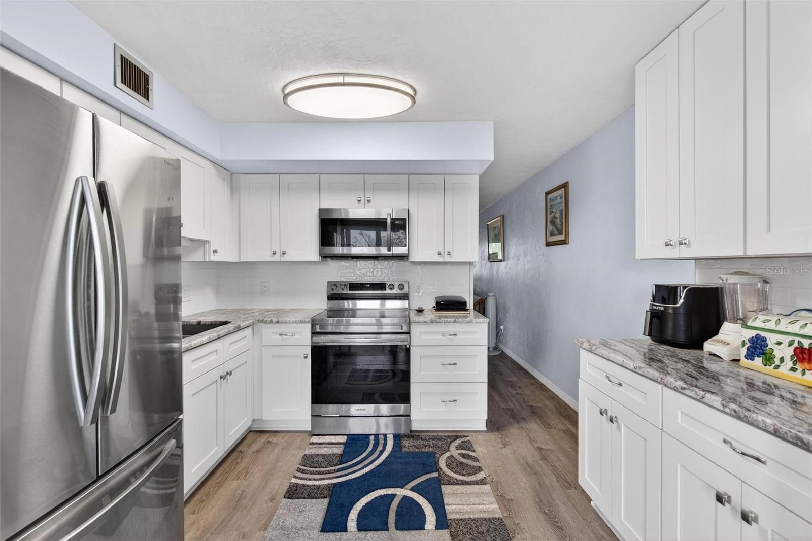 Outstanding 2 bed/1 bath, CORNER condo! Situated in a FEE SIMPLE building. With a multitude of upgrades, this spectacular condo exudes excellence. Upon arrival, you will be greeted by magnificent, luxury vinyl flooring, covering the vast majority of the home. NO CARPET ANYWHERE! The Impact Resistant front windows provide added protection and long-term peace of mind. Indulge your culinary desires in this impressive kitchen, complemented with granite countertops, stainless steel appliances, and stunning soft close cabinetry. Not to mention, extra side cabinets; with even more granite! Beyond the kitchen, relax and unwind in the Florida Room. Notice the hurricane rated back door, just steps away from the elevator, laundry, and storage room. Both bedrooms offer generous closet space. For added peace of mind, major upgrades include a replaced electrical panel in 2022, and HVAC replaced in May of 2023. Schedule your private showing today! Assigned parking. The 55+ community has two activity centers, and two private golf courses with 9 and 18 holes, free exclusively for residents & owners. There are two heated swimming pools. The remodeled Cardio Gym has the latest exercise equipment. A very pet-friendly community, there is a fenced dog park with covered seating. There are hobby studios, and a wood shop for the exclusive use of the residents. Activities include fitness classes, dancing, clubs, cards, billiards, entertainment, classes, and much more. The on-site Good Karma Café has take & bake meals and snacks. Close to beaches, transportation, shopping, entertainment, and fine dining. All room sizes, floor plans and square footage are approximate. This property is being transferred by a leasehold estate deed. Association approval is required. If financing, a 35% down payment is required.