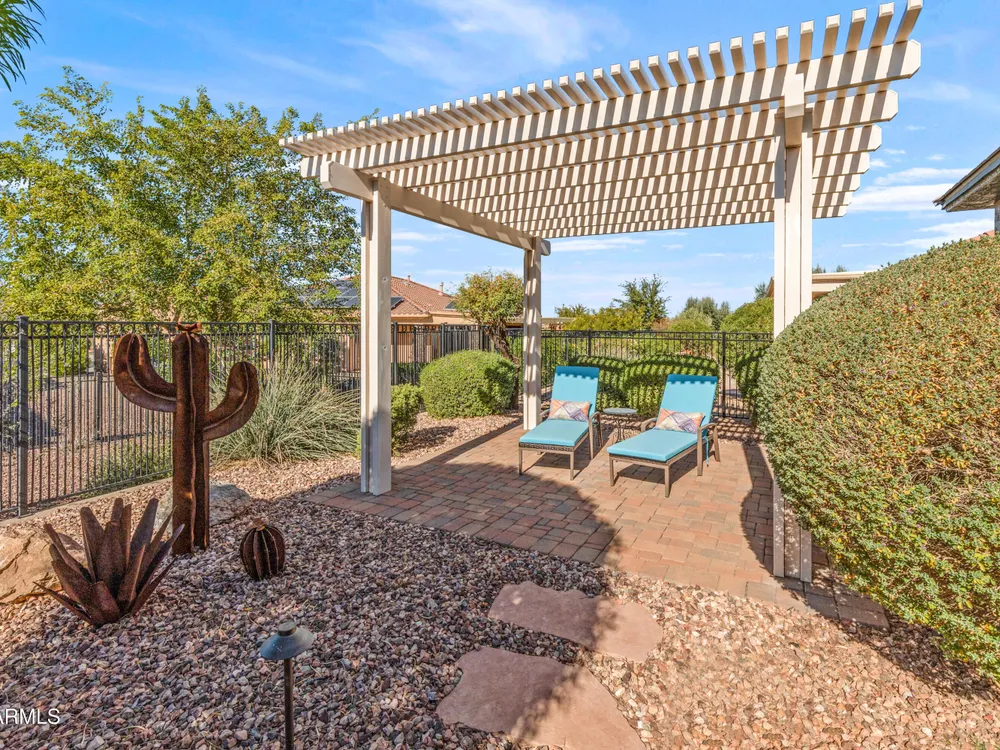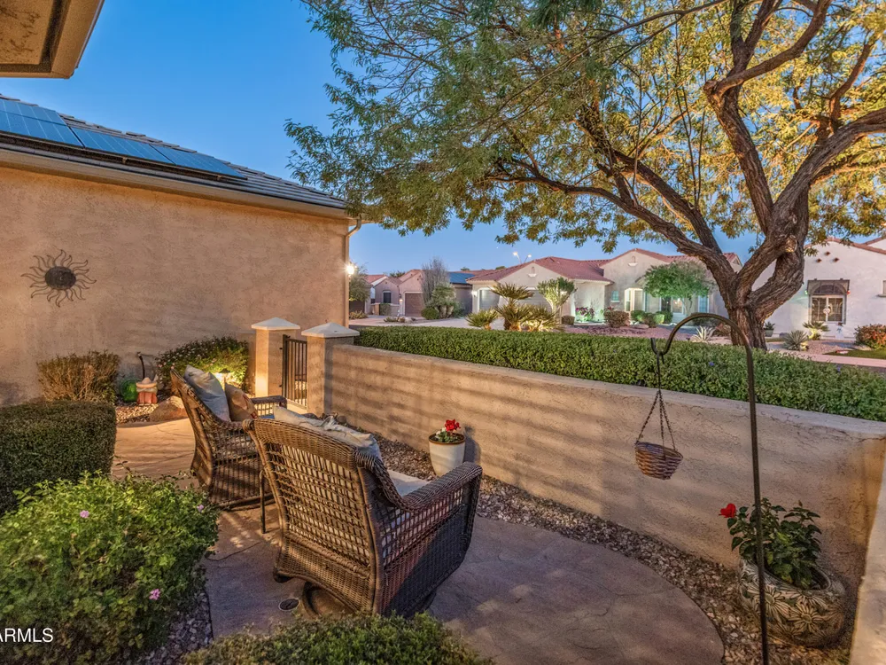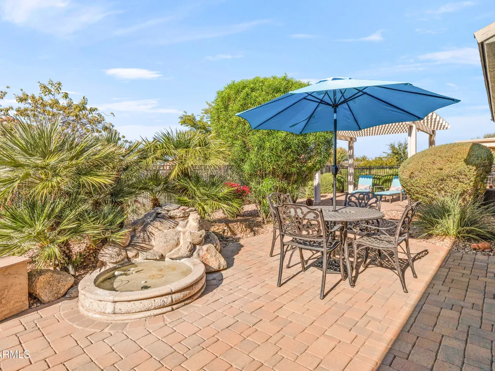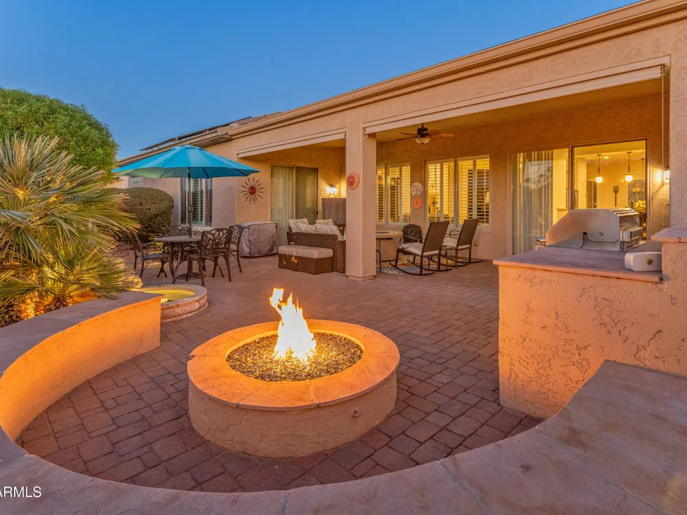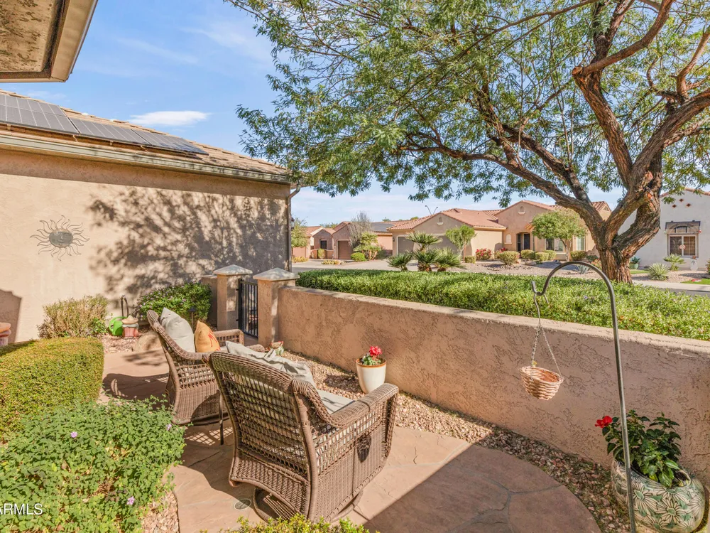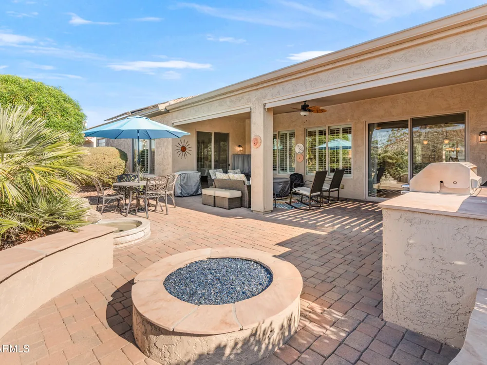 Model-Perfect Fiesta Floor Plan with Owned Solar: This meticulously maintained 2-bedroom, 2-bath + office/den home offers the ideal blend of style, function & comfort. The moment you step into the private front courtyard you'll feel the warm desert charm this home exudes. Inside the expansive Chef's kitchen shines with granite countertops, a generous prep island, breakfast bar & an adjoining café space—perfect for casual meals or entertaining. The open-concept great room features a stylish interior gas fireplace, adding warmth & ambiance to your main living area. Step outside to the backyard retreat with a covered patio, extended pergola, water feature & a built-in grill & firepit—ideal for entertaining or enjoying quiet, star-filled nights. Other highlights include a spacious 3-car garage with epoxy flooring & storage, energy-efficient owned solar system & a versatile den for work or guests.Just a short walk to the Sage Recreation Center & all the world-class amenities Sun City Festival is known for!