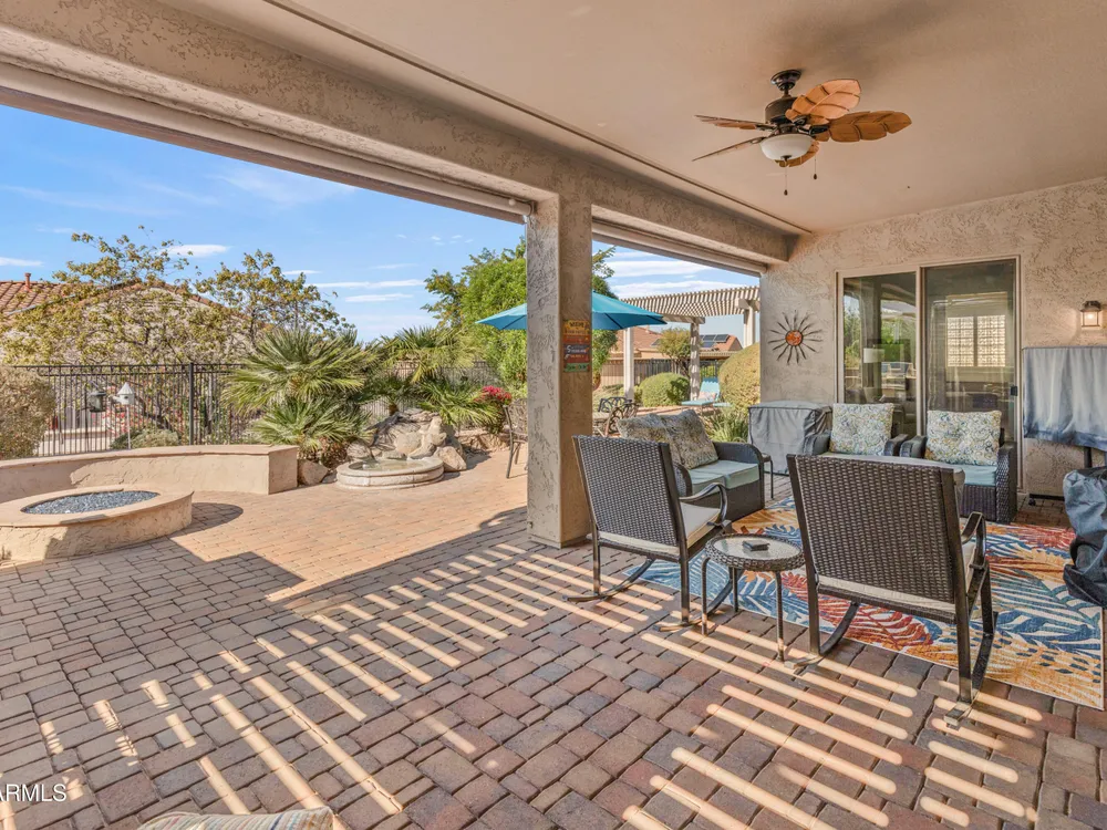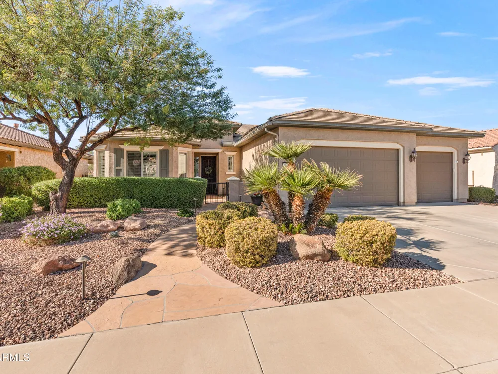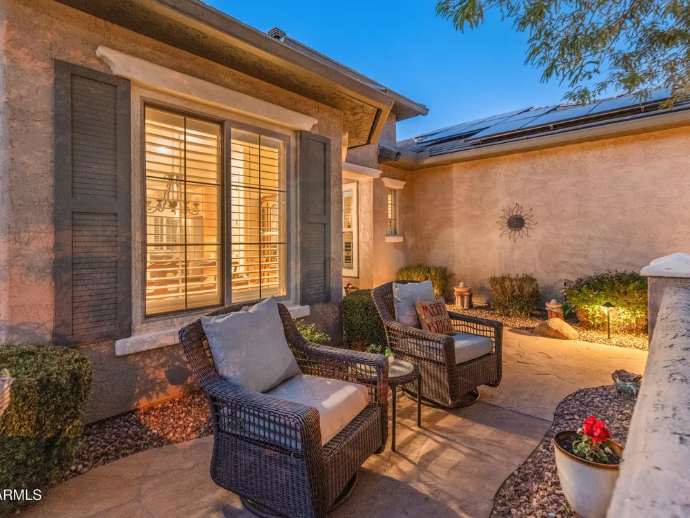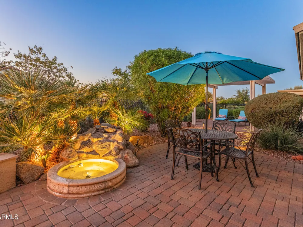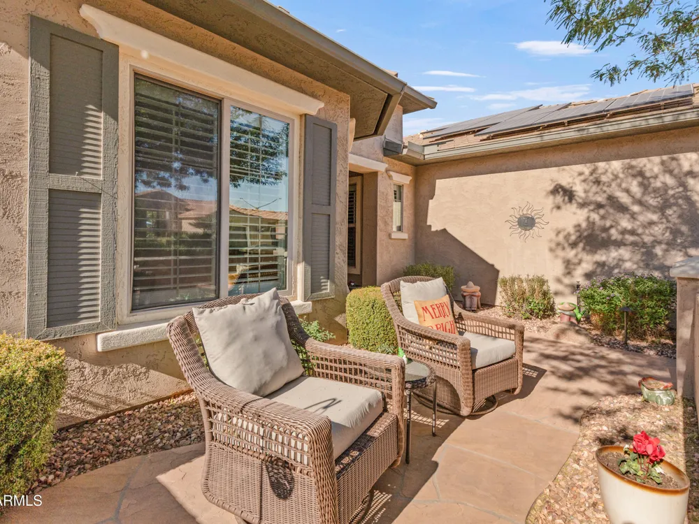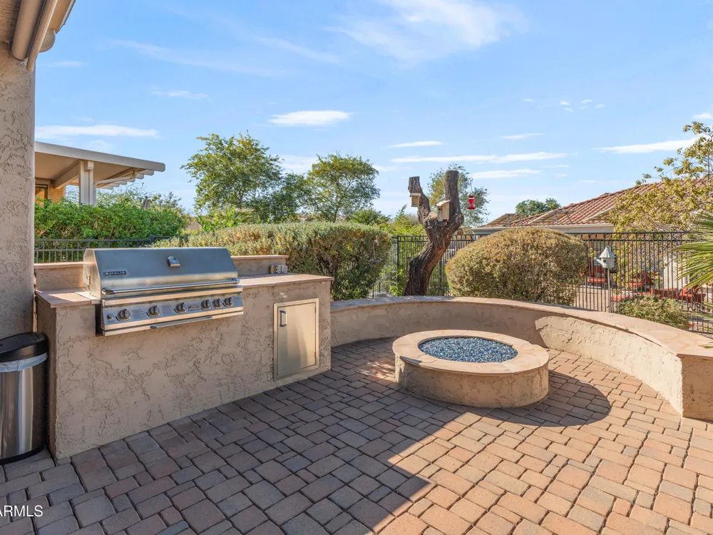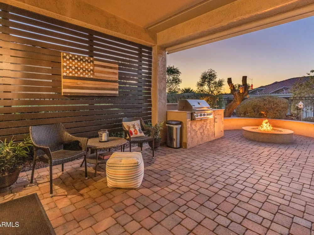Model-Perfect Fiesta Floor Plan with Owned Solar: This meticulously maintained 2-bedroom, 2-bath + office/den home offers the ideal blend of style, function & comfort. The moment you step into the private front courtyard you'll feel the warm desert charm this home exudes. Inside the expansive Chef's kitchen shines with granite countertops, a generous prep island, breakfast bar & an adjoining café space—perfect for casual meals or entertaining. The open-concept great room features a stylish interior gas fireplace, adding warmth & ambiance to your main living area. Step outside to the backyard retreat with a covered patio, extended pergola, water feature & a built-in grill & firepit—ideal for entertaining or enjoying quiet, star-filled nights. Other highlights include a spacious 3-car garage with epoxy flooring & storage, energy-efficient owned solar system & a versatile den for work or guests.Just a short walk to the Sage Recreation Center & all the world-class amenities Sun City Festival is known for!