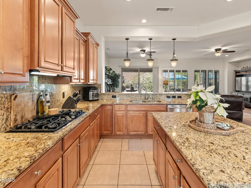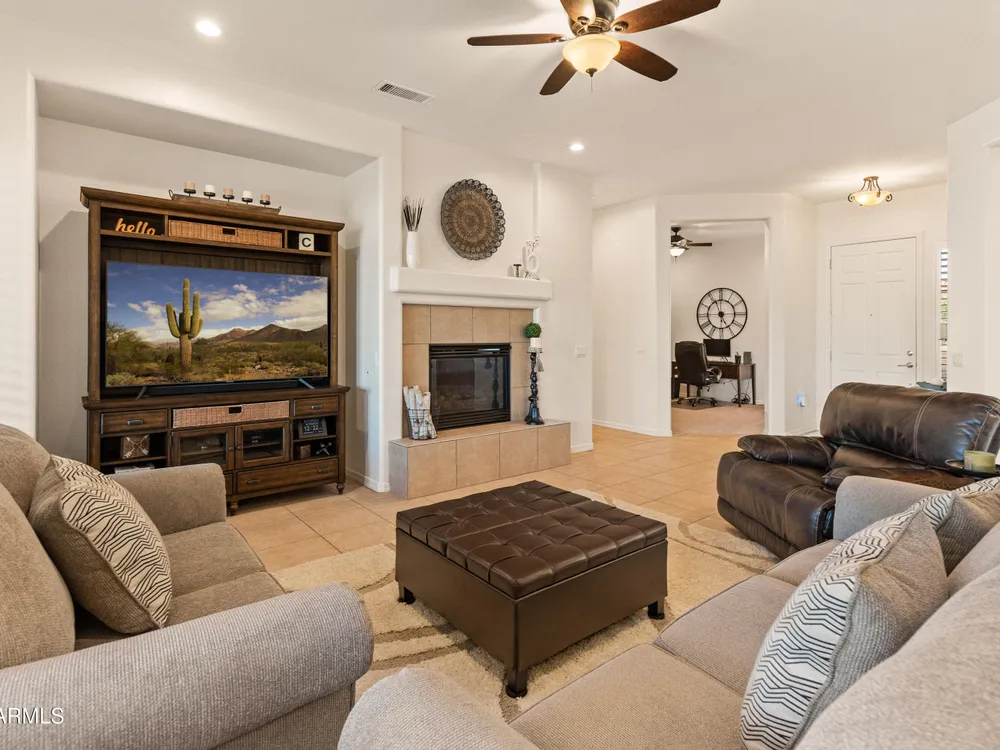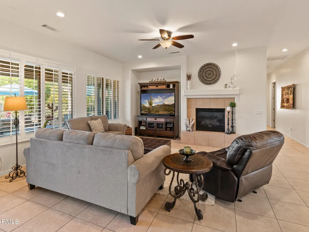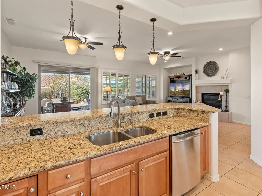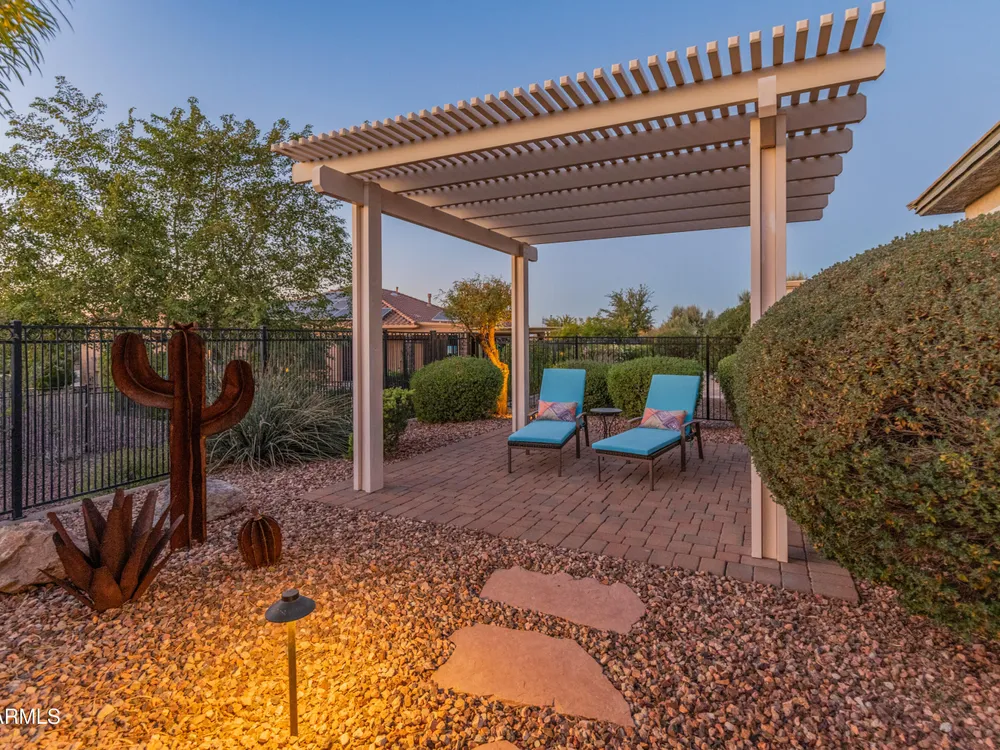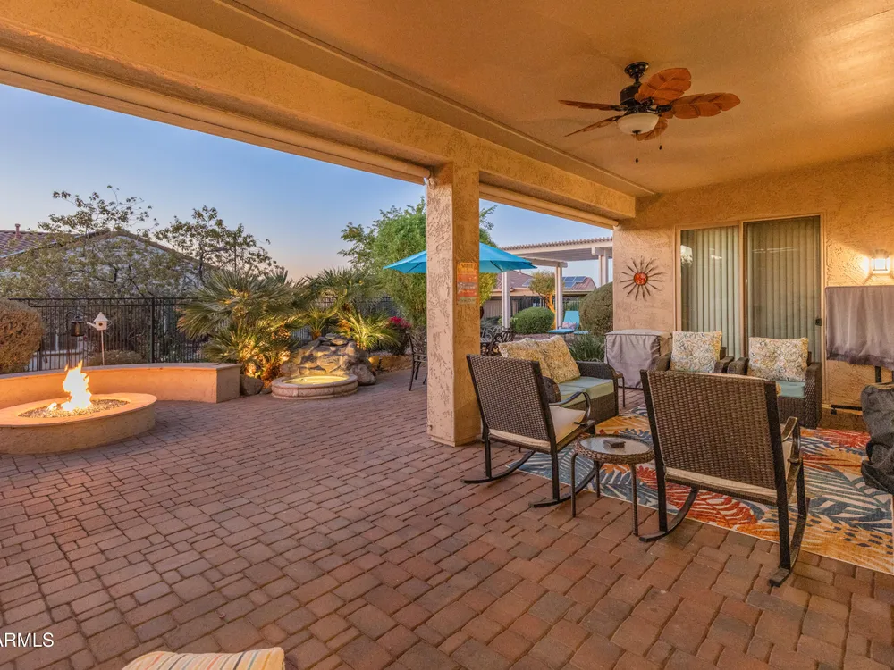 Model-Perfect Fiesta Floor Plan with Owned Solar: This meticulously maintained 2-bedroom, 2-bath + office/den home offers the ideal blend of style, function & comfort. The moment you step into the private front courtyard you'll feel the warm desert charm this home exudes. Inside the expansive Chef's kitchen shines with granite countertops, a generous prep island, breakfast bar & an adjoining café space—perfect for casual meals or entertaining. The open-concept great room features a stylish interior gas fireplace, adding warmth & ambiance to your main living area. Step outside to the backyard retreat with a covered patio, extended pergola, water feature & a built-in grill & firepit—ideal for entertaining or enjoying quiet, star-filled nights. Other highlights include a spacious 3-car garage with epoxy flooring & storage, energy-efficient owned solar system & a versatile den for work or guests.Just a short walk to the Sage Recreation Center & all the world-class amenities Sun City Festival is known for!