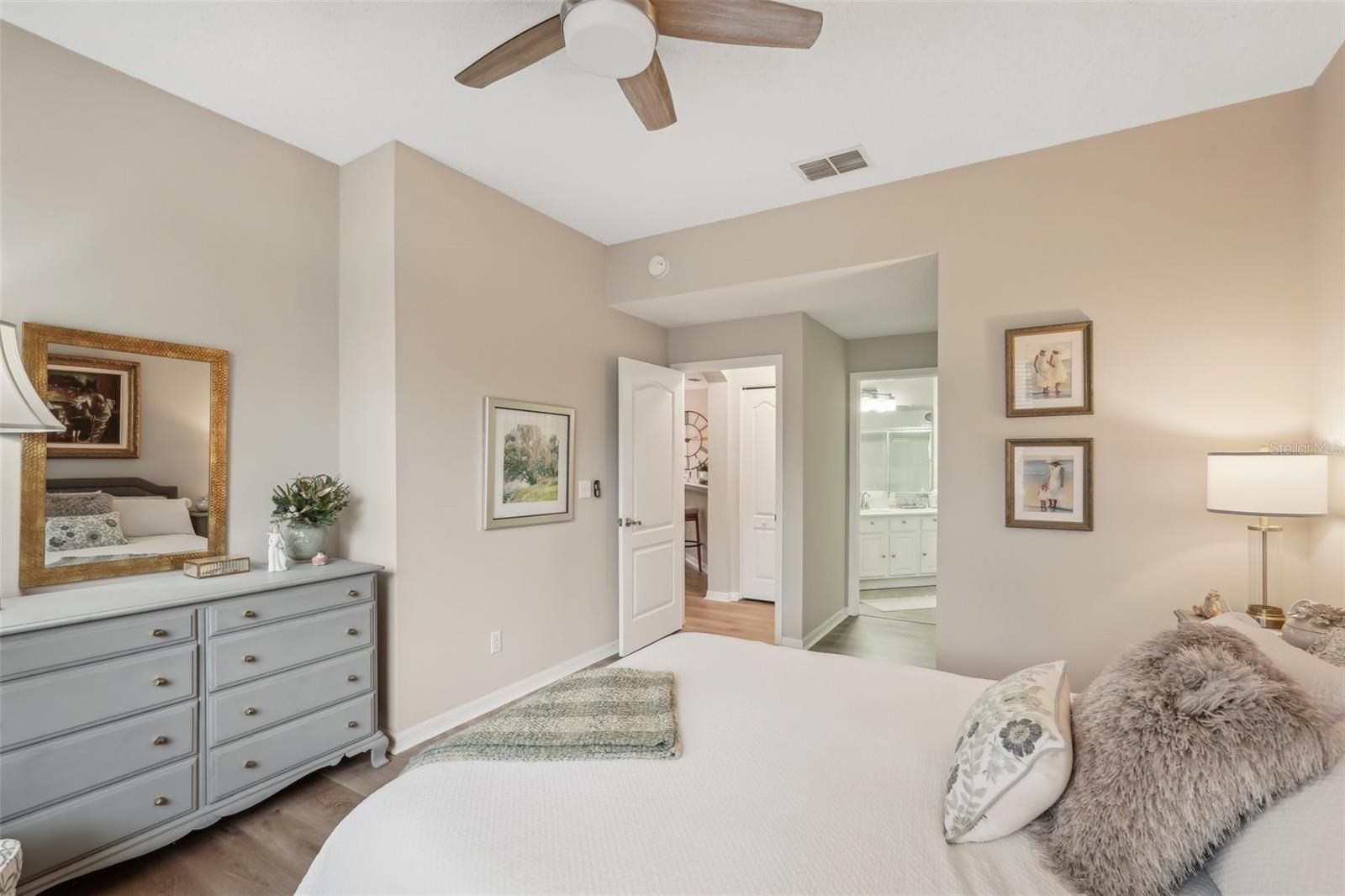 - Ceiling Fan(s), Eat-in Kitchen, High Ceilings, Kitchen/Family Room Combo, Living/Dining Room, Open Floorplan, Solid Surface Counters, Solid-Wood Cabinets, Split Bedrooms, Walk-In Closet(s)