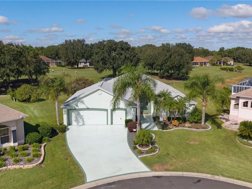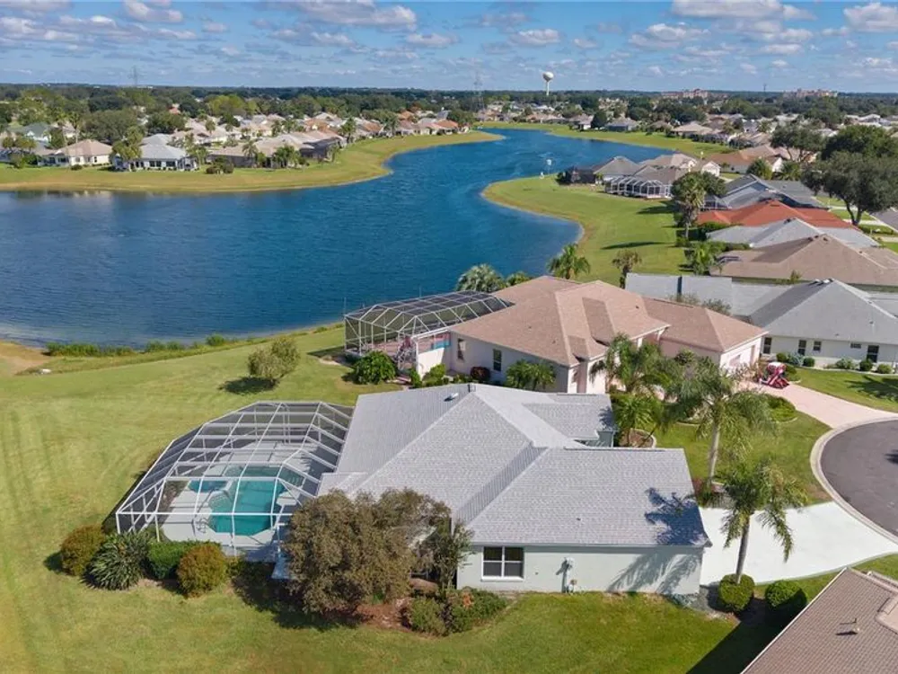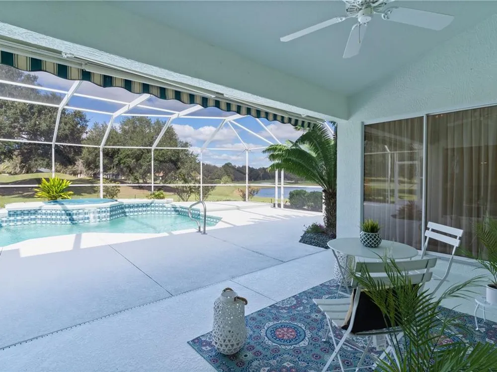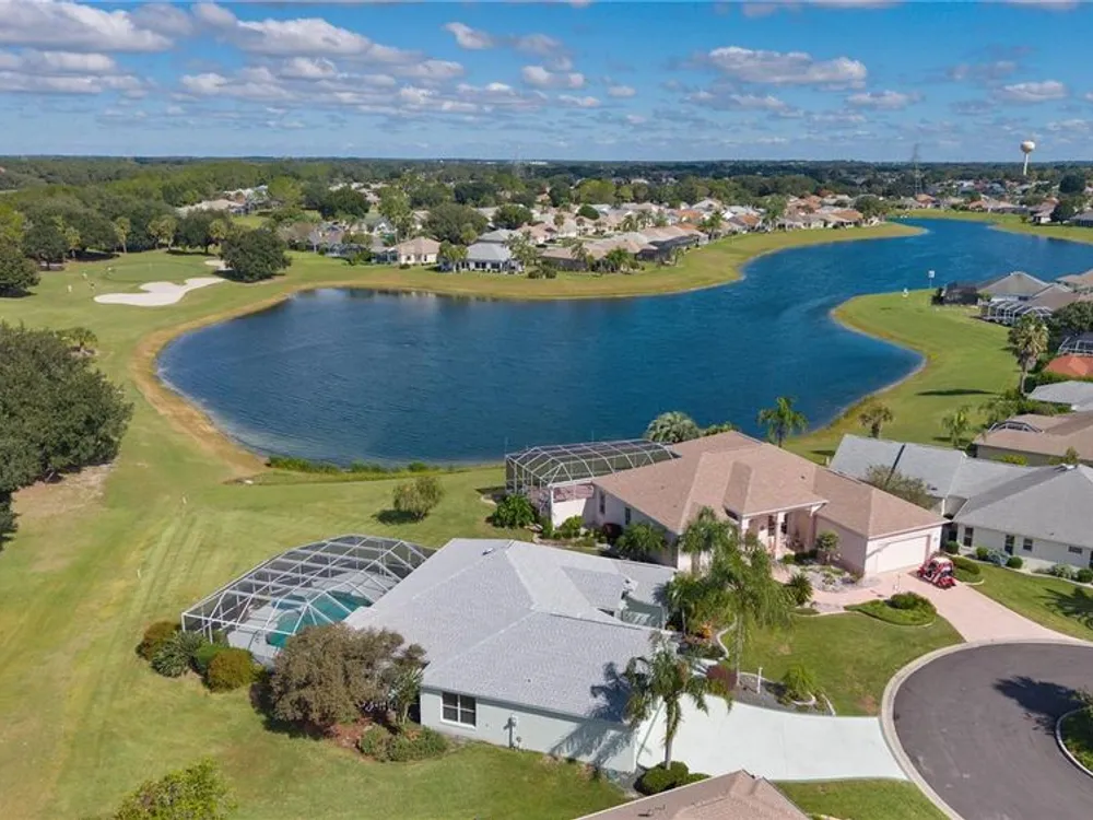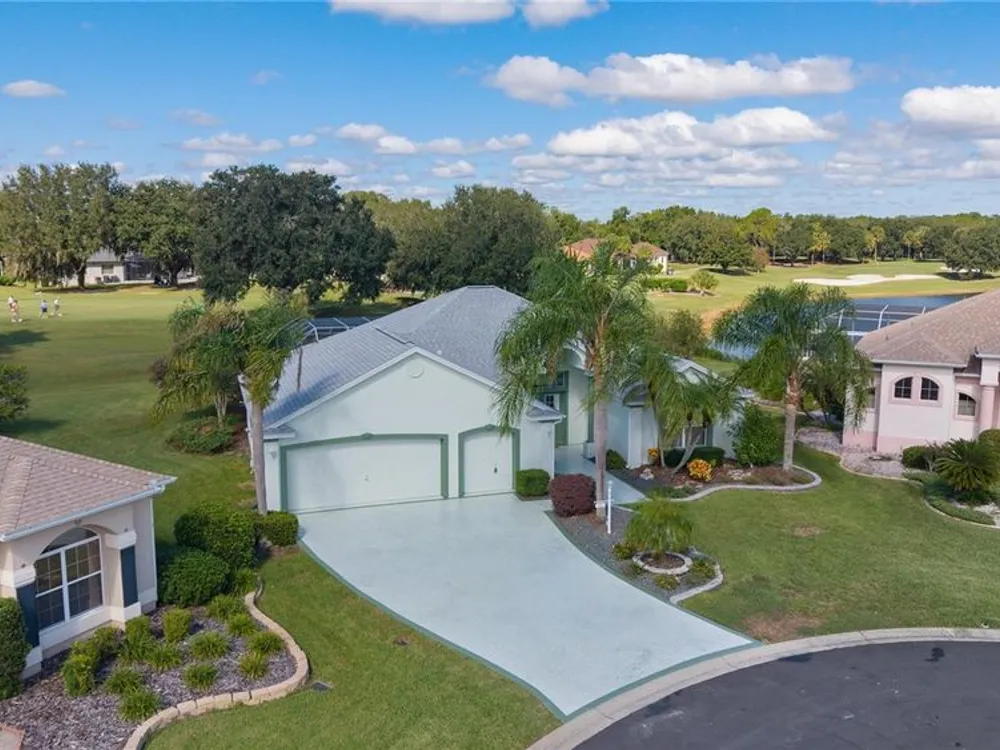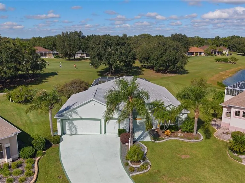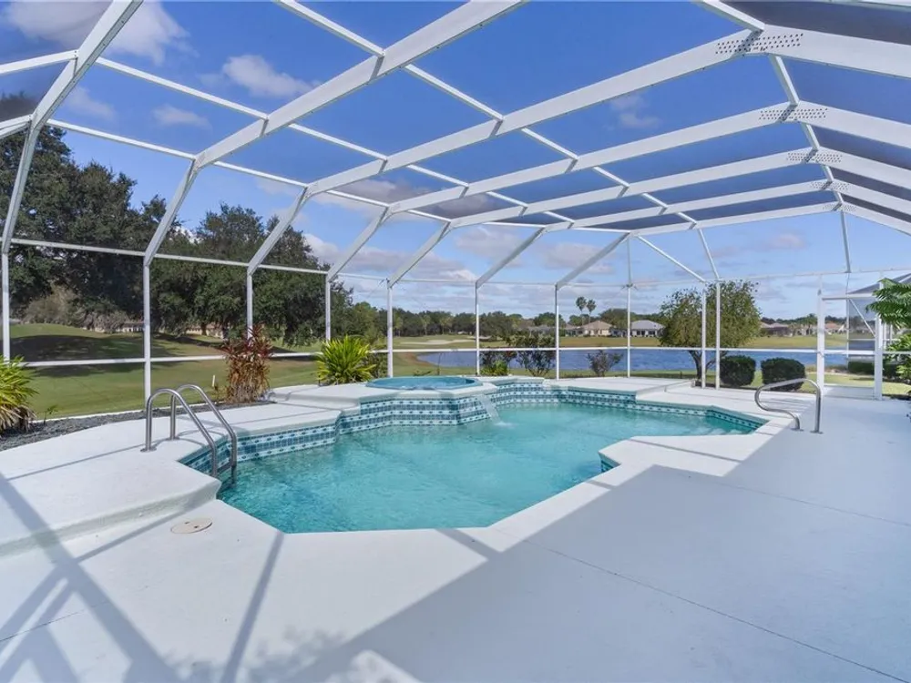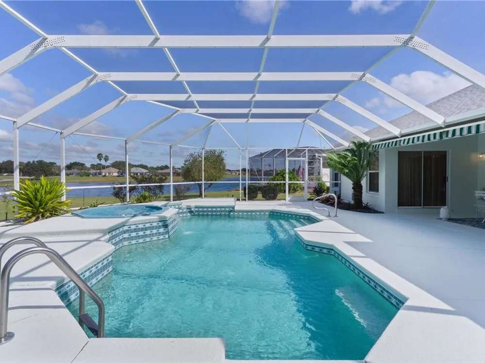 Welcome home to this gorgeous Golf Front Home on the second hole of the Tierra Del Sol Championship Golf Course in The Villages, the world's largest 55+ community. You'll notice the highly desired two car plus golf cart garage, mature landscaping, hardscaping, freshly painted driveway, sidewalk and exterior of the home as you approach with a grand entry through double doors. Once inside, your eyes will be drawn to the stunning golf course and lake views just beyond your private pool and spa under a beautiful birdcage. Natural light floods the interior of the home through multiple windows. High ceilings expand the living area and the freshly painted light and bright walls and painted ceilings allow the natural light to illuminate the entire home beautifully. New, high-end luxury plank flooring adds the simple elegance that makes you feel right at home. The large, eat-in kitchen is bright and airy and provides another stunning view from your breakfast nook with sliding doors giving access to your covered patio and pool deck. Situated off of the kitchen, you'll love this versatile space (formal dining room) with double pocket doors which, due to its privacy, could be used as an additional entertaining space, office space or even a guest bedroom. The possibilities are endless! Your primary bedroom ( located on the opposite side of the home) is expansive and bright with its own grand double door entry. The en-suite bathroom has a large walk-in closet, double sink vanity and stand up shower. Sliding doors allow access and additional light and views to the patio/pool deck. The guest suite is located at the front of the home for maximum privacy with a beautiful window and lots of natural light. The guest bathroom has a tub/shower combo perfect for guests of all ages. The garage floor has a new epoxy coating and the inside laundry room adds convenience. Located on a cul-de-sac with an oversized lot, you'll enjoy the grandeur and privacy. Close to Spanish Springs and Lake Sumter Landing, this location has it all. ROOF is 2022. The BOND is paid. Start living the retirement life you've dreamed of today!