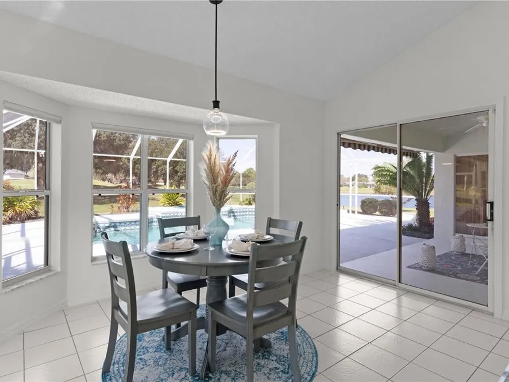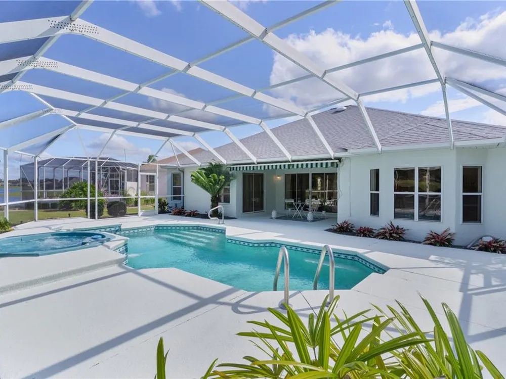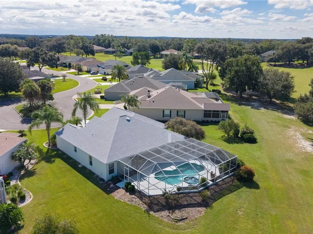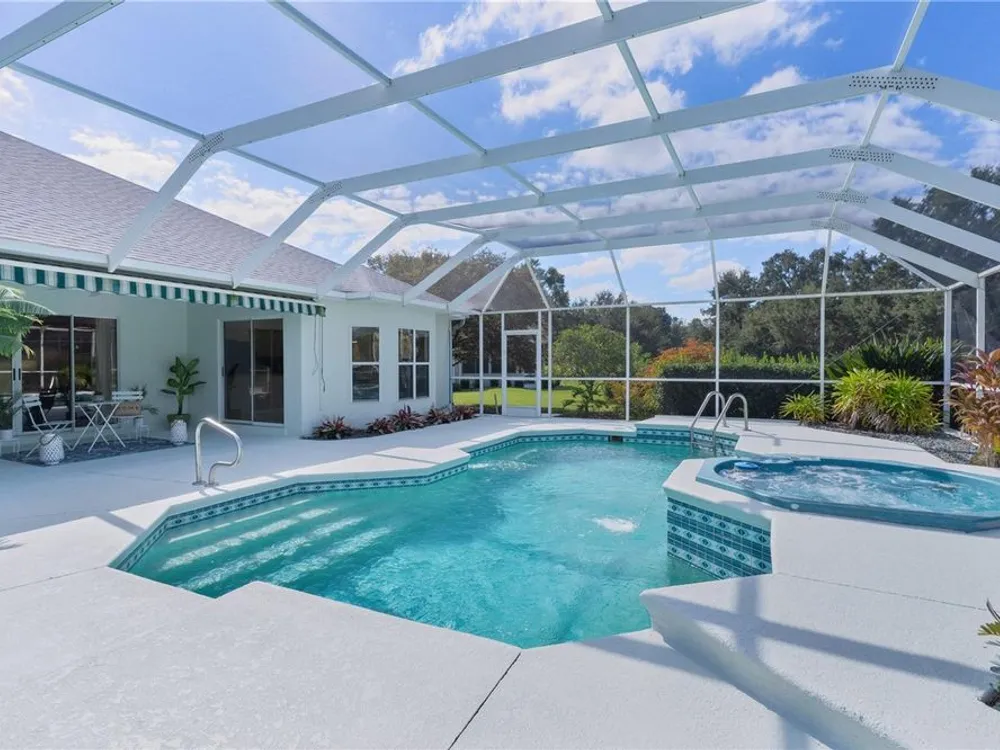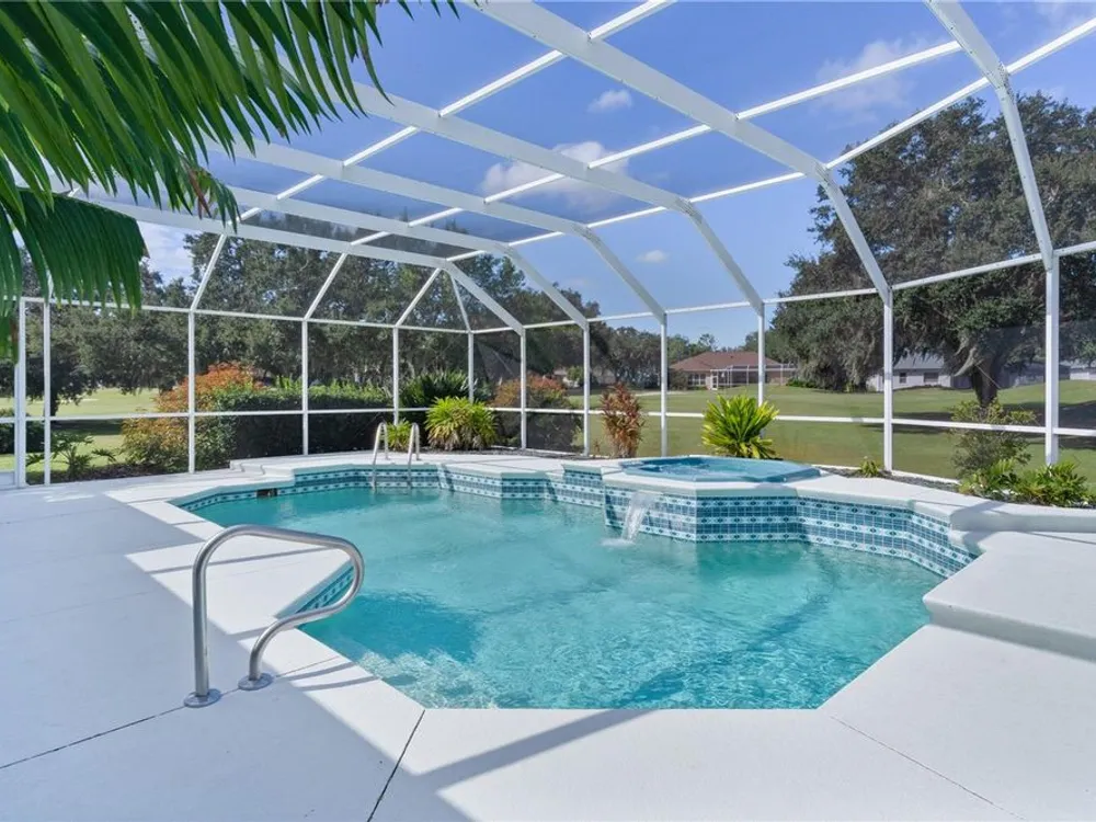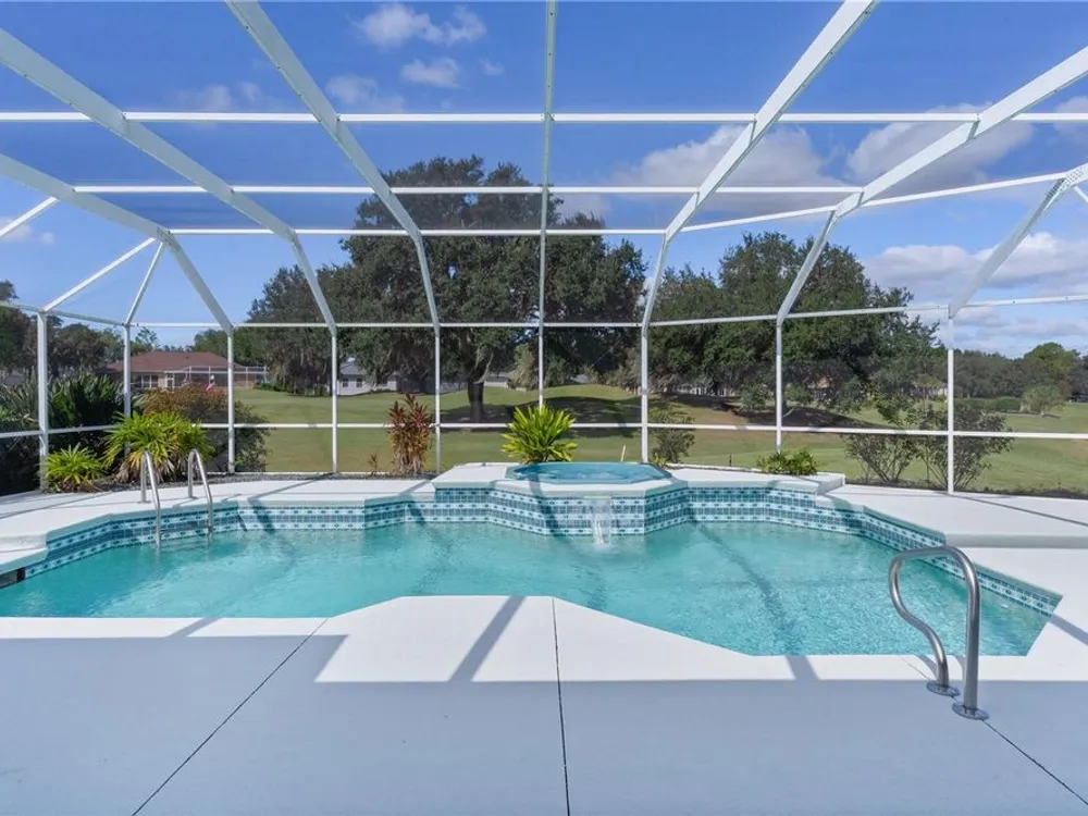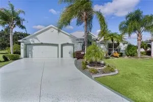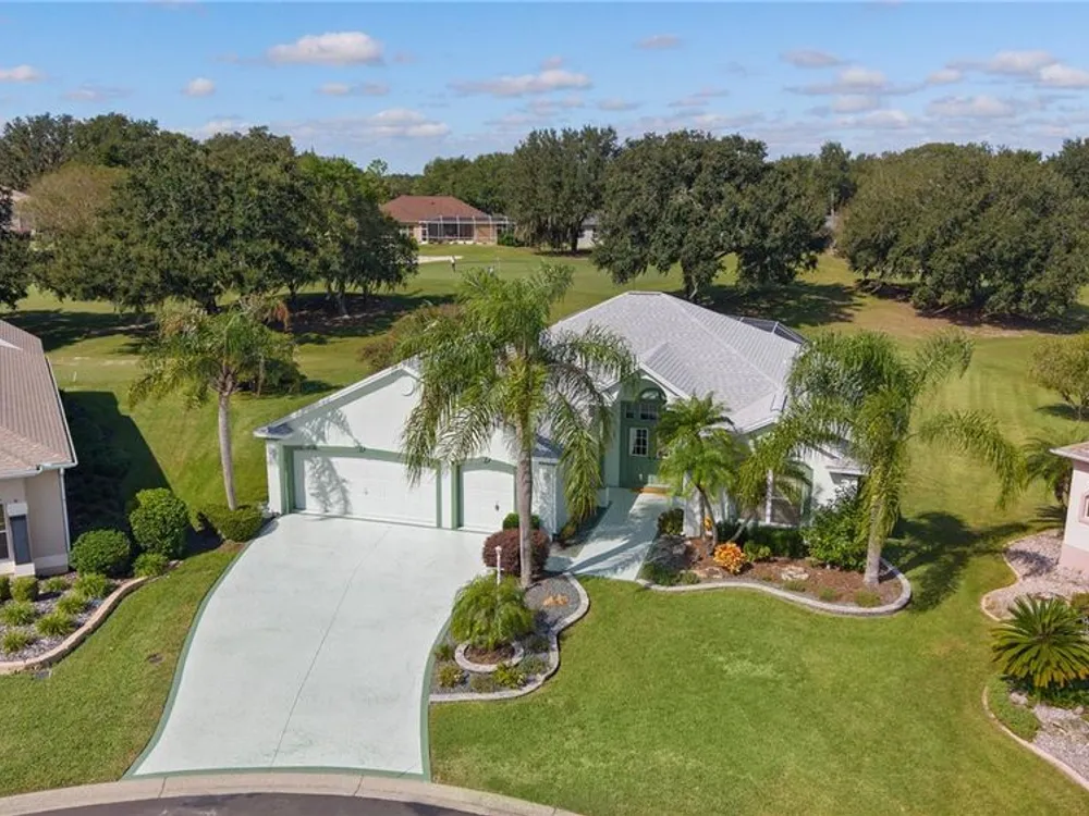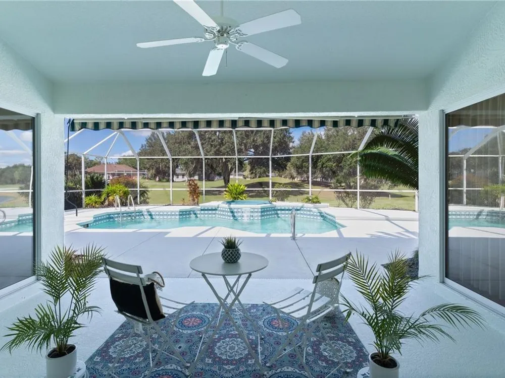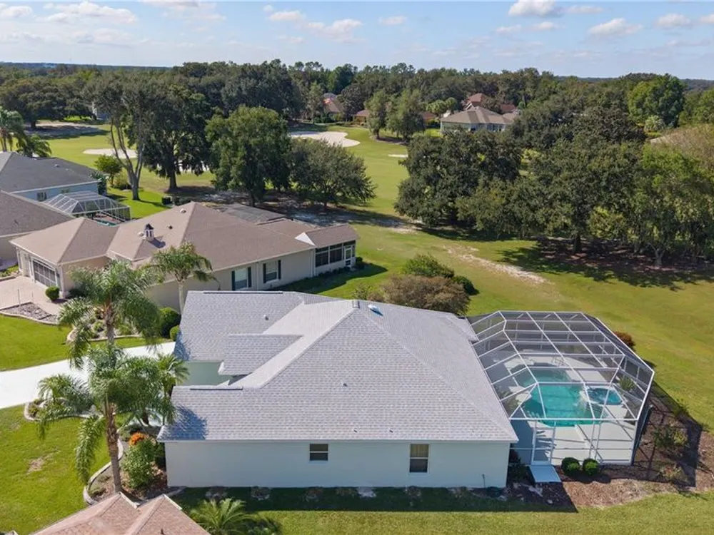 Welcome home to this gorgeous Golf Front Home on the second hole of the Tierra Del Sol Championship Golf Course in The Villages, the world's largest 55+ community. You'll notice the highly desired two car plus golf cart garage, mature landscaping, hardscaping, freshly painted driveway, sidewalk and exterior of the home as you approach with a grand entry through double doors. Once inside, your eyes will be drawn to the stunning golf course and lake views just beyond your private pool and spa under a beautiful birdcage. Natural light floods the interior of the home through multiple windows. High ceilings expand the living area and the freshly painted light and bright walls and painted ceilings allow the natural light to illuminate the entire home beautifully. New, high-end luxury plank flooring adds the simple elegance that makes you feel right at home. The large, eat-in kitchen is bright and airy and provides another stunning view from your breakfast nook with sliding doors giving access to your covered patio and pool deck. Situated off of the kitchen, you'll love this versatile space (formal dining room) with double pocket doors which, due to its privacy, could be used as an additional entertaining space, office space or even a guest bedroom. The possibilities are endless! Your primary bedroom ( located on the opposite side of the home) is expansive and bright with its own grand double door entry. The en-suite bathroom has a large walk-in closet, double sink vanity and stand up shower. Sliding doors allow access and additional light and views to the patio/pool deck. The guest suite is located at the front of the home for maximum privacy with a beautiful window and lots of natural light. The guest bathroom has a tub/shower combo perfect for guests of all ages. The garage floor has a new epoxy coating and the inside laundry room adds convenience. Located on a cul-de-sac with an oversized lot, you'll enjoy the grandeur and privacy. Close to Spanish Springs and Lake Sumter Landing, this location has it all. ROOF is 2022. The BOND is paid. Start living the retirement life you've dreamed of today!