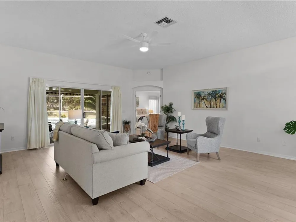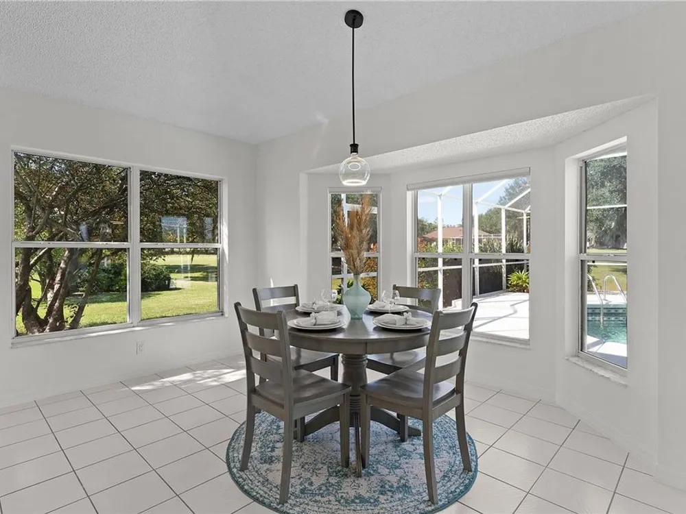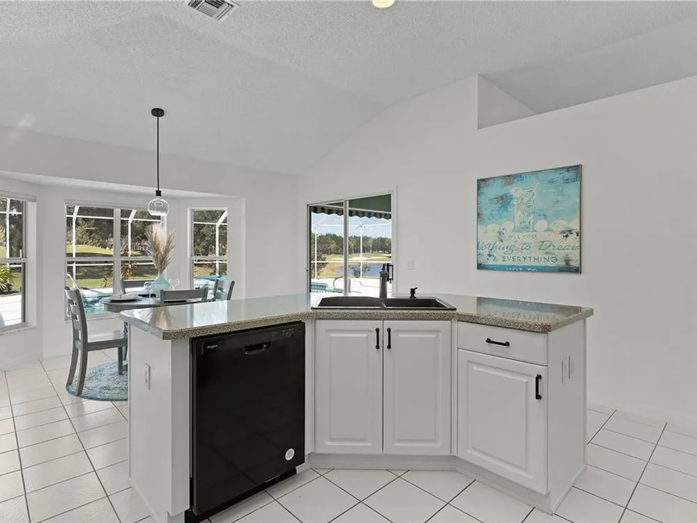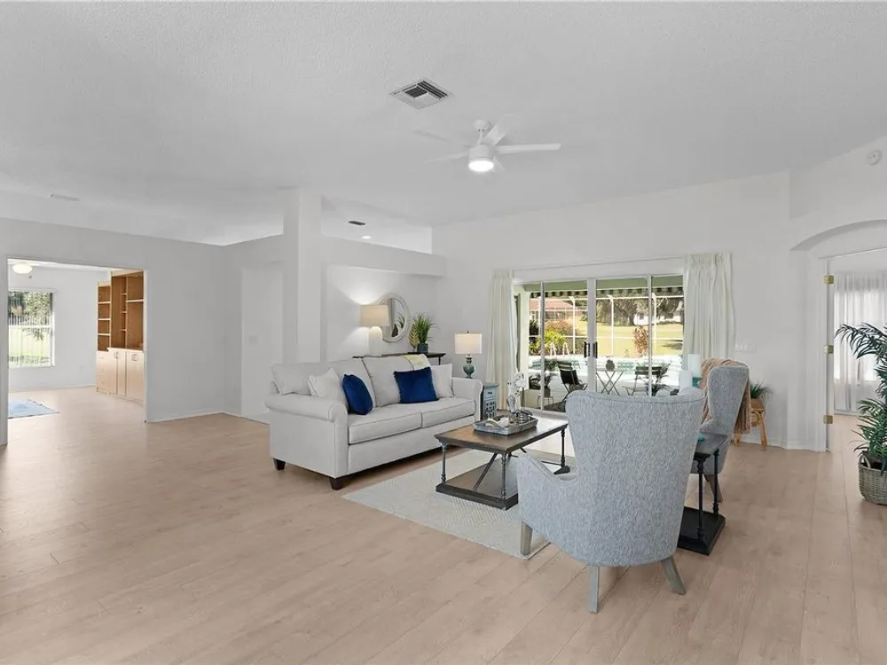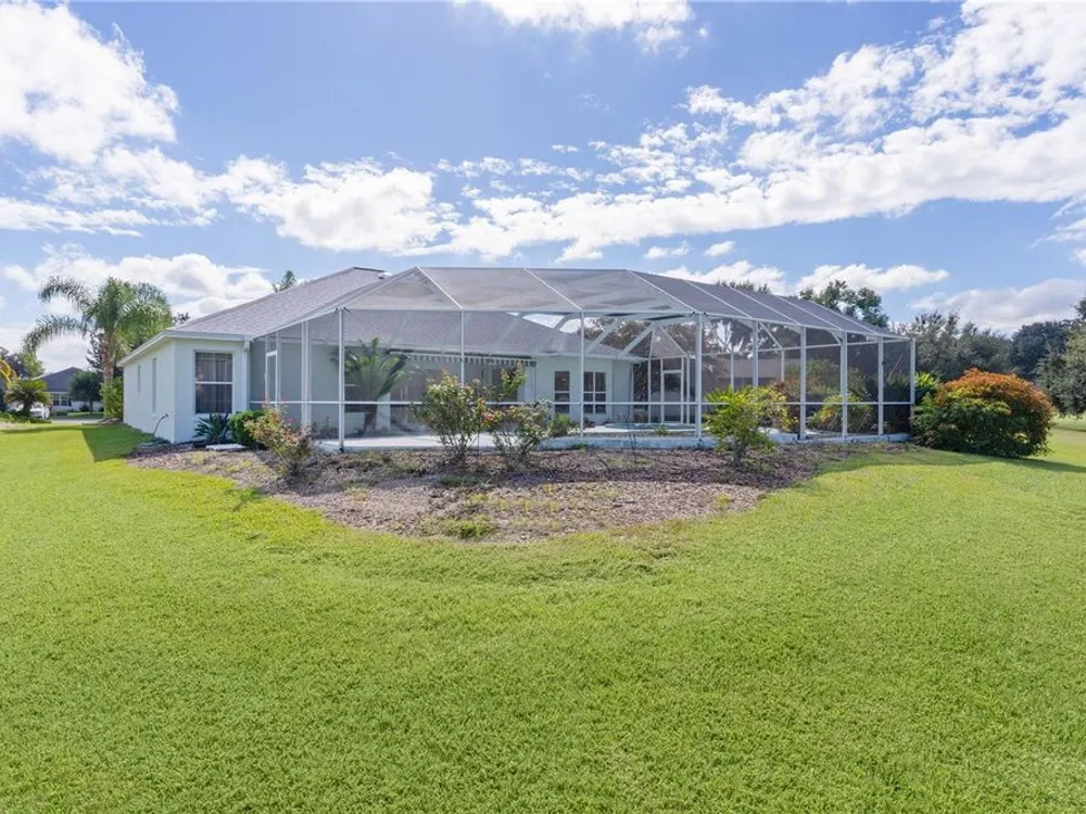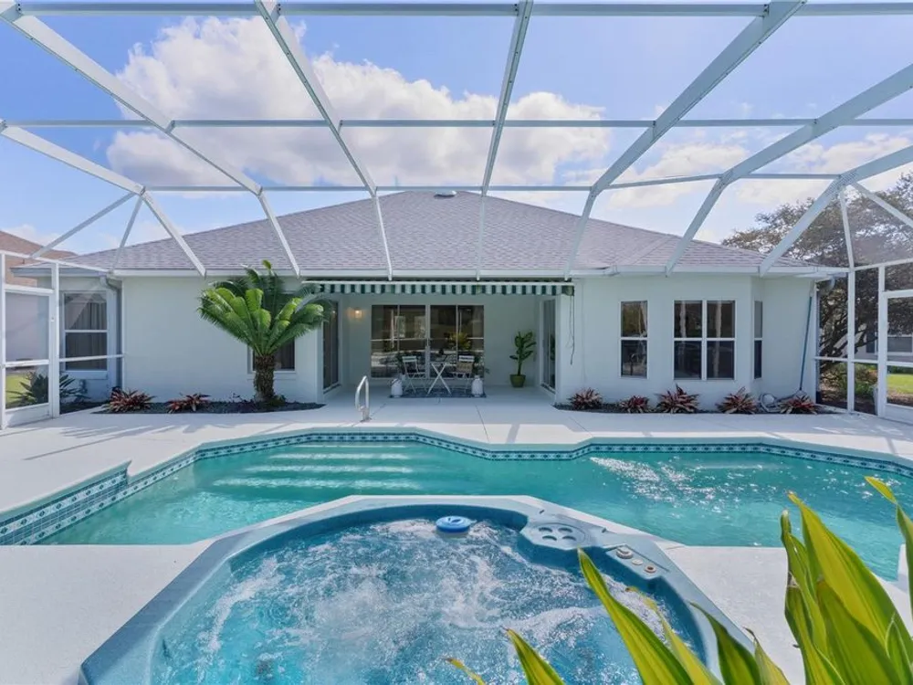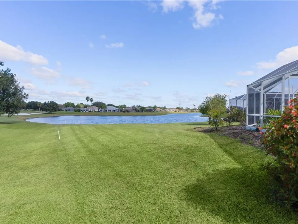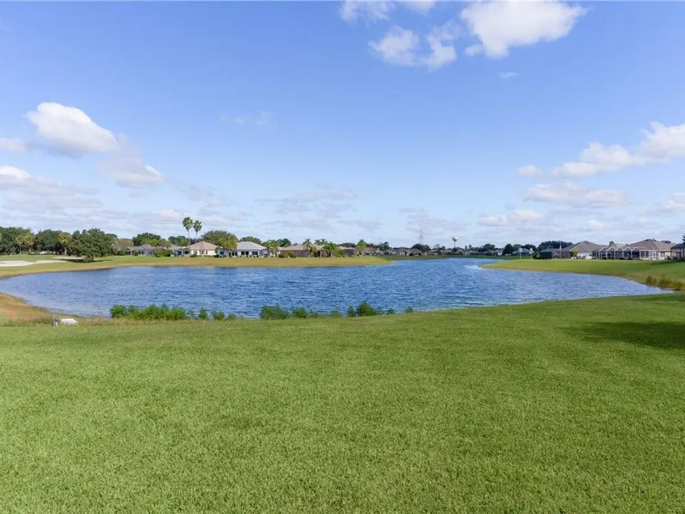 Welcome home to this gorgeous Golf Front Home on the second hole of the Tierra Del Sol Championship Golf Course in The Villages, the world's largest 55+ community. You'll notice the highly desired two car plus golf cart garage, mature landscaping, hardscaping, freshly painted driveway, sidewalk and exterior of the home as you approach with a grand entry through double doors. Once inside, your eyes will be drawn to the stunning golf course and lake views just beyond your private pool and spa under a beautiful birdcage. Natural light floods the interior of the home through multiple windows. High ceilings expand the living area and the freshly painted light and bright walls and painted ceilings allow the natural light to illuminate the entire home beautifully. New, high-end luxury plank flooring adds the simple elegance that makes you feel right at home. The large, eat-in kitchen is bright and airy and provides another stunning view from your breakfast nook with sliding doors giving access to your covered patio and pool deck. Situated off of the kitchen, you'll love this versatile space (formal dining room) with double pocket doors which, due to its privacy, could be used as an additional entertaining space, office space or even a guest bedroom. The possibilities are endless! Your primary bedroom ( located on the opposite side of the home) is expansive and bright with its own grand double door entry. The en-suite bathroom has a large walk-in closet, double sink vanity and stand up shower. Sliding doors allow access and additional light and views to the patio/pool deck. The guest suite is located at the front of the home for maximum privacy with a beautiful window and lots of natural light. The guest bathroom has a tub/shower combo perfect for guests of all ages. The garage floor has a new epoxy coating and the inside laundry room adds convenience. Located on a cul-de-sac with an oversized lot, you'll enjoy the grandeur and privacy. Close to Spanish Springs and Lake Sumter Landing, this location has it all. ROOF is 2022. The BOND is paid. Start living the retirement life you've dreamed of today!