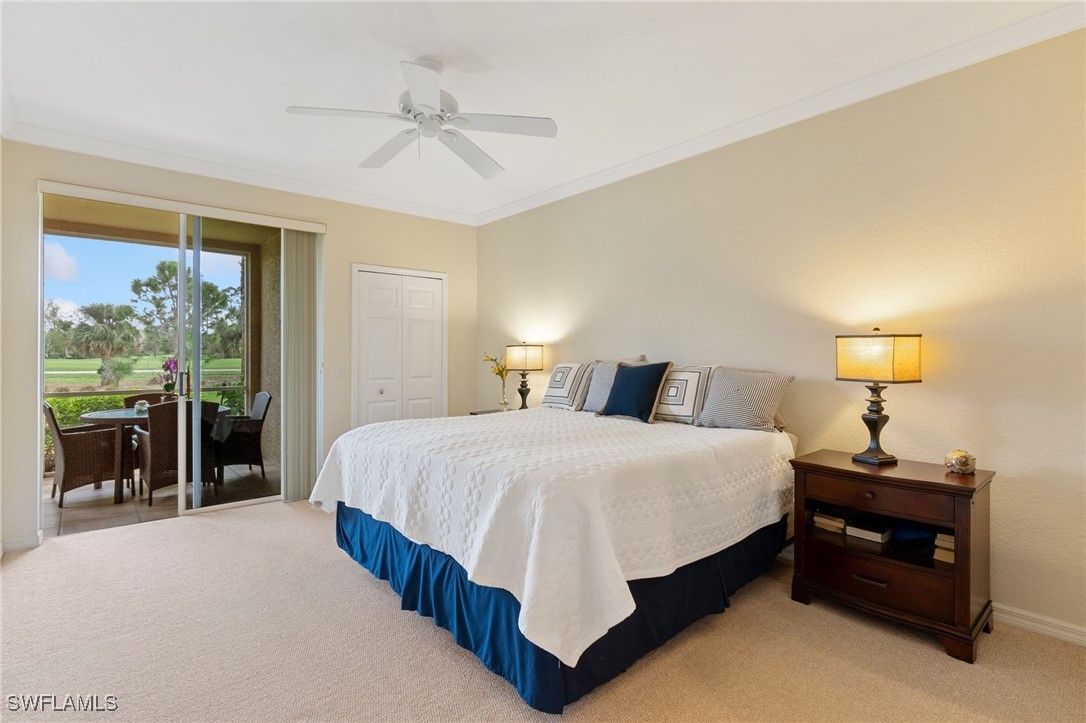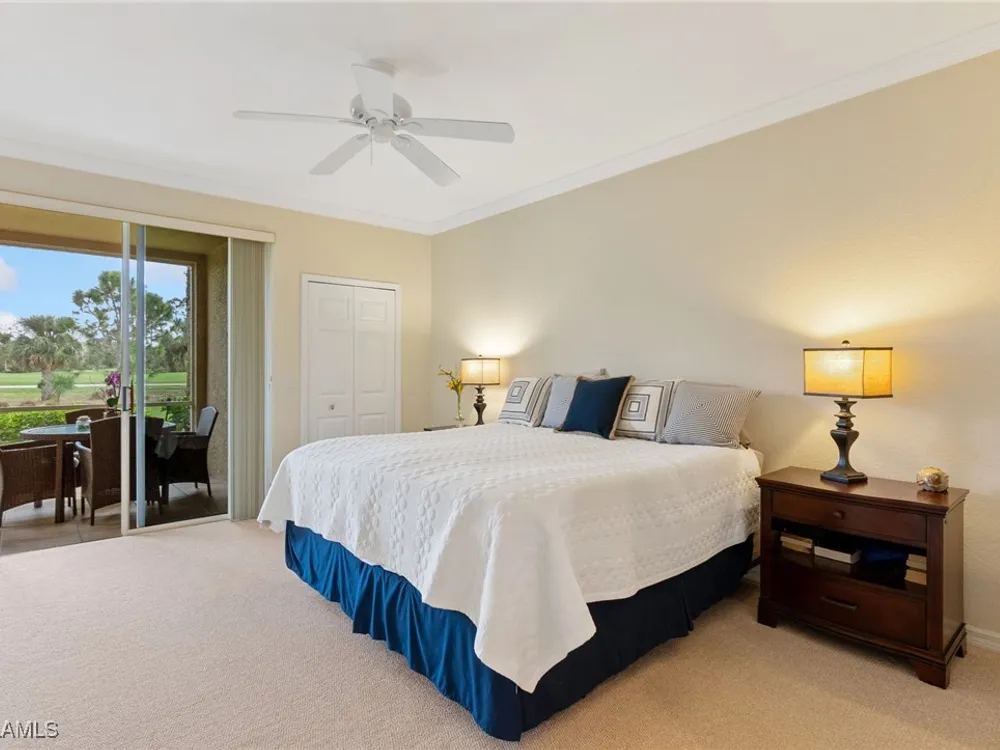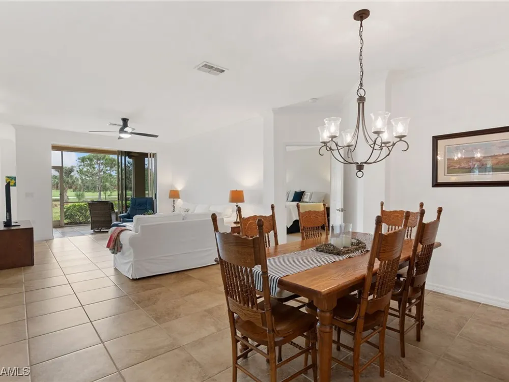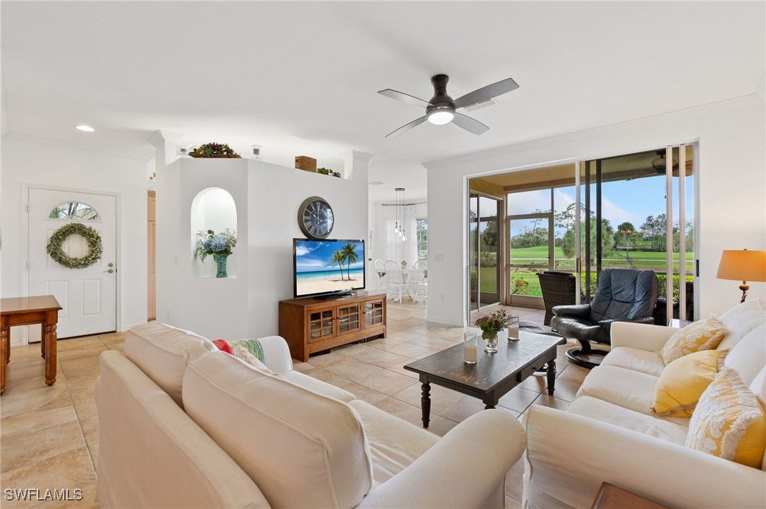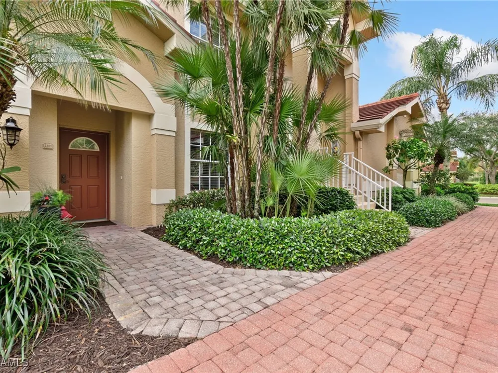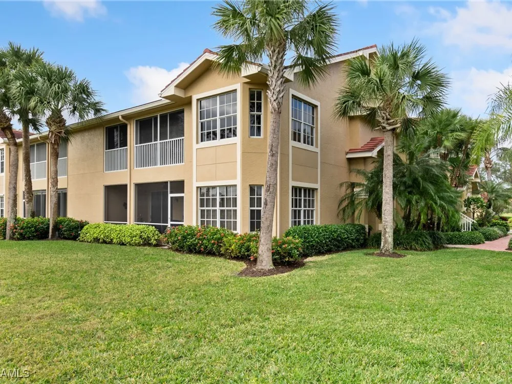 Immaculate 3 bedroom 2 bathroom 2-car attached garage condo located in the popular Grandezza Country Club. Surrounded by natural light, this home benefits from an easternly morning sun exposure with golf course views. The home also features a desirable floor plan with a large entertainment area, private primary suite and separate guest quarters with updated bathrooms. The attached 2 car garage has new epoxy flooring and paved driveway for additional vehicle parking. The screened lanai area offers great views of the golf course and spacious grassed private area. Walking distance from the condo community pool as well as Grandezza's main clubhouse with cabana, Olympic size pool, tennis, bocce, basketball court, fitness/wellness center and fine/casual dining makes this the perfect condo location. Grandezza's Darwin Sharpe III 18-hole Championship golf course currently has full golf memberships available. Conveniently located to I-75, SWFL International Airport and the SWFL beautiful beaches.