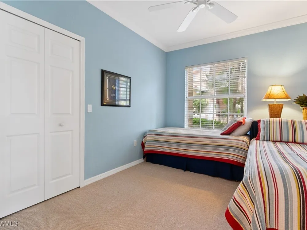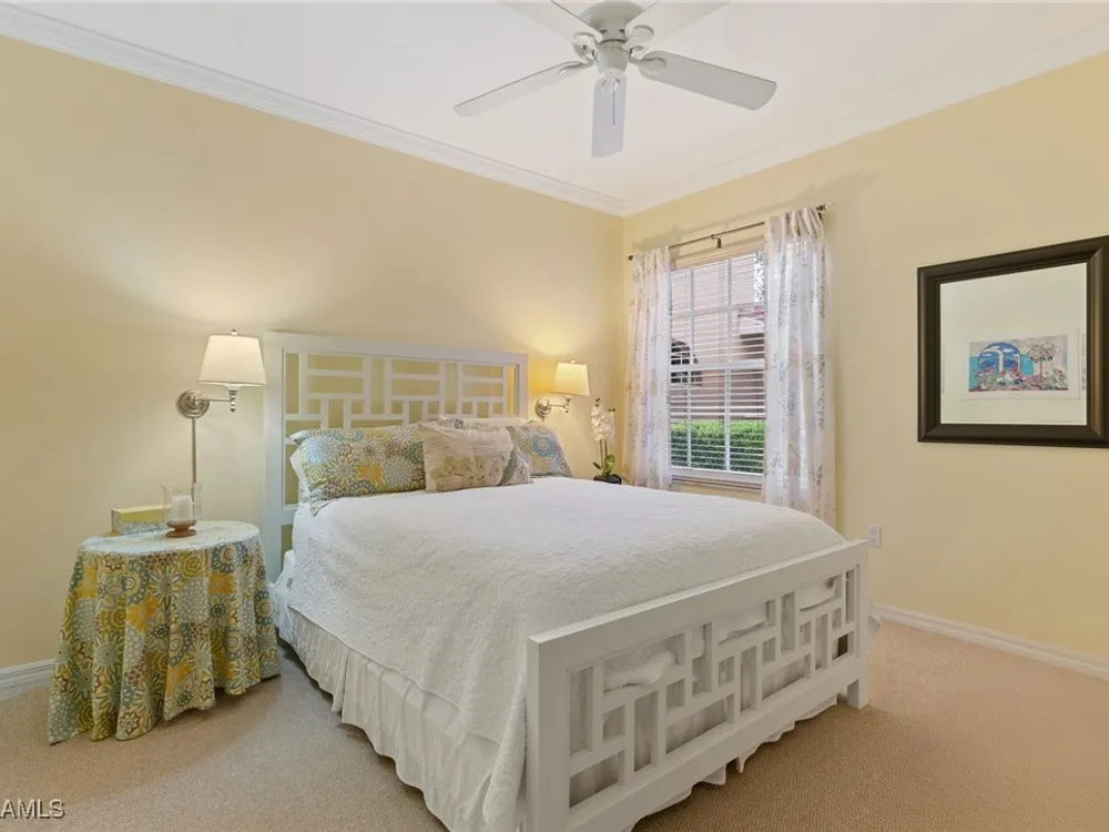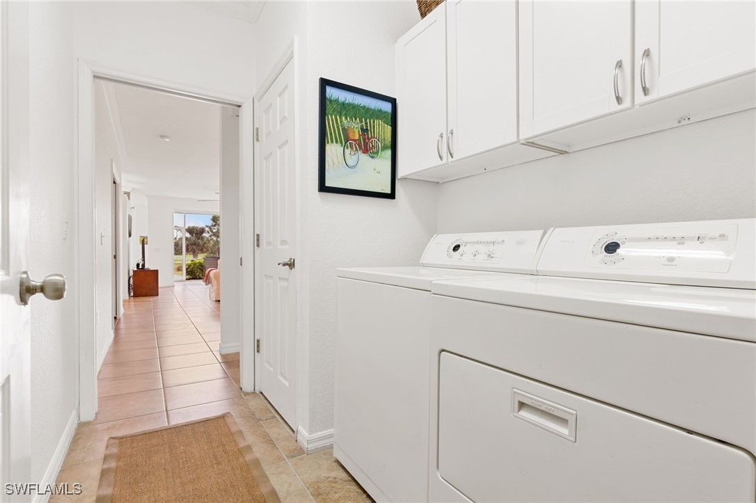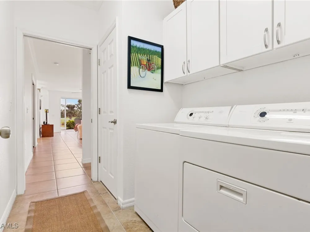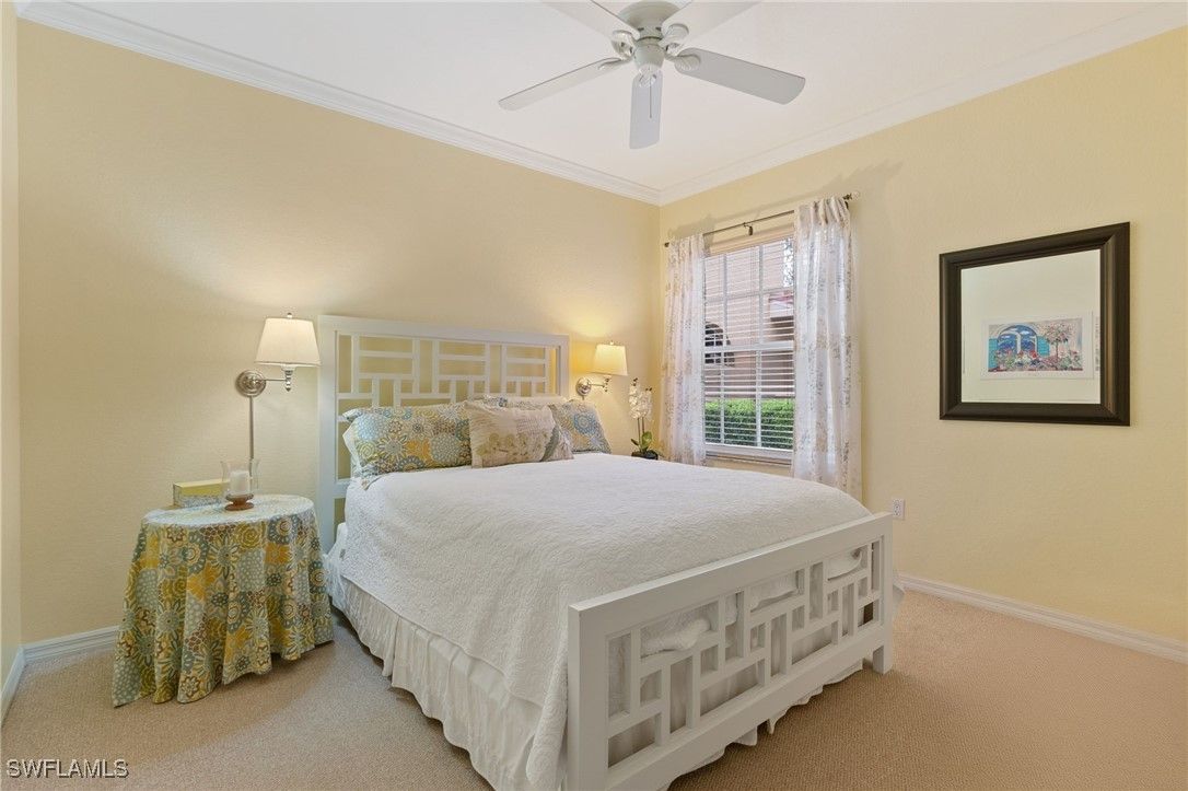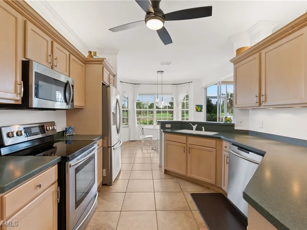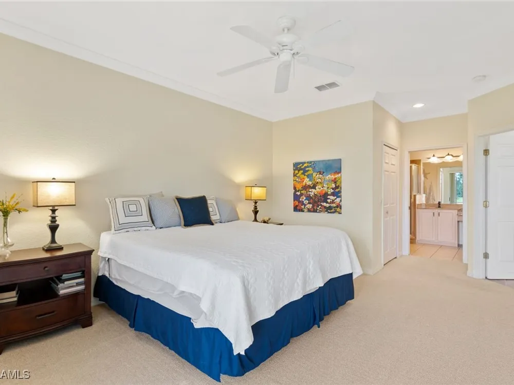 Immaculate 3 bedroom 2 bathroom 2-car attached garage condo located in the popular Grandezza Country Club. Surrounded by natural light, this home benefits from an easternly morning sun exposure with golf course views. The home also features a desirable floor plan with a large entertainment area, private primary suite and separate guest quarters with updated bathrooms. The attached 2 car garage has new epoxy flooring and paved driveway for additional vehicle parking. The screened lanai area offers great views of the golf course and spacious grassed private area. Walking distance from the condo community pool as well as Grandezza's main clubhouse with cabana, Olympic size pool, tennis, bocce, basketball court, fitness/wellness center and fine/casual dining makes this the perfect condo location. Grandezza's Darwin Sharpe III 18-hole Championship golf course currently has full golf memberships available. Conveniently located to I-75, SWFL International Airport and the SWFL beautiful beaches.