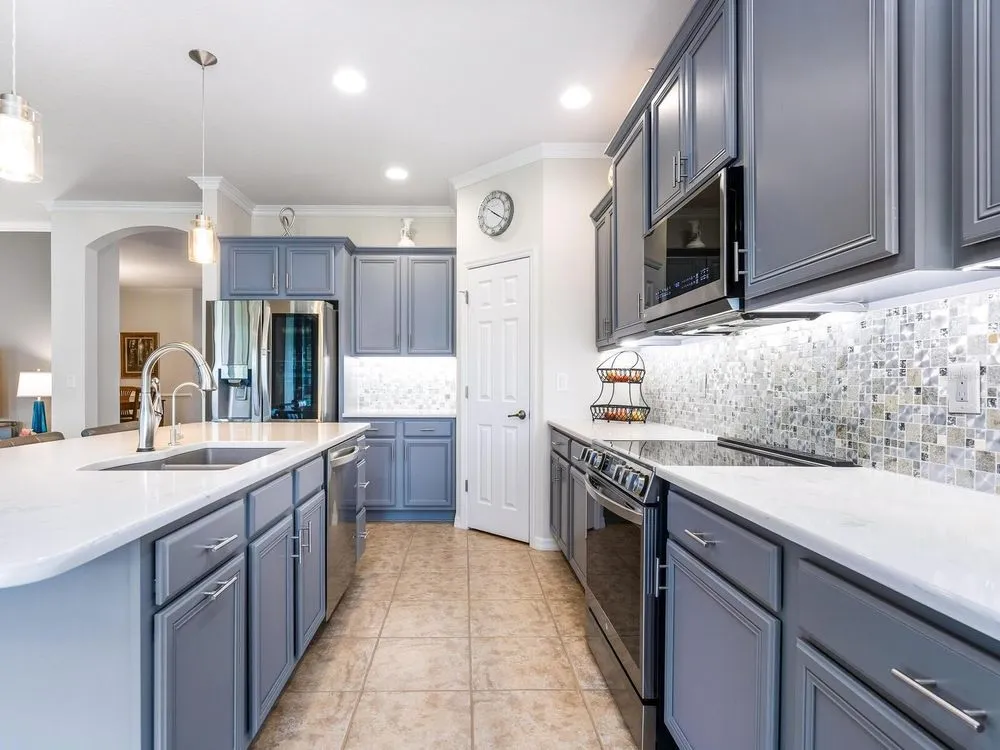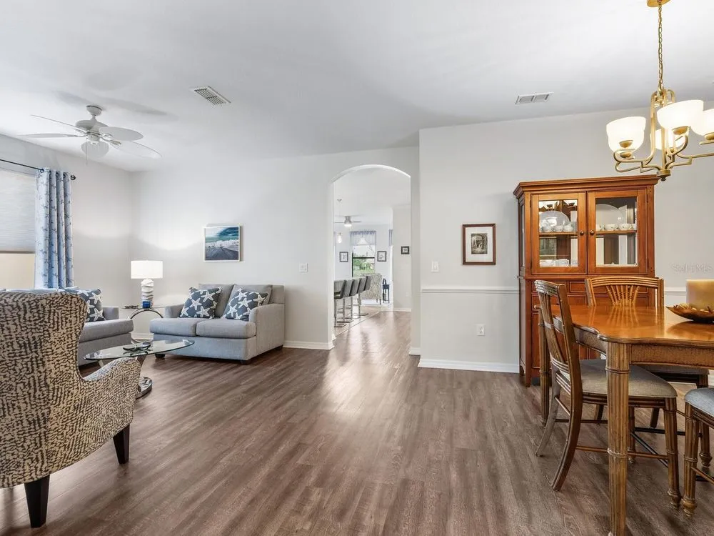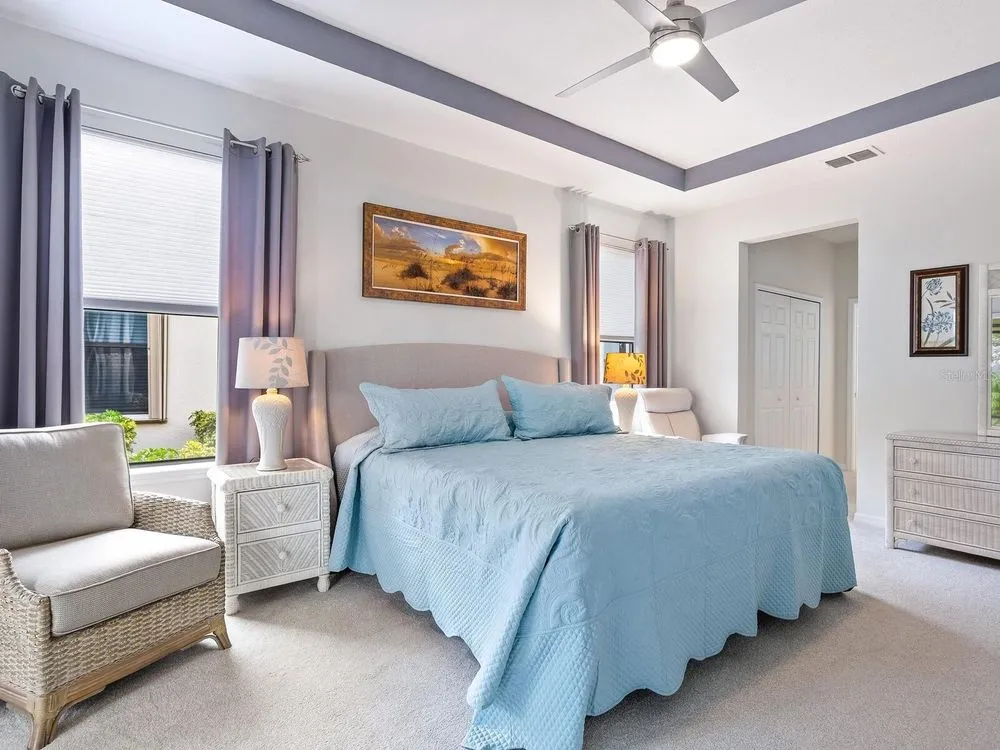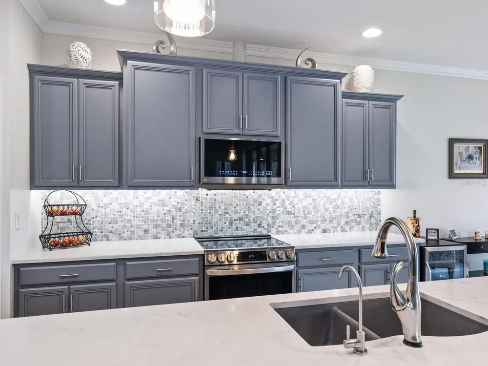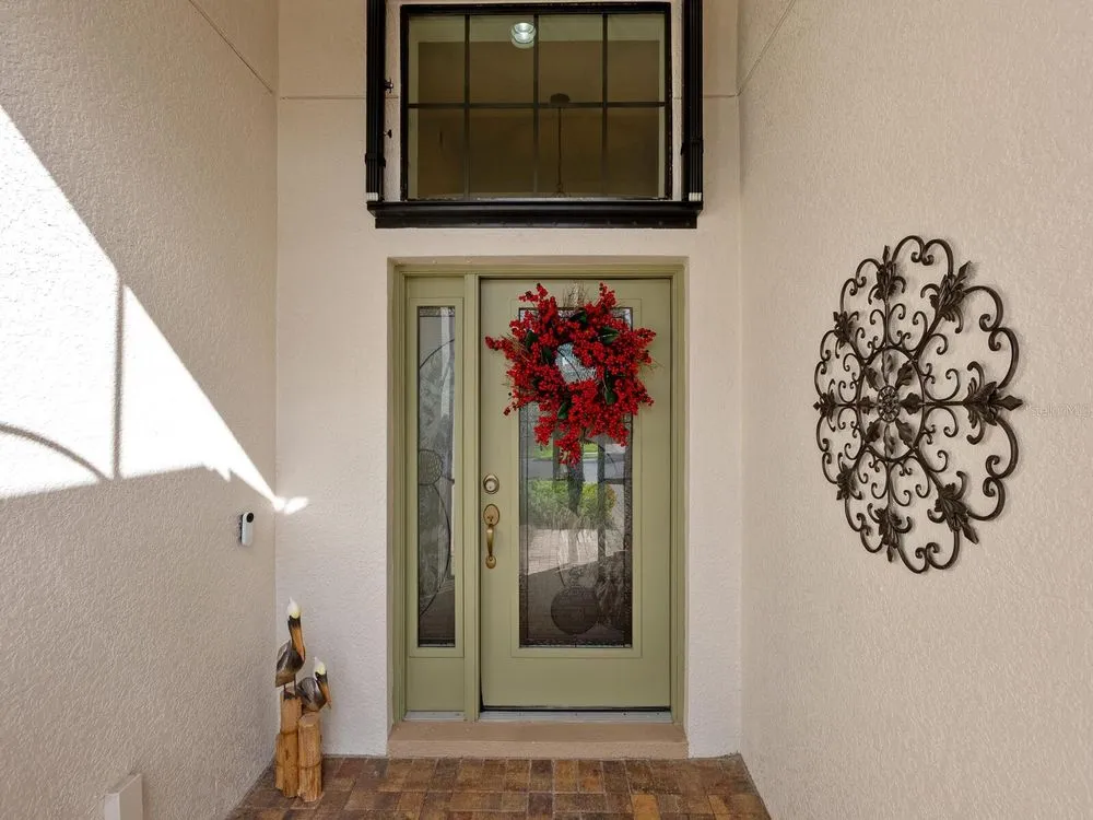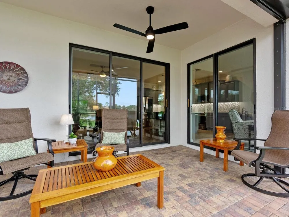 Enjoy lake views and resort-style living in Venetian Falls, Venice’s premier 55+ gated community—just minutes from Gulf beaches, shopping, dining, and the charming historic district! This spacious 3-bedroom Milan model offers a thoughtfully designed open floor plan with separate living, dining, and family rooms, blending elegance with everyday comfort. Enter through the screened front entry into a welcoming foyer featuring a leaded-glass front door with sidelight and transom window. The home showcases floating luxury vinyl flooring in the main living areas. The kitchen features one-level quartz countertops, a stylish mosaic backsplash, solid-wood cabinets with trim, dimmable under-cabinet lighting, stainless-steel appliances including a range with convection and air fryer, and a walk-in pantry. The adjacent bay-shaped sitting room with three windows, captures peaceful lake views. Enjoy outdoor living on the spacious lanai, perfect for dining, grilling, or lounging. For peace of mind, the home includes accordion storm shutters, remote-controlled roll-down storm screens, whole-house water filtration and softener system, and surge protection. The two-car garage features a durable epoxy floor, utility sink, and an extra refrigerator. Wonderful curb appeal! Pavers enhance the driveway, walkway, and lanai. Venetian Falls offers resort-style amenities including a clubhouse with heated lap pool and spa, resistance-walking pool, fitness center, billiard room, bocce courts, full-time activities director, on-site management, and so much more! Lawn care, irrigation, basic cable, and internet are all covered by the reasonable HOA fee. Don’t miss this beautifully maintained home with lake views and luxury upgrades in one of Venice’s most desirable communities!