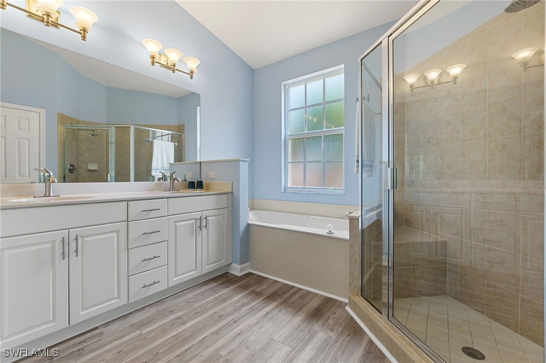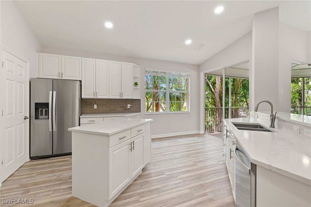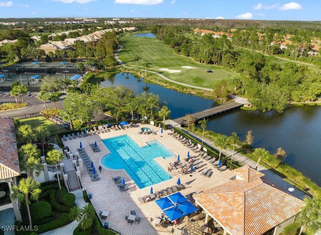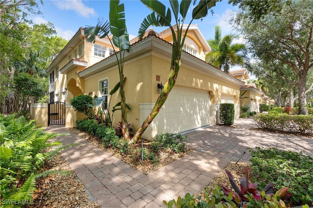 One or more photo(s) has been virtually staged, AI generated or rendered. Beautifully developed and spacious end-unit condo located in the popular Avalon community of Grandezza Country Club. This partially furnished 3 bedroom 2.5 bathroom condo features a light and bright open-concept living, updated kitchen, quartz countertops, luxury vinyl flooring, large attached 2 car garage, storm smart hurricane shutters and an oversized screened wraparound lanai that offers the perfect entertaining space with a tranquil setting that's ideal for year-round outdoor living. Steps from the private Avalon community pool/clubhouse and a short walk to the Grandezza Country Clubhouse. 18-hole Championship golf course, tennis courts, bocce, basketball wellness center and an active social community. Close to I-75, FGCU, SWFL International Airport, shopping and restaurants. Full golf membership available. The additional virtually stage photos are shown to highlight the features of this home.