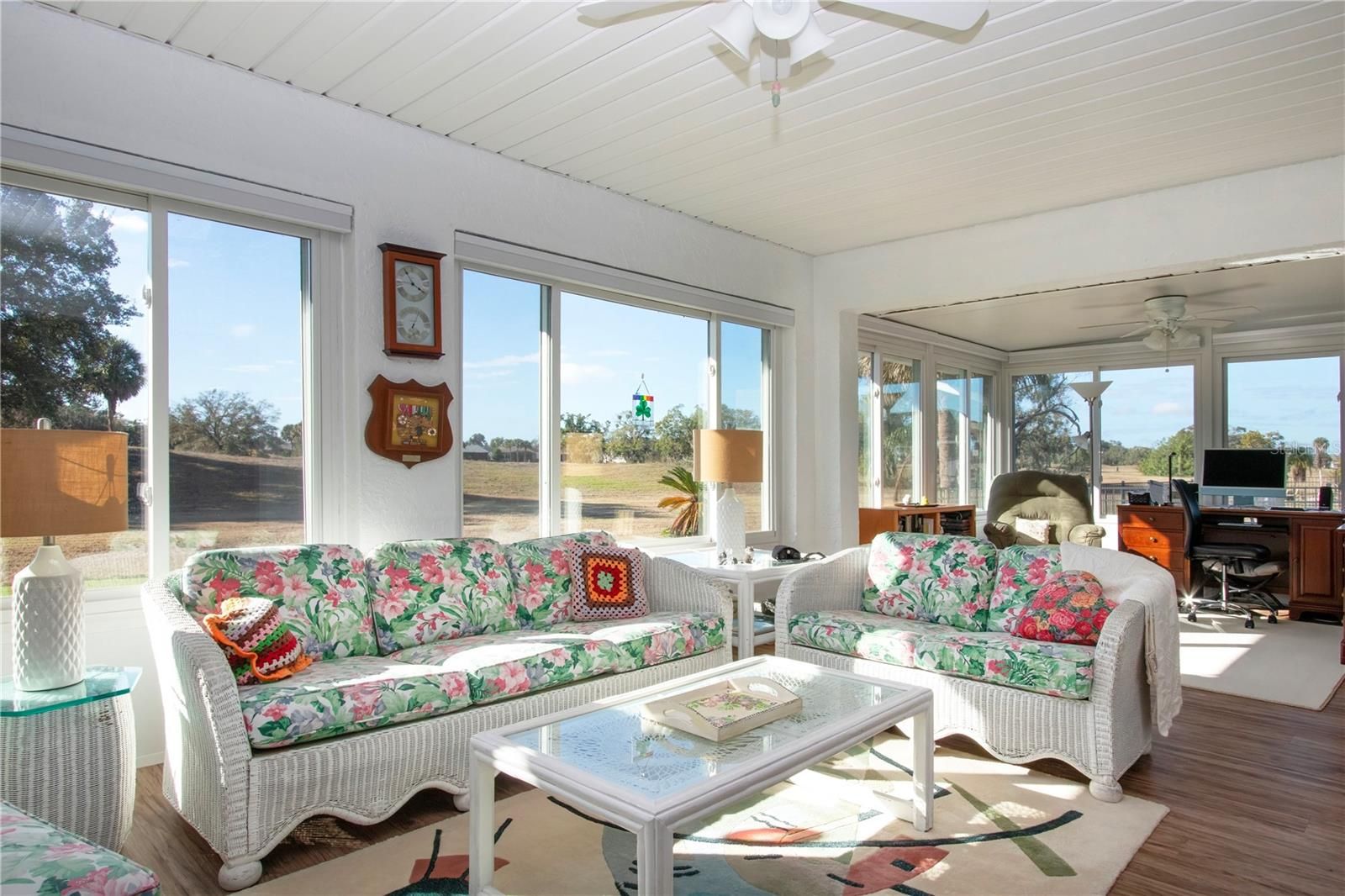 Welcome to this inviting home in Sun City Center, tucked away on a quiet cul-de-sac in the desirable St. Andrew’s neighborhood. Situated on a generous lot with no backyard neighbors, this beautifully maintained residence offers both privacy and a warm, comfortable floor plan designed for easy Florida living. A charming screened porch welcomes you — the perfect place to enjoy your morning coffee or unwind at the end of the day. Inside, the spacious living room features attractive laminate flooring and flows seamlessly into a bright 12x12 dining area, conveniently located just off the efficiently designed kitchen. The kitchen provides abundant cabinetry and generous counter space, making meal preparation both practical and enjoyable. Just beyond the kitchen is a large utility room complete with washer and dryer, scrub sink, and additional counter space for hobbies or projects. The full two-car garage includes a complete wall of storage and an extra refrigerator — ideal for organization and convenience. The comfortable family room opens into a huge enclosed lanai that runs the full length of the home. This under-air space offers endless possibilities — a den, computer room, hobby space, or creative studio. With its pretty, private view and no rear neighbors, it truly feels like a peaceful retreat. Electronic programmable blinds allow you to adjust natural light throughout the day with ease, adding both comfort and ambiance to this remarkable space. The primary suite features an updated ensuite bath complete with a heated towel rack for a touch of everyday luxury. Thanks to the highly desirable split-bedroom floor plan, guests will appreciate their own private bedroom and adjacent full bath with tub and shower. Located near churches, restaurants, and shopping, this well-cared-for home offers the perfect blend of privacy, flexibility, and relaxed Florida living.