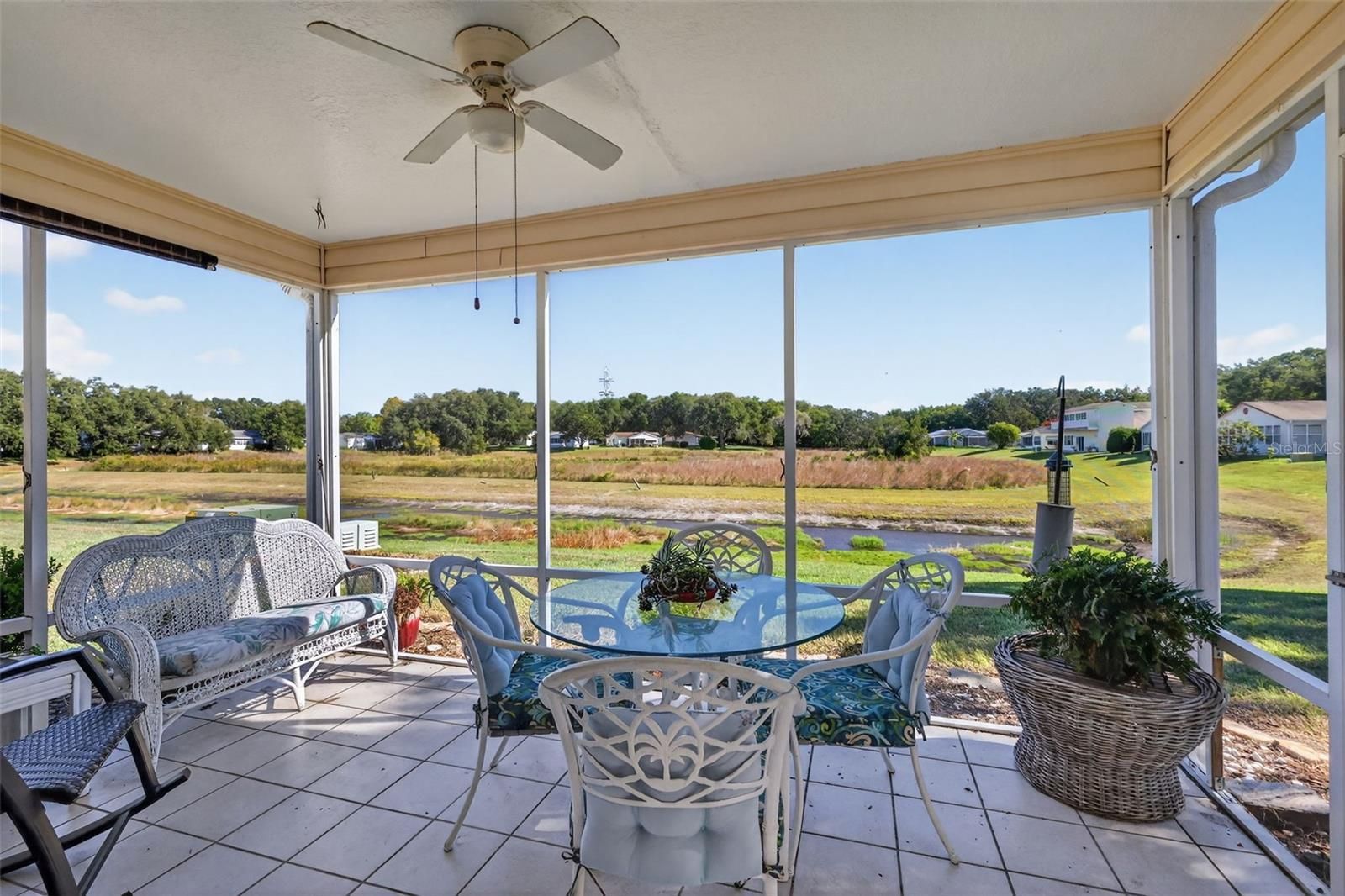 OVERLOOK PEACEFUL WATER and PRESERVE VIEWS in this FANTASTIC, TURNKEY 3/2 Amarillo with SCREENED LANAI and REAR PATIO - CONVENIENTLY LOCATED near BOTH Spanish Springs Town Square and Lake Sumter Landing in the highly sought after Village of Rio Ponderosa! BOND PAID! As you approach this BEAUTIFUL home, you will be greeted by STONED landscaping beds, and a QUAINT FRONT PORCH - the perfect spot to RELAX and ENJOY the WONDERFUL Florida weather! Step inside and experience the SPECTACULAR OPEN CONCEPT LAYOUT where the living, dining, and kitchen areas seamlessly connect to the SPACIOUS SCREENED LANAI with TILE flooring. This inviting OUTDOOR RETREAT overlooks LUSH PRESERVE and TRANQUIL WATER VIEWS offering EXCEPTIONAL PRIVACY and PICTURESQUE SCENERY year-round! Wake up with your morning coffee as you TAKE IN SERENE SUNRISES, or ENTERTAIN friends and family by this GORGEOUS setting in the evenings! Back inside, RICH, WOOD-GRAIN, LUXURY VINYL PLANK flooring graces the SPACIOUS main living area. Large windows and SLIDING GLASS DOORS fill the living spaces with NATURAL LIGHT and frame the BEAUTIFUL PRESERVE and WATER backdrop. The AMAZING kitchen boasts OAK cabinetry, ELEGANT GRANITE countertops, TILE backsplash, and STAINLESS refrigerator and range. The primary bedroom offers a LARGE WINDOW and GENEROUS WALK-IN closet. It’s EN-SUITE bathroom boasts a GORGEOUS BOMBAY-STYLE DOUBLE vanity, TILED WALK-IN shower, and a LINEN closet. Designed for privacy, the SPLIT FLOOR PLAN creates a SEPARATE GUEST WING with two additional bedrooms across the home, each featuring built-in closets. The second bathroom is thoughtfully appointed with a WHITE vanity, CONVENIENT WALK-IN tub and shower combination, LINEN closet, and an ADDITIONAL hallway LINEN closet for extra storage. A centrally-located INTERIOR LAUNDRY room with WHITE CABINETRY and a built-in UTILITY SINK provides both functionality and convenience. Directly off of the laundry room you will find the SPACIOUS two-car garage offering STORAGE shelving, and an attic access with stairs. DON’T MISS YOUR OPPORTUNITY to make this INCREDIBLE HOME YOUR OWN! The Village of Rio Ponderosa is IDEALLY LOCATED near BOTH Spanish Springs Town Square and Lake Sumter Landing; Tierra Del Sol and La Hacienda Recreation Centers, Country Clubs, and Championship Golf Courses; multiple swimming pools and pickle ball; and 466 with abundant shopping, restaurants, banking, medical, and more! PLEASE WATCH OUR WALKTHROUGH VIDEO of this FANTASTIC TURNKEY HOME with GORGEOUS WATER and PRESERVE VIEWS! Call today to schedule your Private Showing or Virtual Tour!