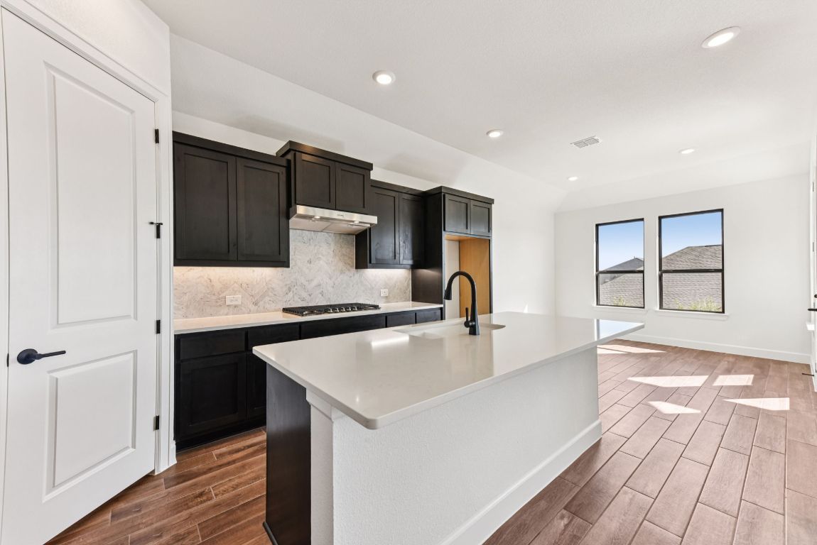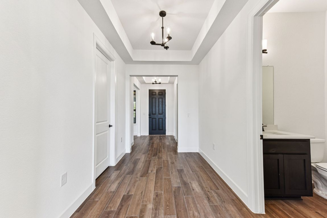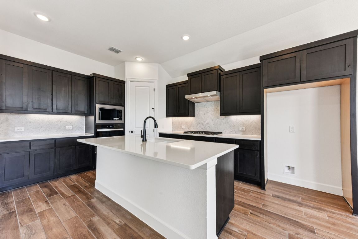 Spelman plan with upgraded kitchen, quartz countertops, tile flooring, optional study with double doors, optional shower in bath 3, optional tray ceilings in entry and foyer, optional cabinets in utility room with sink, upgraded windows to bronze framed, garage interior mounted tankless water heater