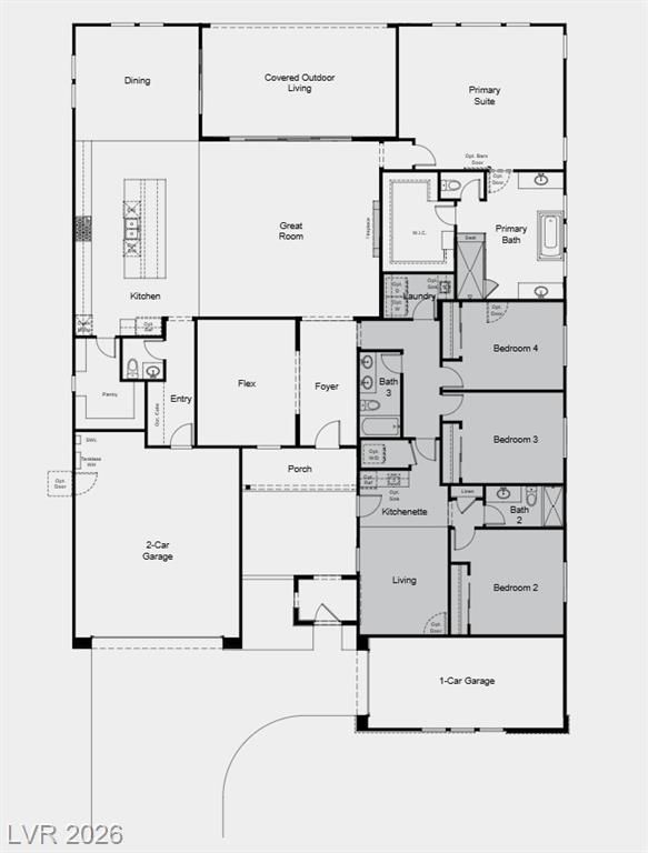 What's Special: Fireplace | No Rear Neighbors | Close to Amenities | Multi-Gen Suite | Covered Patio | Cul-de-Sac Lot. New Construction - Ready Now! Built by America's Most Trusted Home Builder. Welcome to the Lotus at 203 Paraggi Bay Dr in Portofino. This spacious single-story home offers room to grow with three full bathrooms and a half bath. A grand foyer leads to a flex room, two secondary bedrooms with a shared bath, and a private multigenerational suite with its own living area, kitchenette, bedroom, bathroom, and garage. The primary suite features a large walk-in closet and spa-style shower. An open kitchen, dining area, great room, and covered patio complete the home. Additional Highlights include: multi-gen suite, finished garages, primary bath super shower, 15' stacking sliding glass door at great room, 8' sliding glass door at dining area, upgraded kitchen, GE cafe kitchen appliances and cabinets at laundry room.