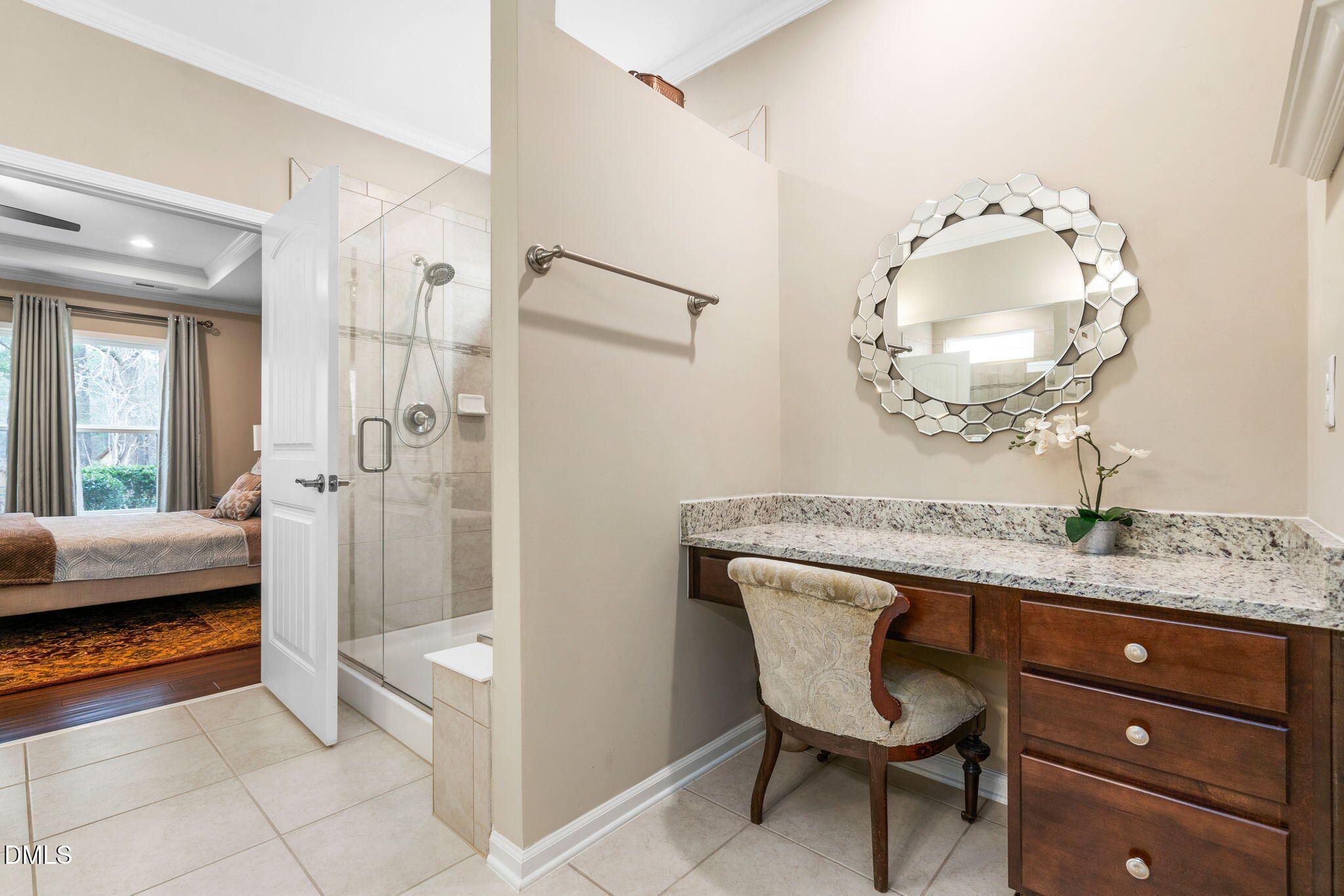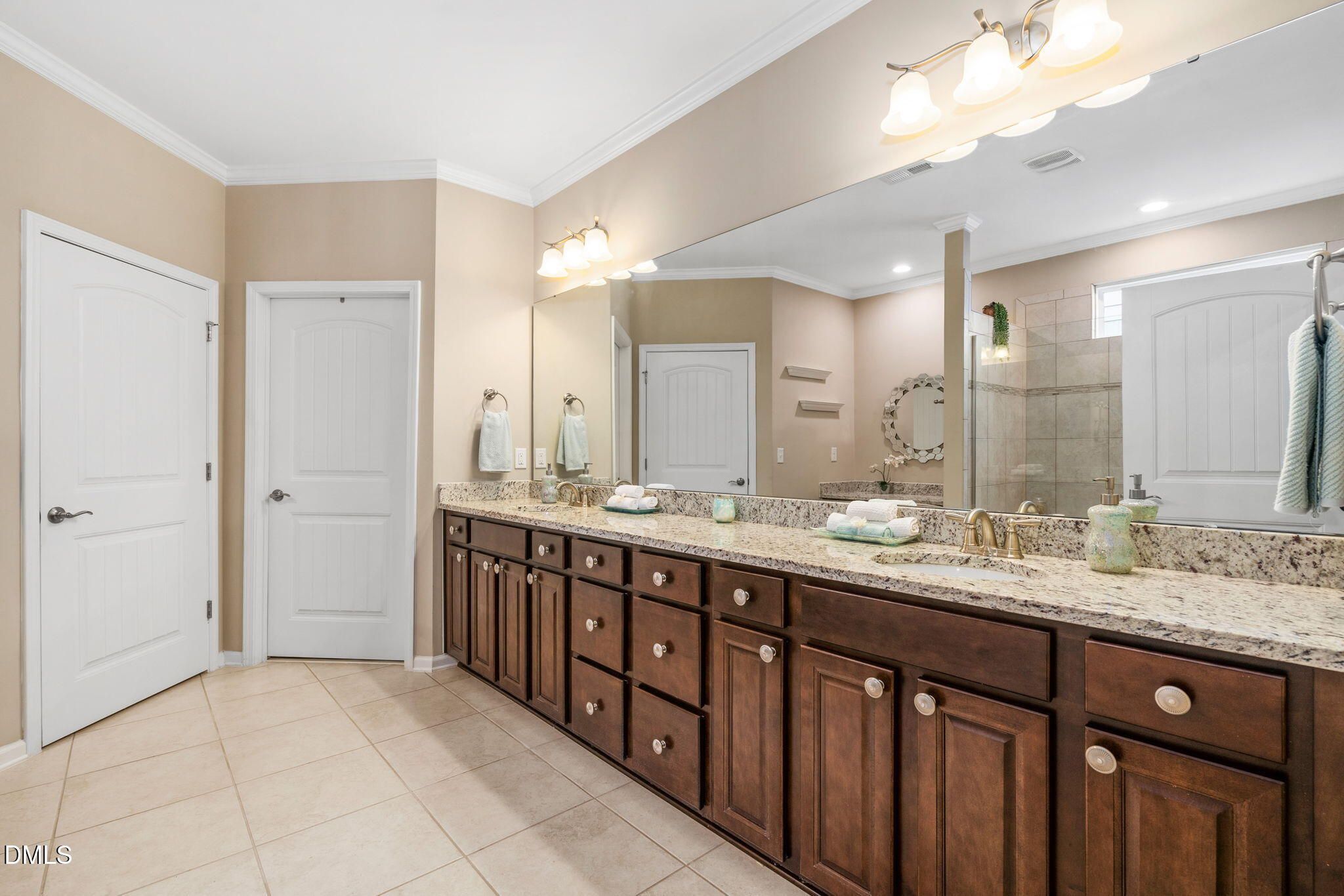 - Chandelier, Crown Molding, L-Shaped Dining Room, Double Vanity, Eat-in Kitchen, Entrance Foyer, Granite Counters, Kitchen Island, Living/Dining Room, Open Floorplan, Pantry, Recessed Lighting, Multiple Primary Suites, Separate Shower, Storage, Walk-In Closet(s), Walk-In Shower, Water Closet(s)