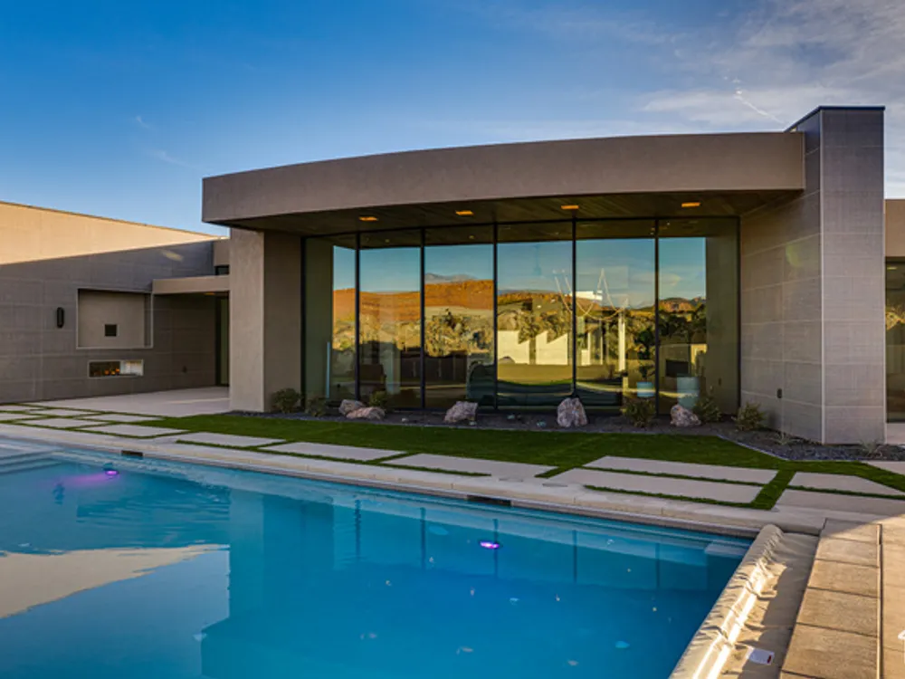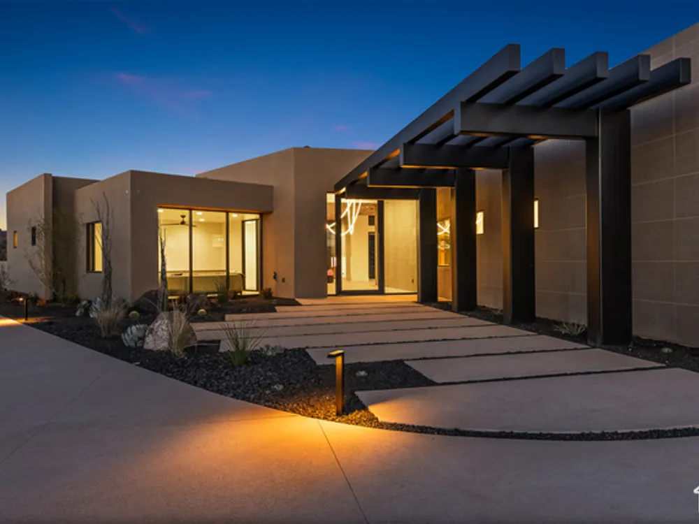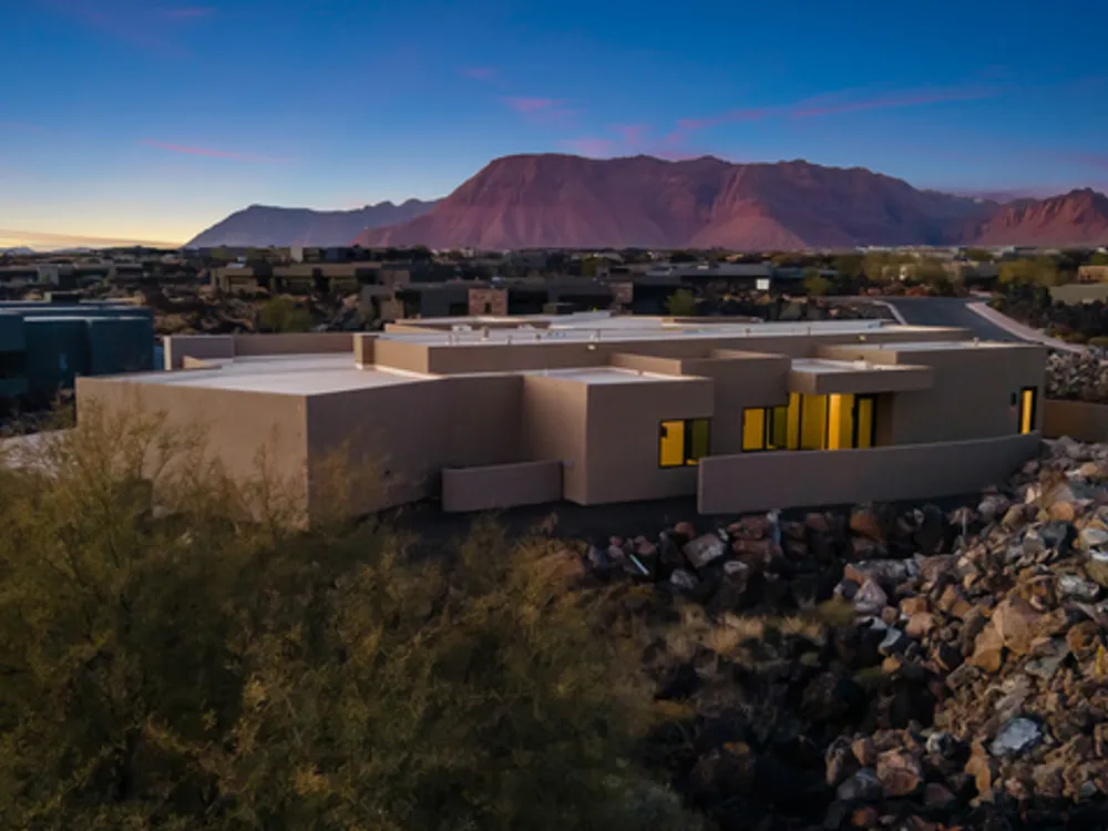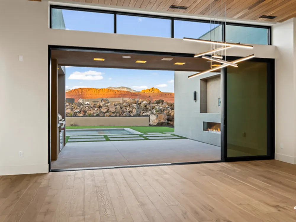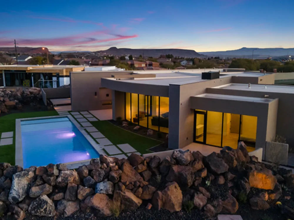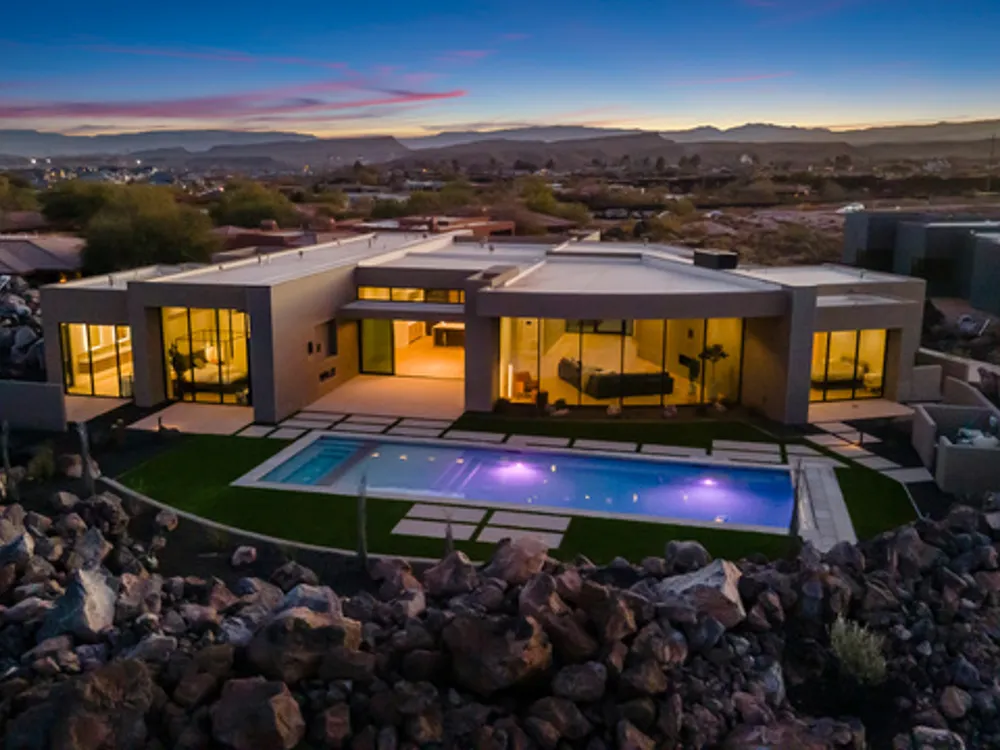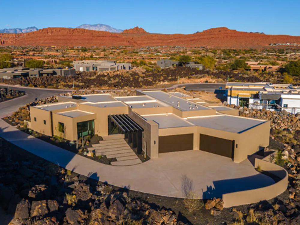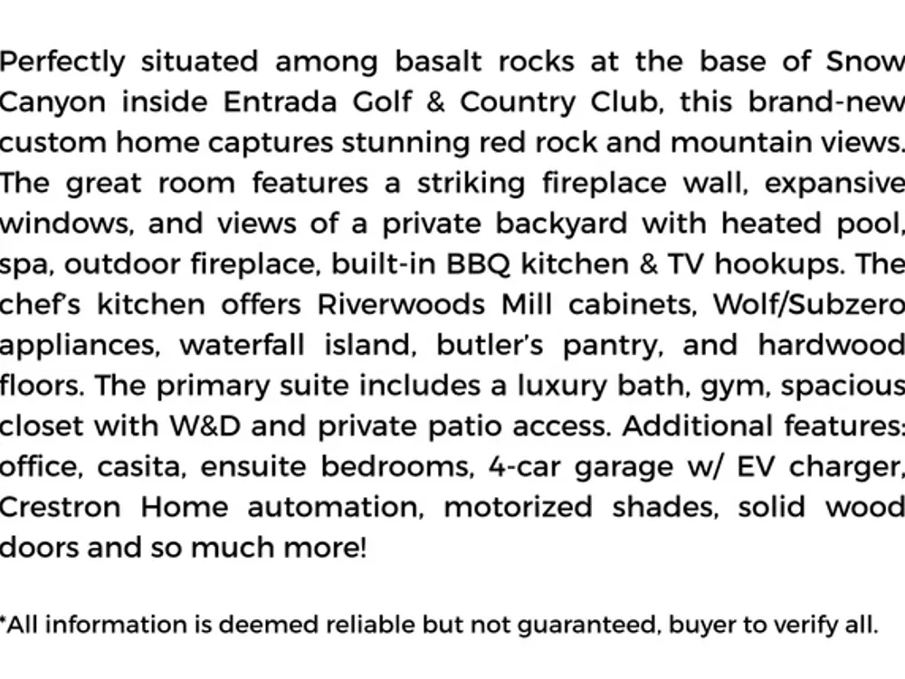 Perfectly situated among basalt rocks at the base of Snow Canyon inside Entrada Golf & Country Club, this brand-new custom home captures stunning red rock and mountain views. The great room features a striking fireplace wall, expansive windows, and views of a private backyard with heated pool, spa, outdoor fireplace, built-in BBQ kitchen & TV hookups. The chef's kitchen offers Riverwoods Mill cabinets, Wolf/Subzero appliances, waterfall island, butler's pantry, and hardwood floors. The primary suite includes a luxury bath, gym, spacious closet with W&D and private patio access. Additional features: office, casita, ensuite bedrooms, 4-car garage w/ EV charger, Crestron Home automation, motorized shades, solid wood doors and so much more! All information is deemed reliable but not guaranteed, buyer to verify all.