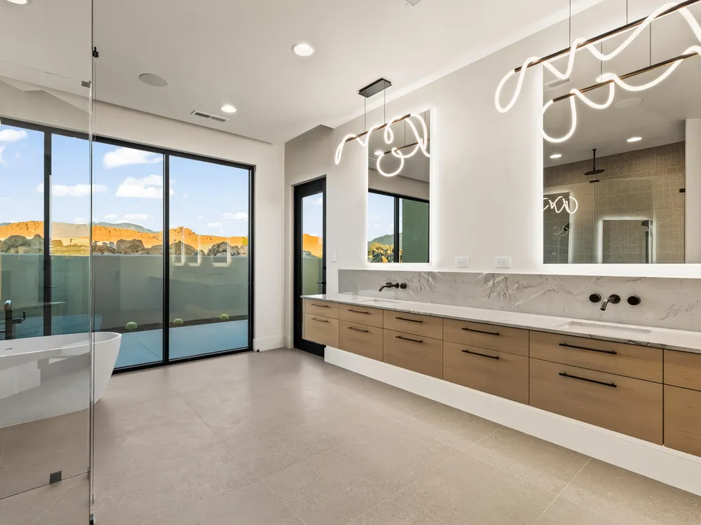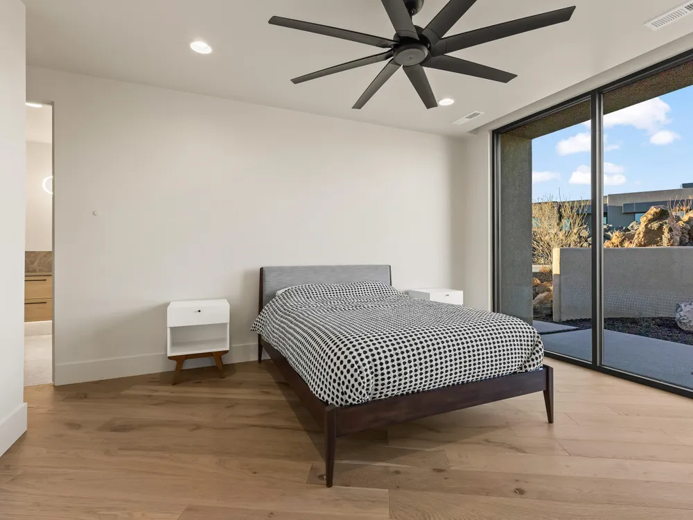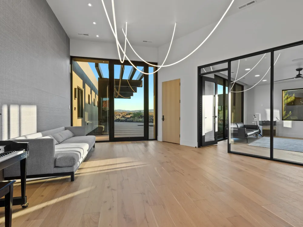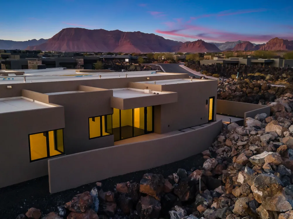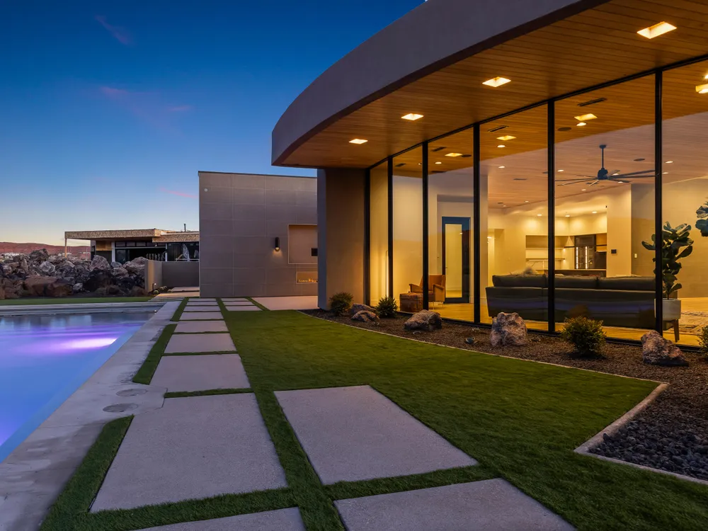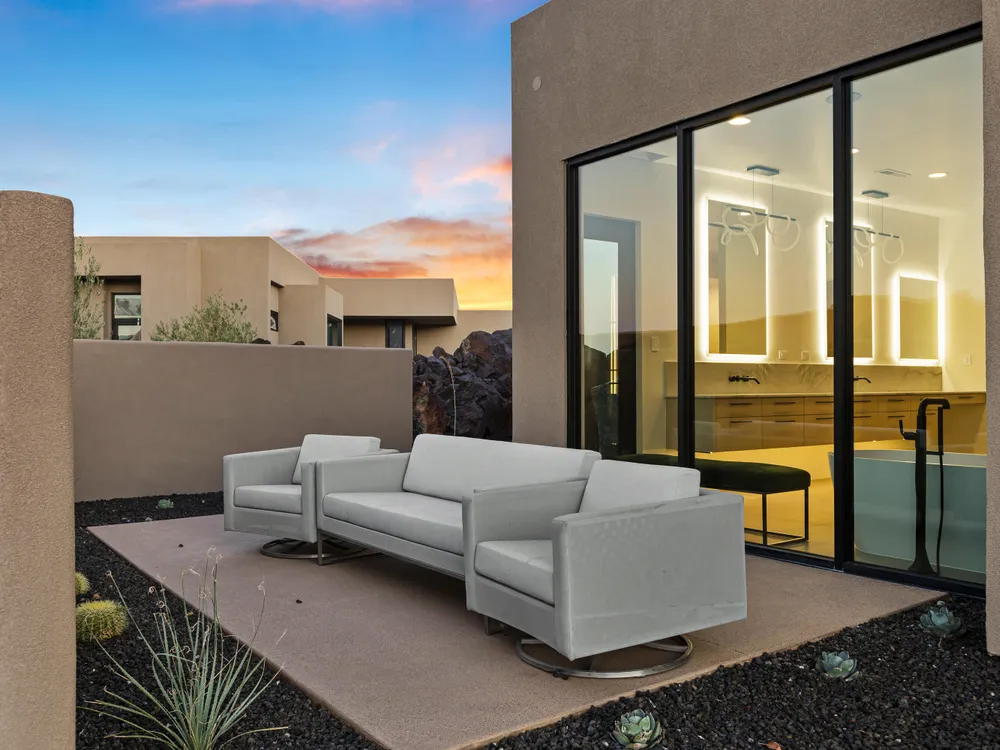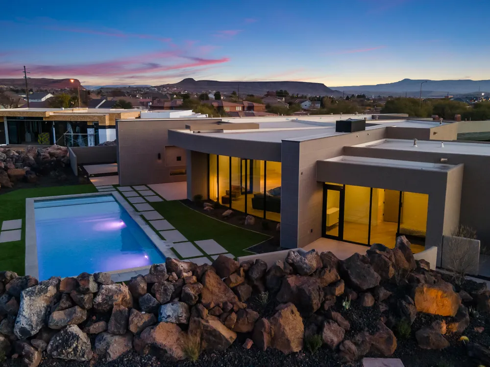 Perfectly situated among basalt rocks at the base of Snow Canyon inside Entrada Golf & Country Club, this brand-new custom home captures stunning red rock and mountain views. The great room features a striking fireplace wall, expansive windows, and views of a private backyard with heated pool, spa, outdoor fireplace, built-in BBQ kitchen & TV hookups. The chef's kitchen offers Riverwoods Mill cabinets, Wolf/Subzero appliances, waterfall island, butler's pantry, and hardwood floors. The primary suite includes a luxury bath, gym, spacious closet with W&D and private patio access. Additional features: office, casita, ensuite bedrooms, 4-car garage w/ EV charger, Crestron Home automation, motorized shades, solid wood doors and so much more! Buyer to verify all information.