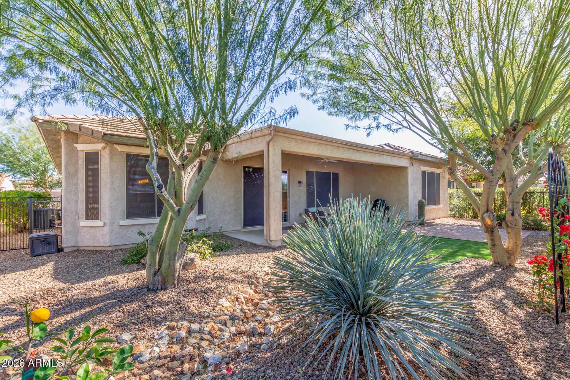 Welcome to easy living in the sought-after 55+ community of Sun City Festival! This gorgeous 2-bedroom home makes a great first impression with a 3-car garage and mature shade trees out front. Inside, you'll find a versatile den, tile flooring in all the right places, and an inviting living room perfect for hosting friends or relaxing in comfort. The kitchen is a dream, featuring stainless steel appliances, wall ovens, granite countertops, a stylish tile backsplash, an abundance of wood cabinetry, and a center island with a breakfast bar ideal for casual dining. Unwind in the spacious primary retreat offering a chic bathroom with dual vanities, a glass-enclosed shower, a soaking tub, and a generous walk-in closet. Out back, enjoy a covered patio, low-maintenance artificial turf... and ample space to sip your favorite beverage and soak up the Arizona sunshine. Residents of Sun City Festival enjoy resort-style amenities including a pool, spa, golf, and so much more. This one is a must-own. Don't miss out!