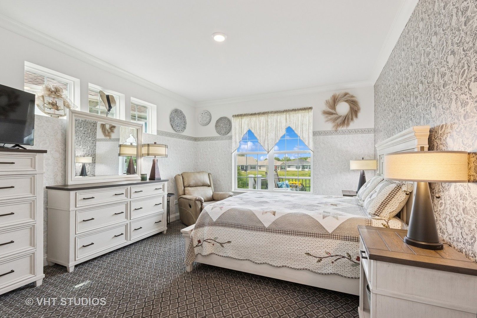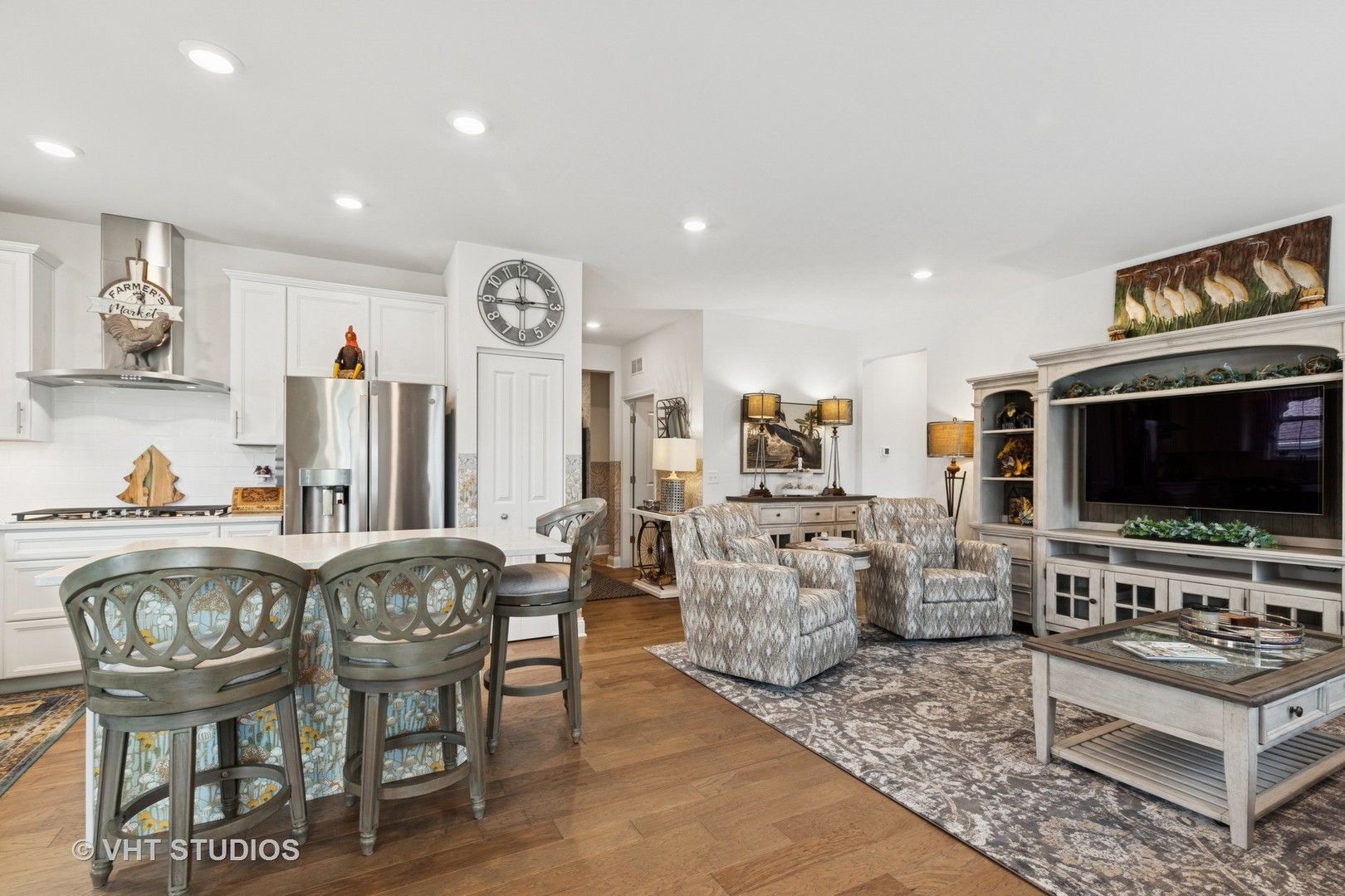 Great news for buyers! This popular 55+ community allows residents ages 45-54 to occupy a home, subject to prior written approval by the HOA manager. HOA details and documentation are included in the Additional Information section. Please check out this beautifully upgraded ranch home is nestled in the sought-after active adult community of Andare at Remington Pointe North and perfectly positioned on one of the most desirable lots in the neighborhood. The home offers breathtaking pond views and an exceptional blend of comfort, style, and smart living. Step inside to find a sun-drenched, open-concept layout that seamlessly connects the family room, dining area, chef-inspired kitchen, and a sunroom designed for ultimate relaxation. The kitchen is a showstopper, featuring dazzling quartz countertops, sleek white 42" cabinets, a classic tile backsplash, stainless steel appliances, and an oversized island with seating for 3-4. Whether you're hosting a dinner party or enjoying a quiet breakfast, the adjacent dining area and sunroom provide the perfect setting with panoramic views of the water just beyond. The private primary suite offers a spacious retreat with tranquil pond views, a large walk-in closet, and a well-appointed en suite bath. Two additional bedrooms, a full hall bath, and a convenient laundry room round out the main floor. Downstairs, the full English basement offers endless possibilities with a finished layout, this includes the 4th bedroom currently used as an office and a newly added half bath (2023), huge lounging area with a flat screen tv and built in fireplace. Plus ample storage space. Step outside to your expansive new Trex deck (2024)-perfect for summer BBQs and sunset lounging-surrounded by lush landscaping completed in 2024. This home is equipped with cutting-edge Smart Home features including a Ring Alarm System, Honeywell Smart Thermostat, Level Invisible Smart Lock, MyQ Garage Control, and a Flo by Moen smart water system. Residents of Andare enjoy resort-style amenities, including a clubhouse with fitness center, walking trails, bocce and pickleball courts, and social activities-all just minutes from shopping, dining, recreation, and transportation. With thoughtful upgrades like new carpet (2023) and driveway seal coated (2024), this home offers turnkey living in a vibrant, well-connected community. *Please see Upgrades and Features Under Additional Information as well as HOA Information.