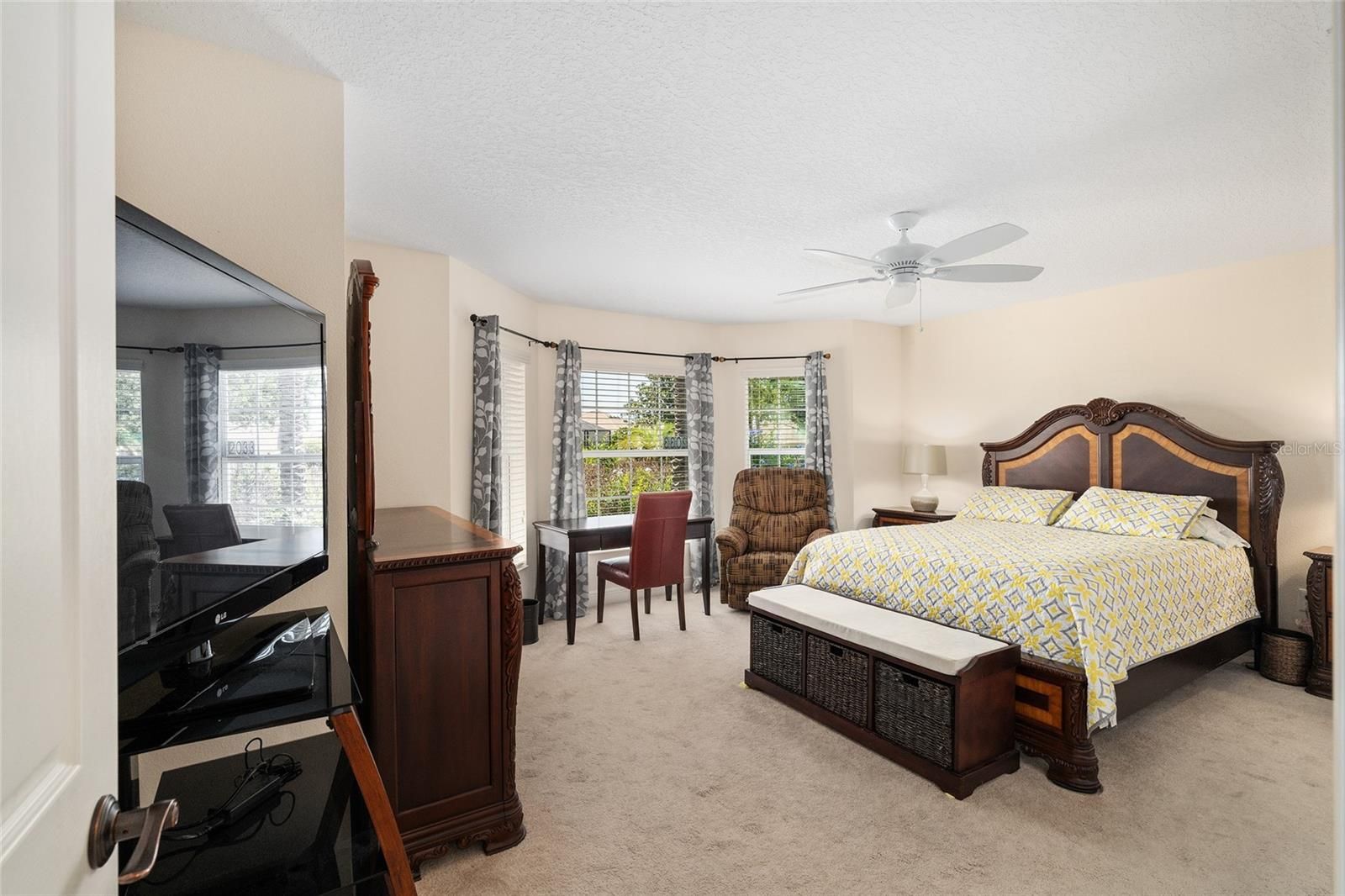 - Ceiling Fan(s), Eat-in Kitchen, High Ceilings, Kitchen/Family Room Combo, Living/Dining Room, Open Floorplan, Main Level Primary, Stone Counters, Thermostat, Vaulted Ceiling(s), Walk-In Closet(s), Window Treatments